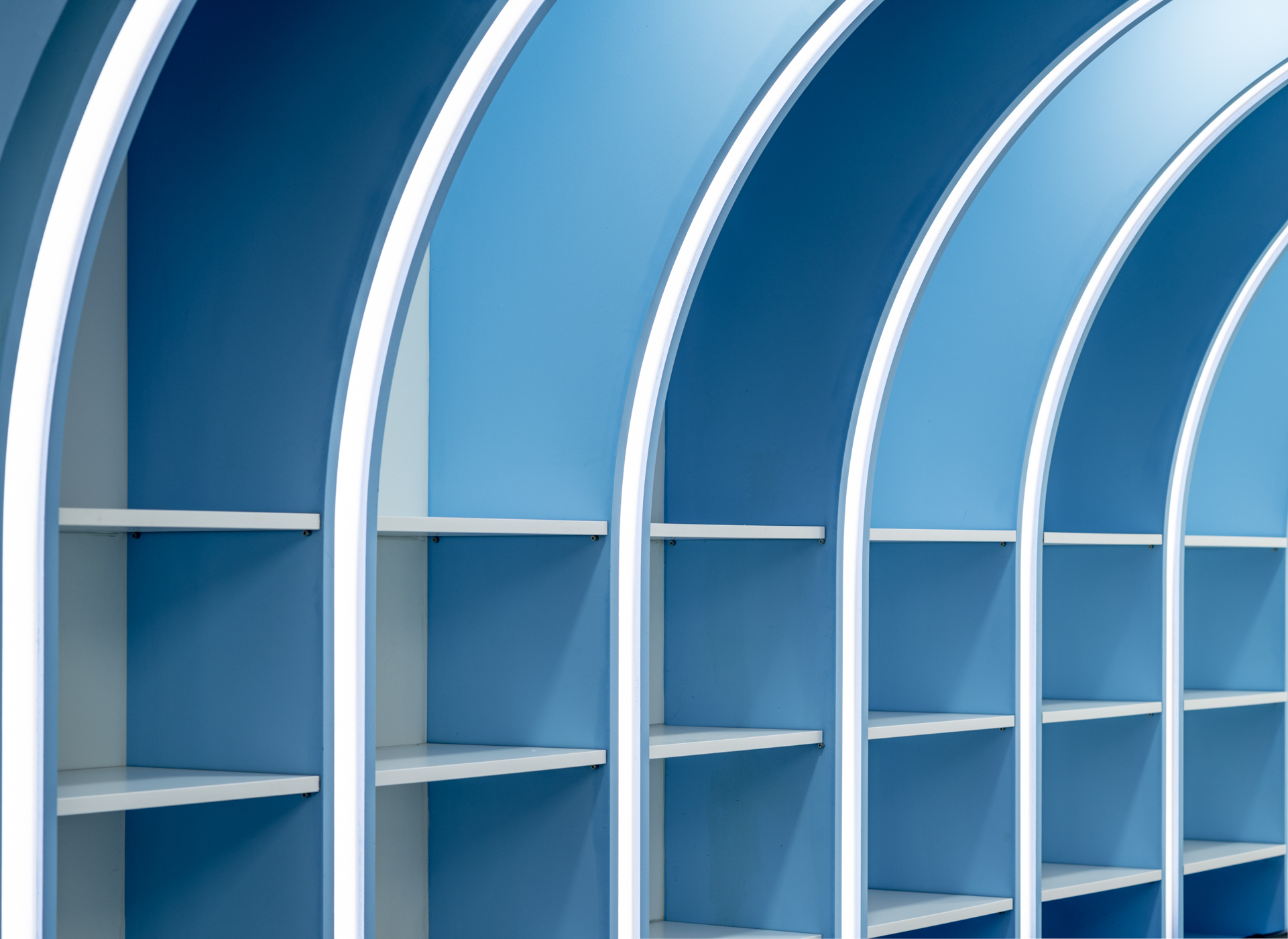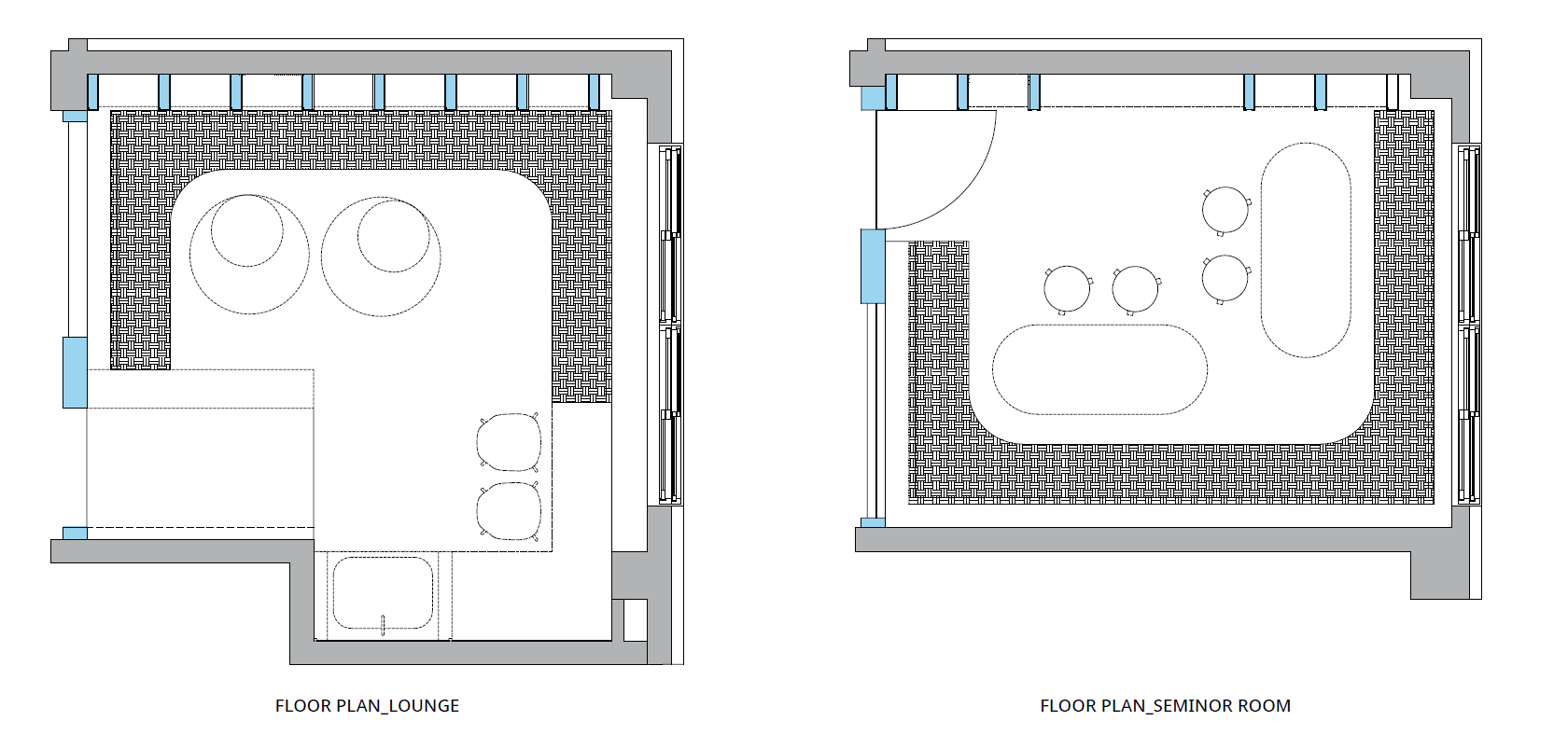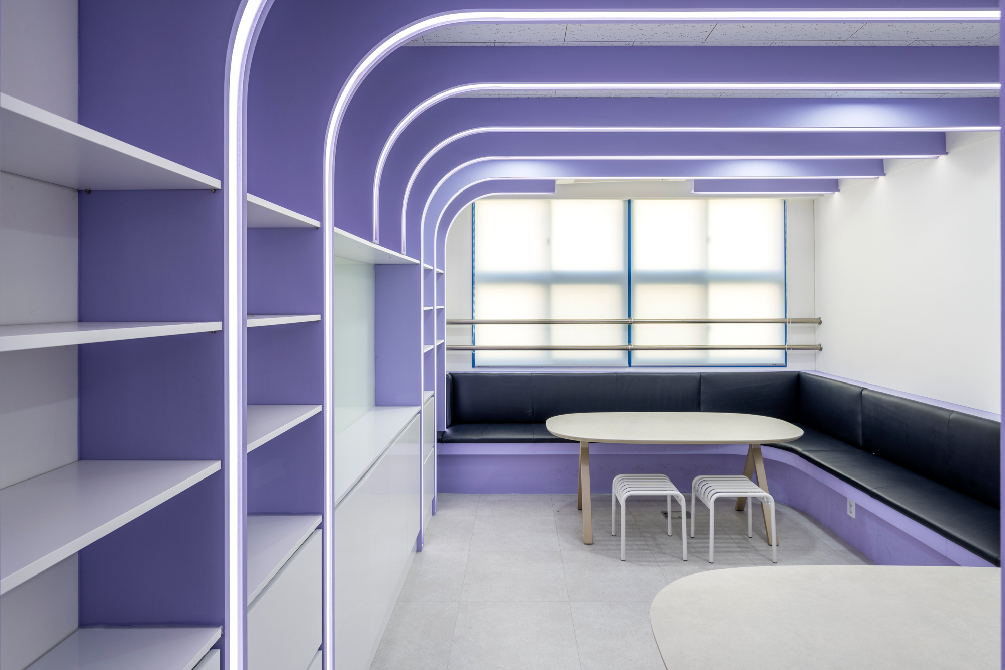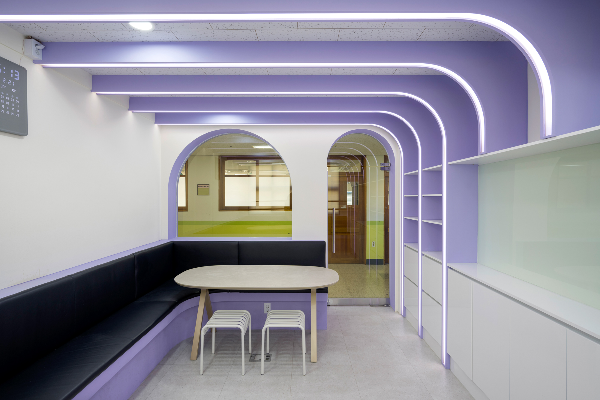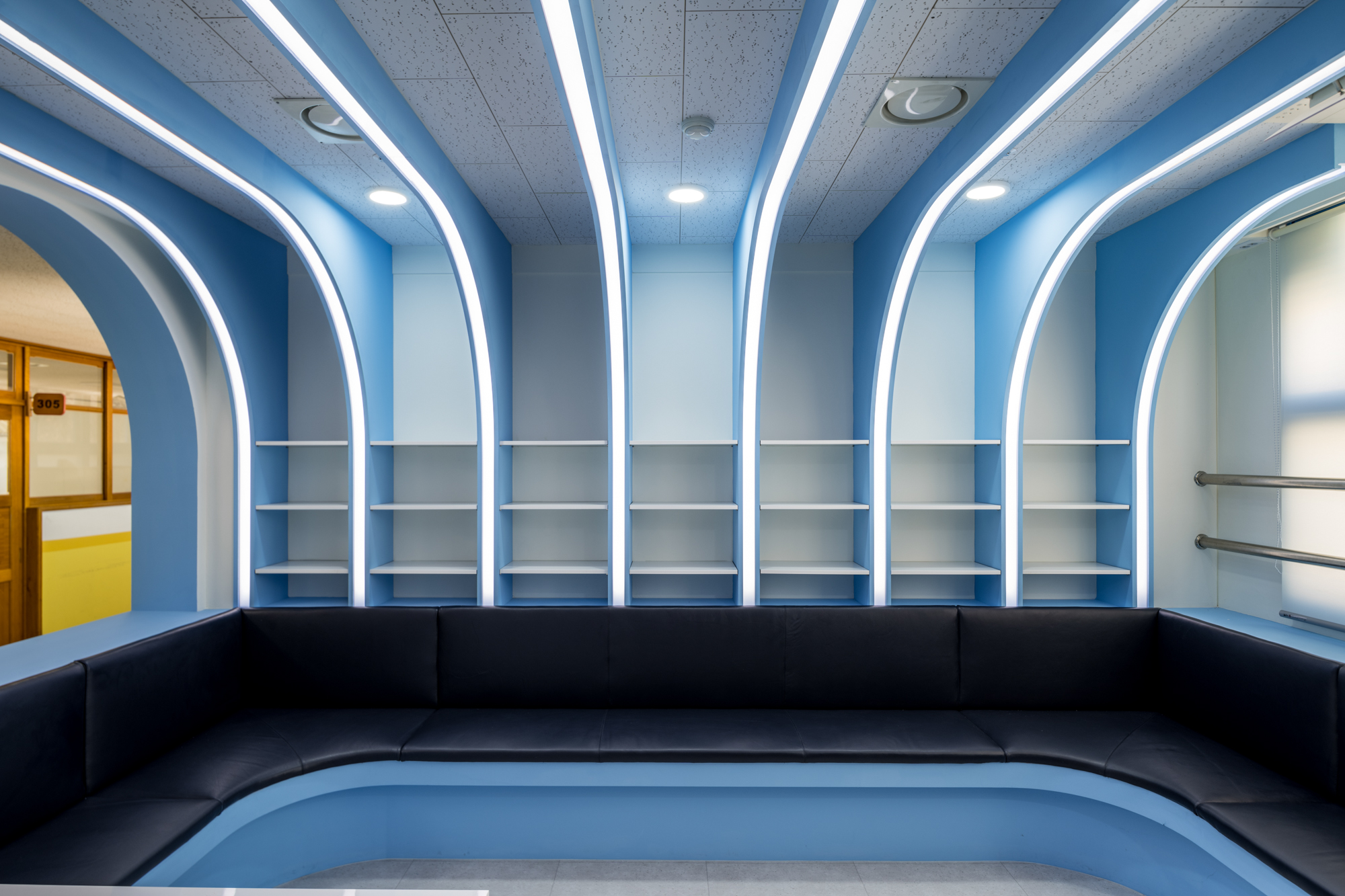 직선의 개념이 강한 학교의 평면과 입면 안에서 자칫 지루해 보일 수 있는 공간의 분위기에서 벗어나고자 곡선 요소를 도입했다. 천장에서 벽까지 이어진 선형 조명은 아이덴티티를 부여하며 공간의 중심이 되고, 제작된 고정형 가구들은 복도를 면한 기존의 벽을 재구성하며 조명의 형태와 조화를 이루는 아치형으로 설계했다. 층별 구분을 위해 각각 연보라색, 하늘색을 주조색으로 사용한 공간에는 스터디용 및 휴게용 가구를 배치하여 학생들의 자유롭고 활용도 높은 공간 사용을 의도했다.