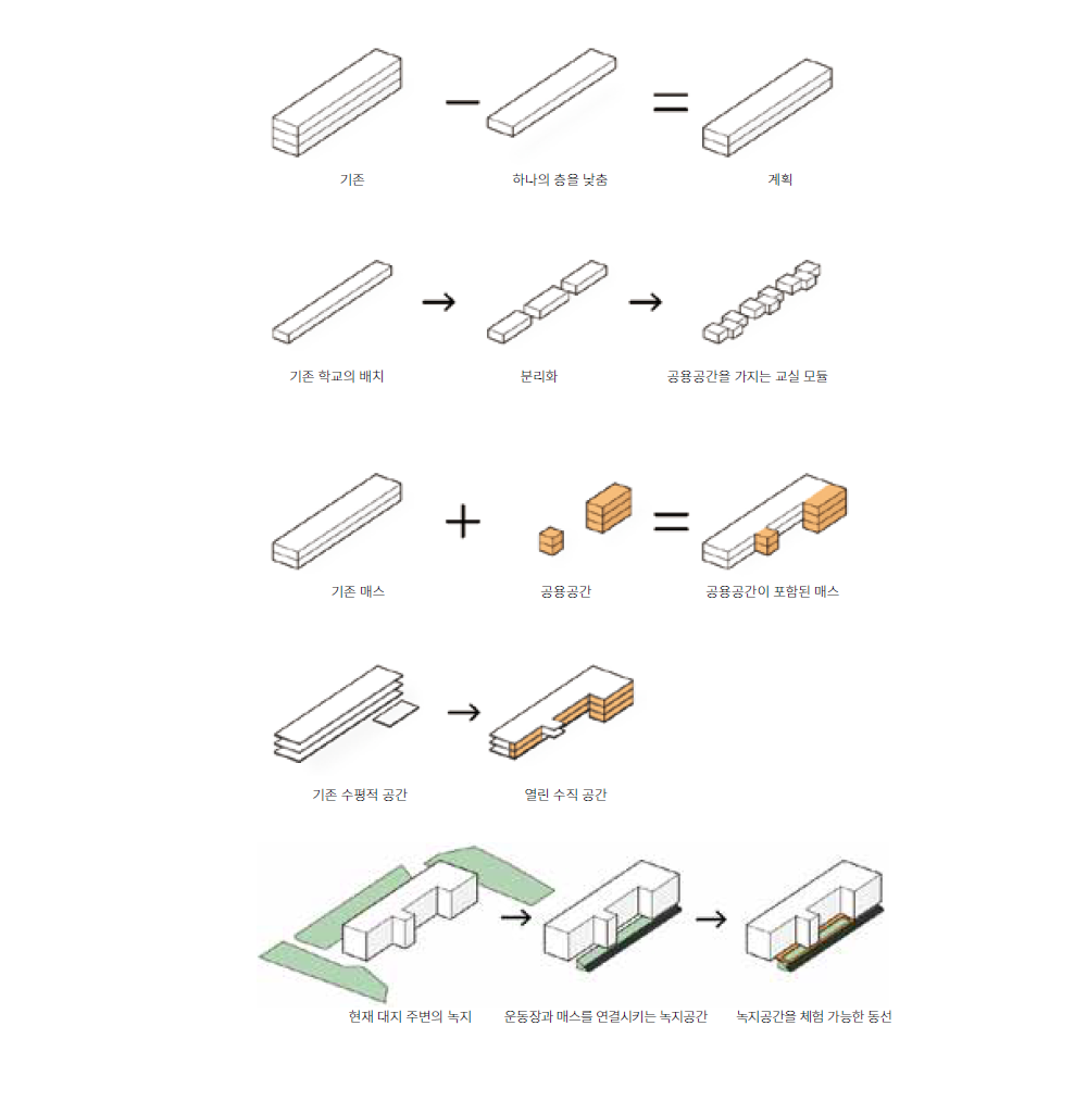 건축가는 일률적으로 배치되어 있는 교실의 모듈을 분리하여 공용 공간을 조성하고, 기존 매스의 저층화, 개방 수직화, 녹지공간 체험화 등을 통해 개방적인 모습으로 탈바꿈하고자 하였다. 유기적인 배치를 통해 새로운 본관동, 별관동, 체육관의 관계성을 회복하고, 본관동의 질서를 존중하는 ‘ㄷ’ 자형 배치를 통해 학생들에게 편안하고 안락한 공간을 제공하는 공간을 제안했다. 내부 수직 동선은 운동장과 본관동의 4.5m 높이 차를 건축적으로 접근하며 본관동의 동선을 홀과 도서관, 별관, 운동장으로 자연스럽게 연결했다.