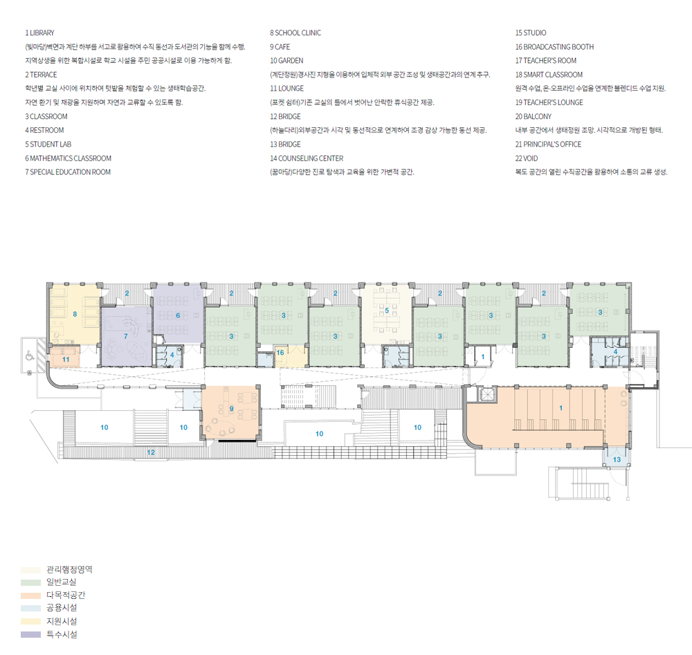 Wando Girl’s Middle School Green Smart Main Building Future School is a project where the users and producers of the school space, including students, teachers, and parents, actively participated in the design. Various participation programs for educational stakeholders were conducted, resulting in a multifaceted cultural atmosphere through architectural adjustments and remodeling, and proposing various forms of spaces.