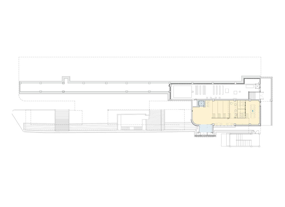 The architect transformed the uniform arrangement of classrooms by separating the modules to create communal spaces. Through the low-rise development of the existing masses, vertical openness, and the experiential integration of green spaces, the design created a more open appearance. By employing an organic arrangement, the architect restored the relationship between the new main building, annex building, and gymnasium. A “ㄷ”-shaped layout, was proposed to provide students with a comfortable and cozy area. The internal vertical circulation addresses the 4.5m height difference between the playground and the main building, connecting the pathways of the main building seamlessly with the hallway, library, annex, and playground.