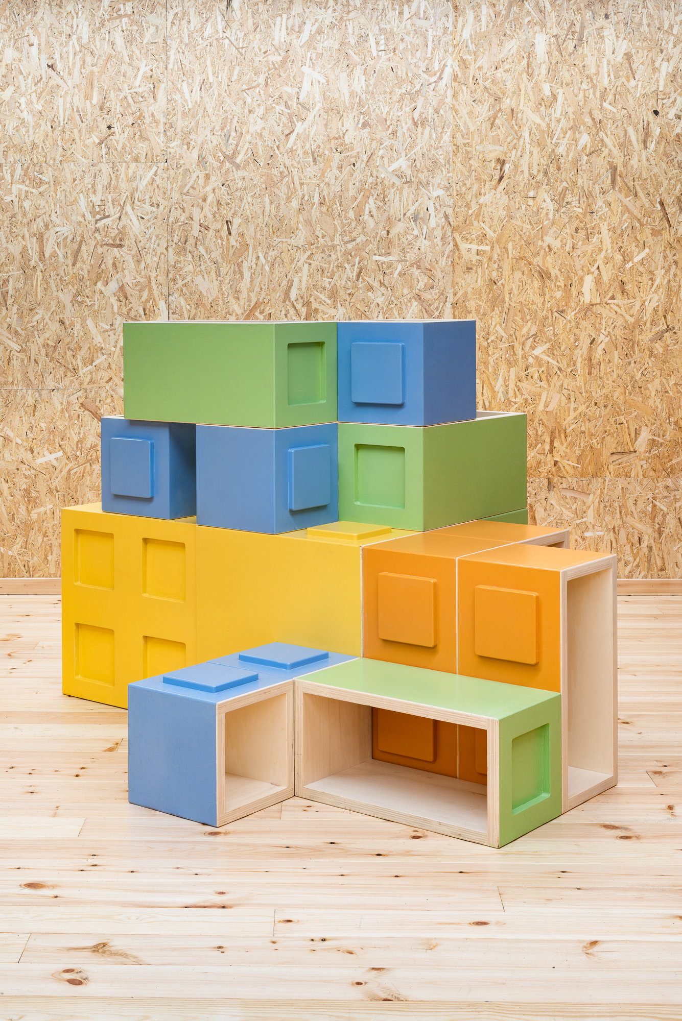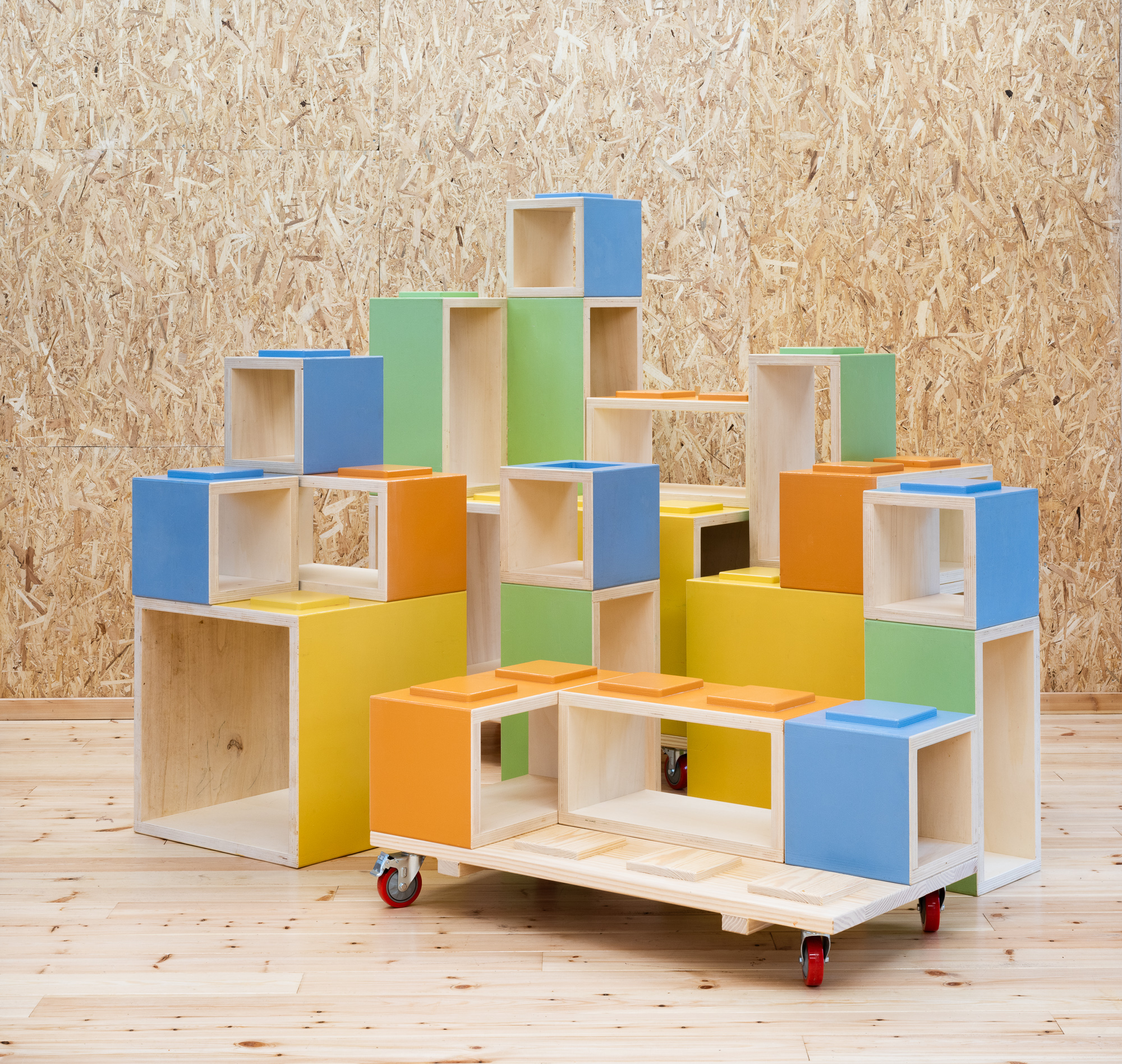 QUOIN blocks combine to create classroom structures such as benches, stools, tables and shelves as well as several possibilities of play and hiding spaces, stairs, bridges and adventure trails that challenge children to imagine and create their own built environment. The QUOIN series consists of 5 modular furniture pieces of different shapes and sizes as well as a trolley made out of plywood with Lego-like interlocking systems that can be assembled and disassembled easily by both children and adults.