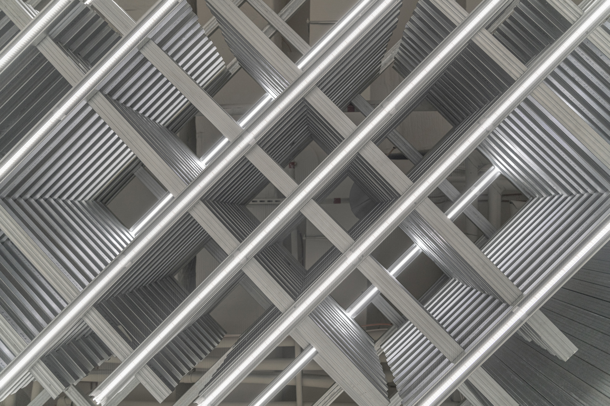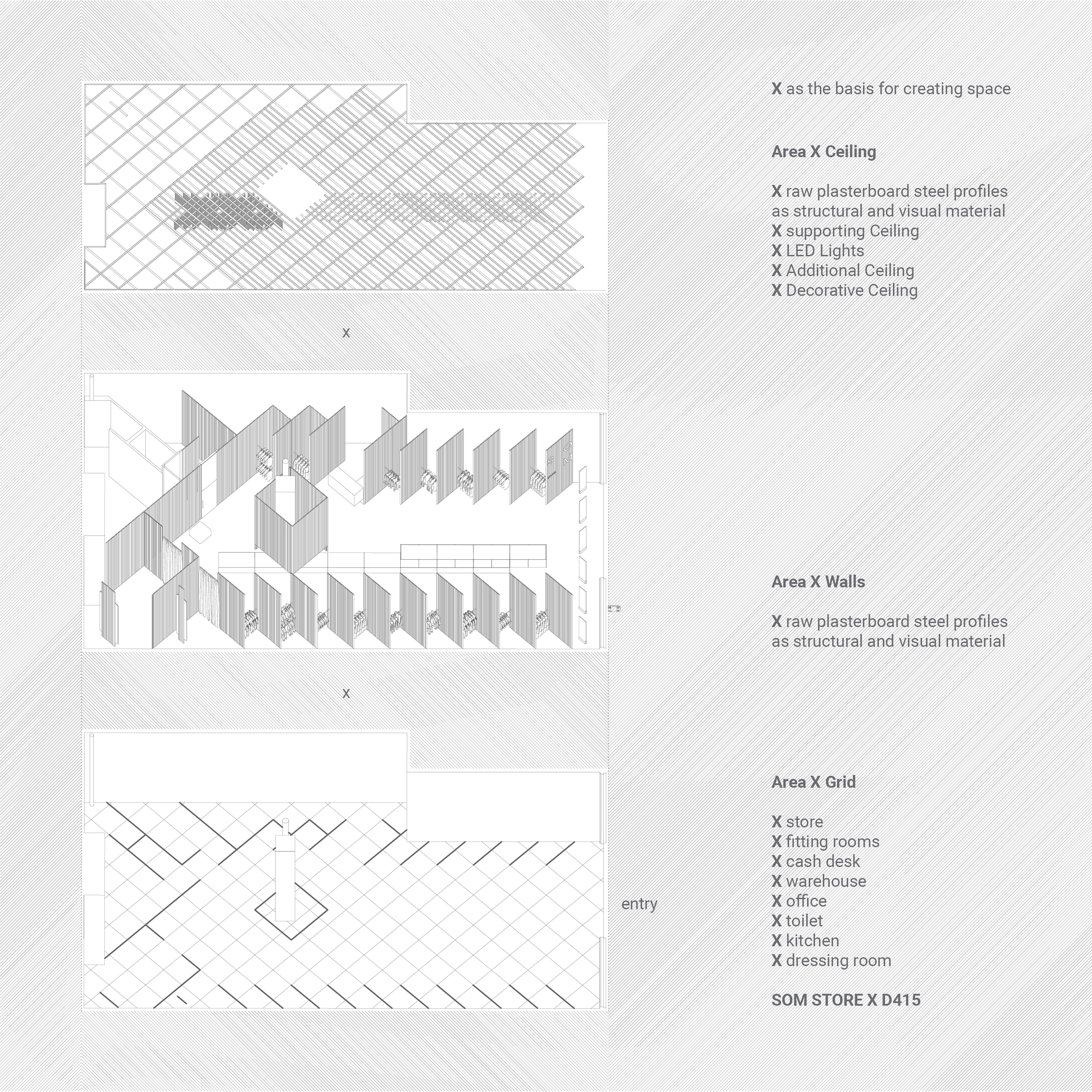 X는 인테리어 디자인의 아이디어 요소를 지지해준다. 패션과 연관되어 있는 X는 &을 의미한다. SOM STORE은 컨셉 멀티 브랜드 스토어로 슬로바키아와 체코의 패션 디자이너 셀렉션을 다루는컨셉 멀티 브랜드 스토어이다. 상점 내부에는 내향 X 외향이라는 주제에 맞게 벽을 돌려가며 일한다. 공간을 걸어가다 보면 점차적으로 디자이너의 각 컬렉션들을 볼 수 있다. 평면 직물과 교차되는 구조는 섬유의 공간적 구조를 위한 패션 디자이너의 기본 지원 요소다. 문자 ‘X’를 기반으로 한 평평한 그리드는 건축가의 ‘평평한 직물’이 되고 내부 공간을 나누는 기초가 된다.