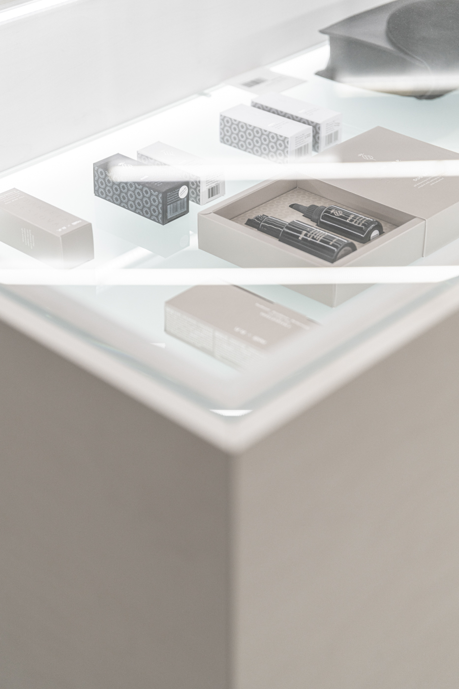 The main goal was finding a parallel between the work of a fashion designer and an architect. The basic building element is a raw plasterboard steel profile. This simple structural material for its strength and aesthetic properties is used in an atypical way, where entire walls are gradually assembled from it without additional surface treatment. Just as fashion designers work with textile material, which is joined and stitched until the final product is created, these profiles are connected to each other to create individual modules, dividing the space and thus creating a neutral space for presentation. The central location of the wooden showcase with the bench as the jewel of the store is not accidental. In addition to the main exhibition function for fashion accessories, the central furniture object has the function of a bench for sitting, e.g., for trying on accessories or for audience seating for small fashion shows where the models walk around the furniture object.