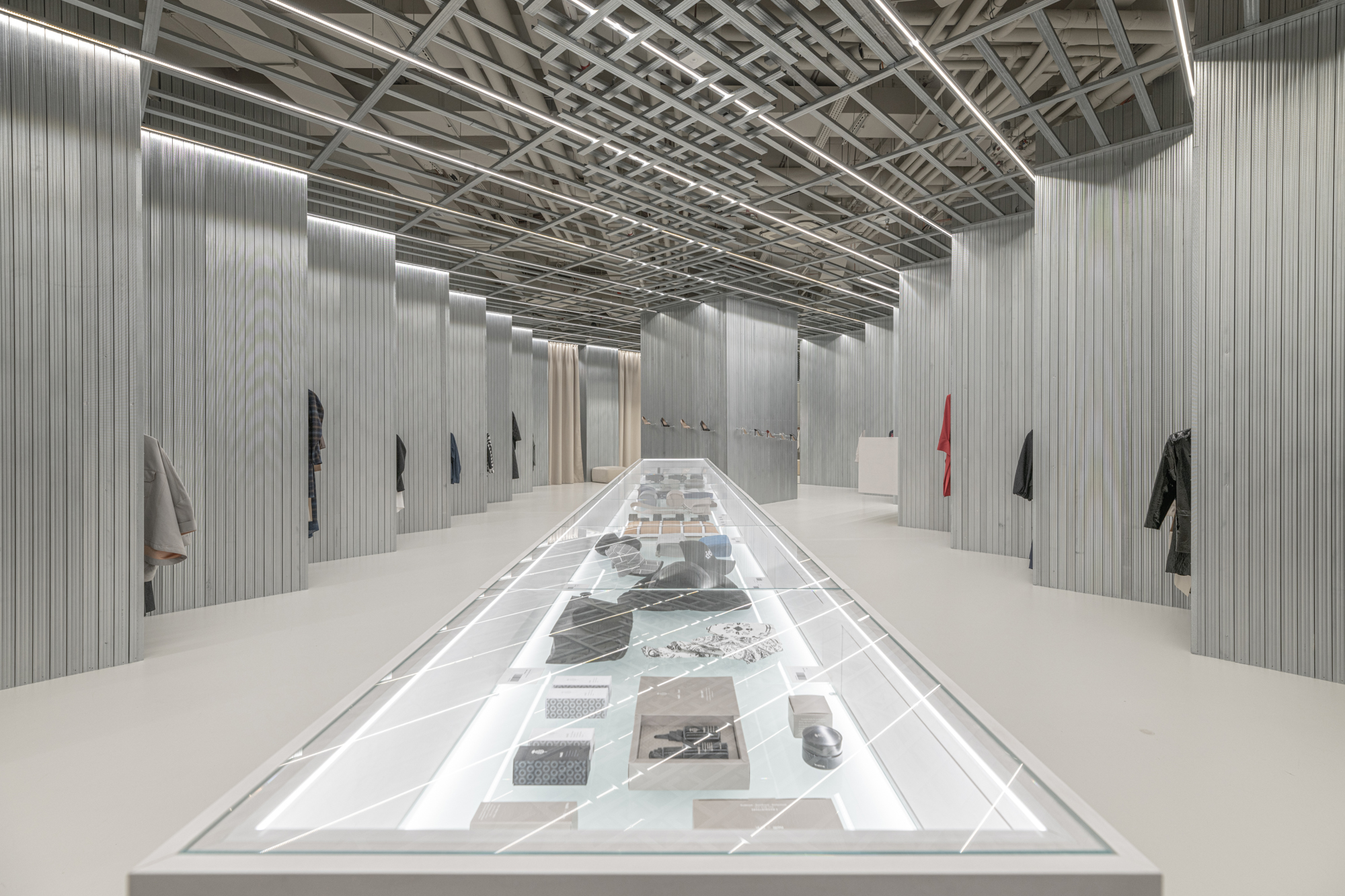 주된 목표는 패션 디자이너와 건축가의 업무의 유사점을 찾는 것이다. 건물의 기본 요소는 석고보드 강철 프로파일이다. 건물의 강도와 미적 특성을 위한 기본 구조적 재료는 추가적인 표면 처리 없이 전체 벽이 점차적으로 조립되는 비정형 방식으로 사용된다. 패션 디자이너가 텍스타일 소재를 가지고 최종 작품이 만들어 질 때까지 연결하고 꿰매어 가며 작업하듯이 건축가는 개별 모듈을 만들고 공간을 나눠가며 프레젠테이션을 위한 중립적인 공간을 만든다. 매장의 보석인 벤치와 함께 목재 쇼케이스를 중앙에 놓은 것은 우연이 아니다. 벤치와 같은 가구 오브제가 중앙에 놓일 경우 패션 액세서리를 전시하는 역할도 하게 되지만 앉을 수 있는 곳도 된다. 예를 들면, 액세서리를 착용해볼 수 있는 자리가 되거나 모델이 가구 오브제 주위를 돌아다니는 소규모 패션쇼의 관객석 역할을 한다.