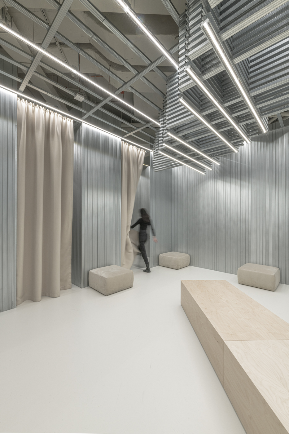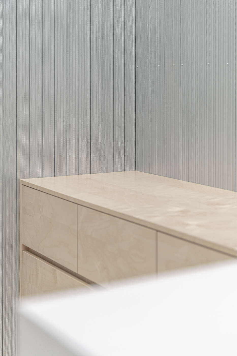 The main goal was finding a parallel between the work of a fashion designer and an architect. The basic building element is a raw plasterboard steel profile. This simple structural material for its strength and aesthetic properties is used in an atypical way, where entire walls are gradually assembled from it without additional surface treatment. Just as fashion designers work with textile material, which is joined and stitched until the final product is created, these profiles are connected to each other to create individual modules, dividing the space and thus creating a neutral space for presentation. The central location of the wooden showcase with the bench as the jewel of the store is not accidental. In addition to the main exhibition function for fashion accessories, the central furniture object has the function of a bench for sitting, e.g., for trying on accessories or for audience seating for small fashion shows where the models walk around the furniture object.