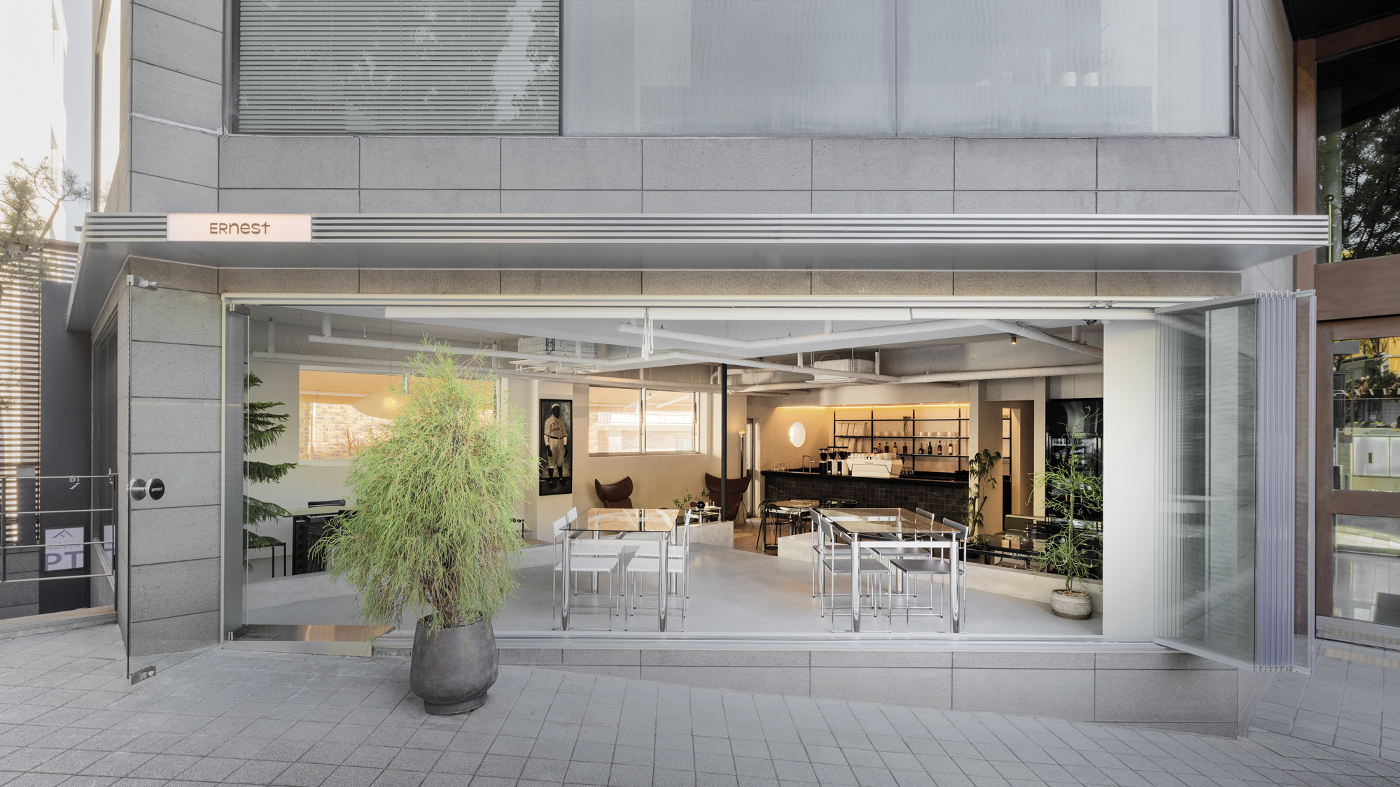At first, this space had semi-basement conditions. However, we wanted to break the visual rules by creating a platform, half of which was on the same level as the outside and half on the same level as the inside. Therefore, when entering from the outside, the space is divided into layers, allowing each individual to feel a different sense of space. So, these elements meant that this space was “liberated” in a spatial sense. In this way, we wanted to create an open space that is not defined through the keyword of liberation.