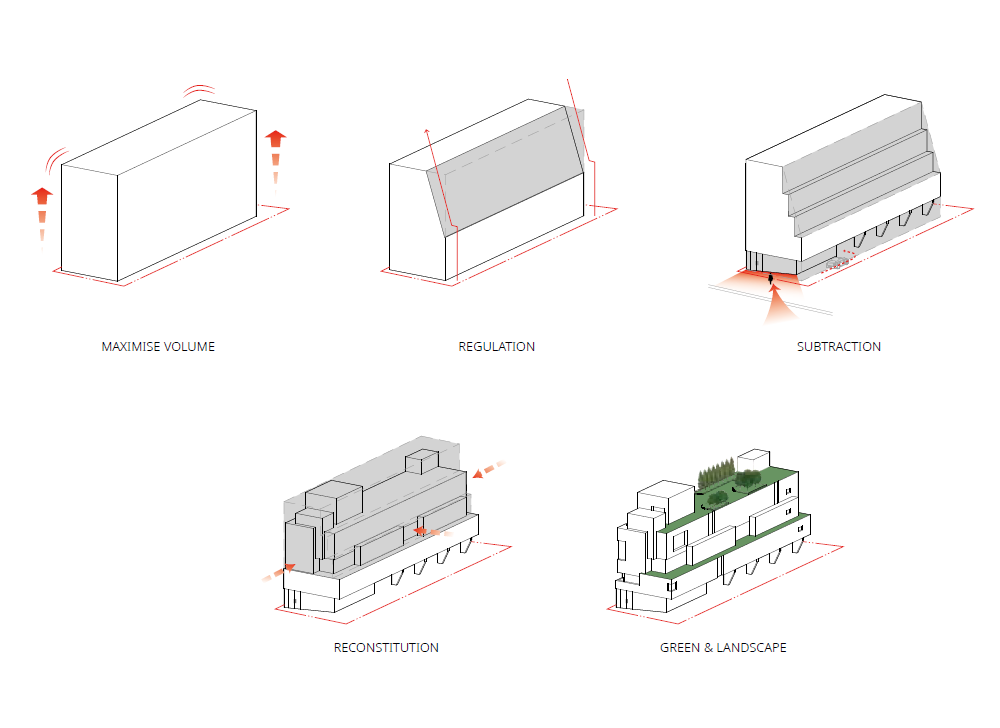 건축가가 처음 대지를 방문했을 때, 농지로 사용되었던 기존 대지에 건물을 짓기 위해 사전 조사와 관계자 협의에 상당한 시간을 들였다. 마치 화가가 그림을 그리기 전 이젤과 새로운 캔버스를 설치하는 것처럼 섬세한 작업이었다. 땅의 형태는 길이에 비해 너비가 좁았고, 일반 주거 지역이기에 일조에 의한 높이 제한과 4층 이하의 층수 제한이 있었다. 이는 매스 디자인을 하며 가장 중요하게 극복해야 할 요소가 됐다. 건축가는 거주 공간의 커뮤니티 요소이자 편안한 쉼터의 역할을 하는 소파의 형태를 매스에 담았다. 기업의 브랜드 이미지를 고려하여 주력 상품을 판매하는 플래그십 스토어이자, 상품을 보관하는 장소이기도 하기에 창고의 이미지도 담아야 했다. 실제로 판매하는 소파를 차곡차곡 쌓는 것처럼 매스에 대한 밸런스를 찾아 갔다. 정면에서 바라본다면 소파 몇 개를 쌓기도 하고 빼기도 하며, 테트리스를 쌓는 것처럼 재미있는 디자인 모티브를 찾아 시도했다.