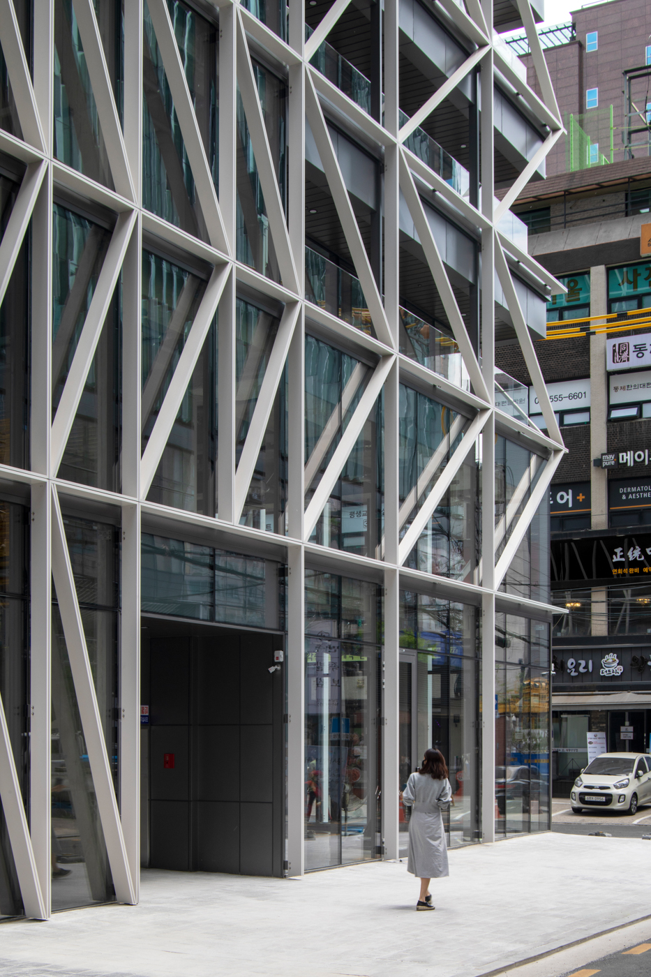 이러한 이미지를 남기기 위해 엘트리타워 파사드에 지그재그 패턴을 이용한 역동적인 사선 패턴을 부여했다. 유리 커튼 월 위에 더해진 선형의 부재는 단조로운 입면에 리듬과 시각적 움직임을 만든다. 두 면이 열린 코너로 입면의 밀도를 변화시켜 시선을 집중시키고자 했고, 수직의 부재들은 점차 넓은 간격의 코너 쪽으로 향한다. 사선 부재들은 이런 수직 부재들에 긴장감과 방향성을 주며 리듬과 방향성을 만드는 주역이다. 한편, 두 면에서 모여든 지그재그 패턴은 코너에서 만나게 된다. 코너는 발코니로 개방되어서 공간의 극적인 효과를 만든다.