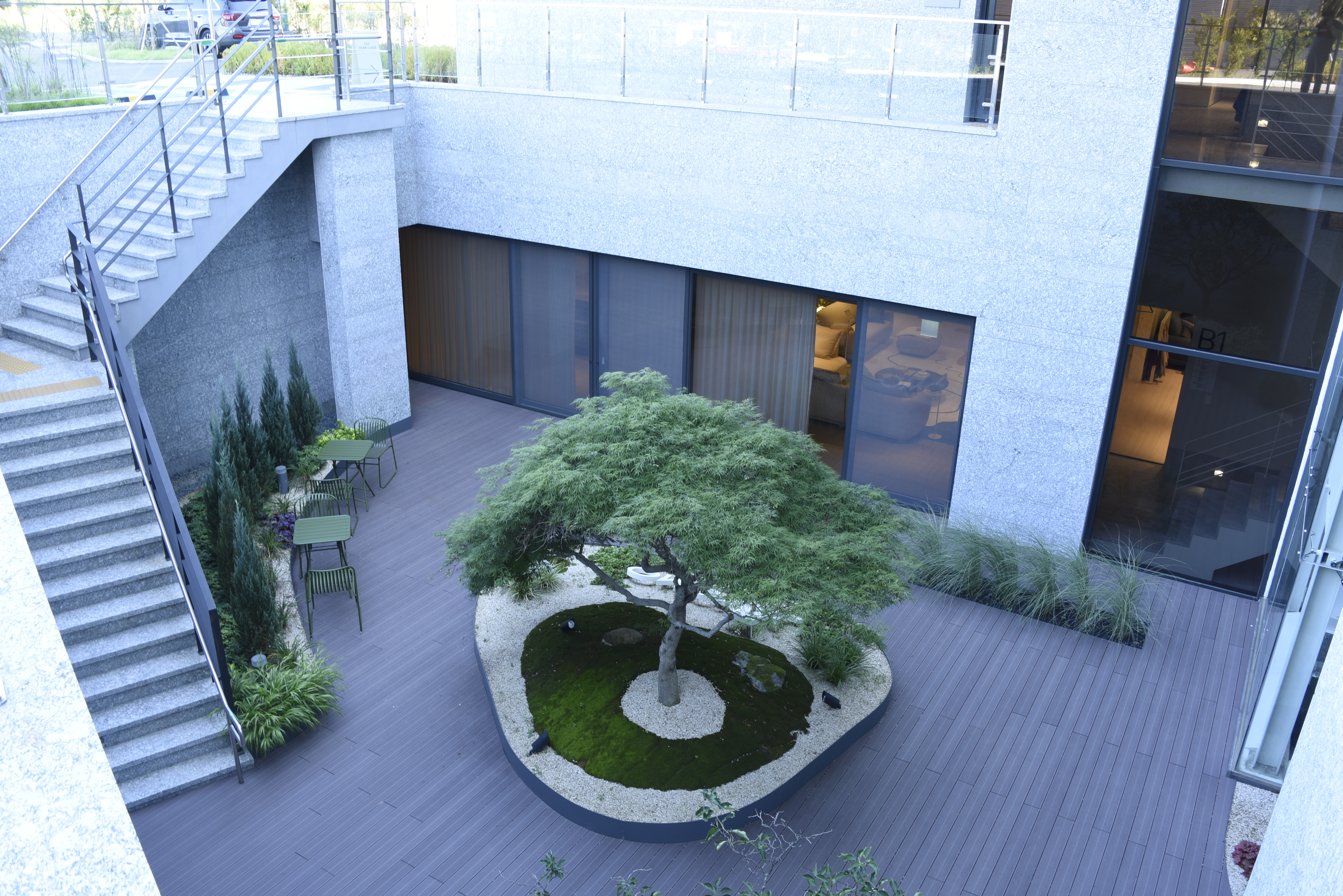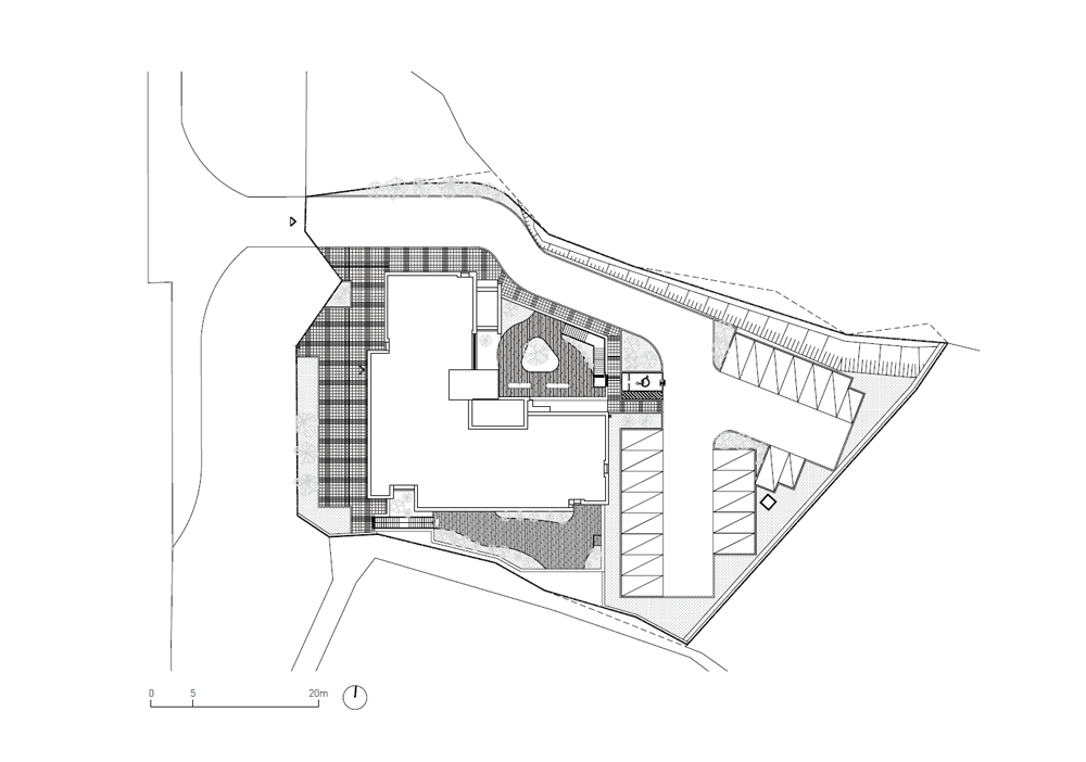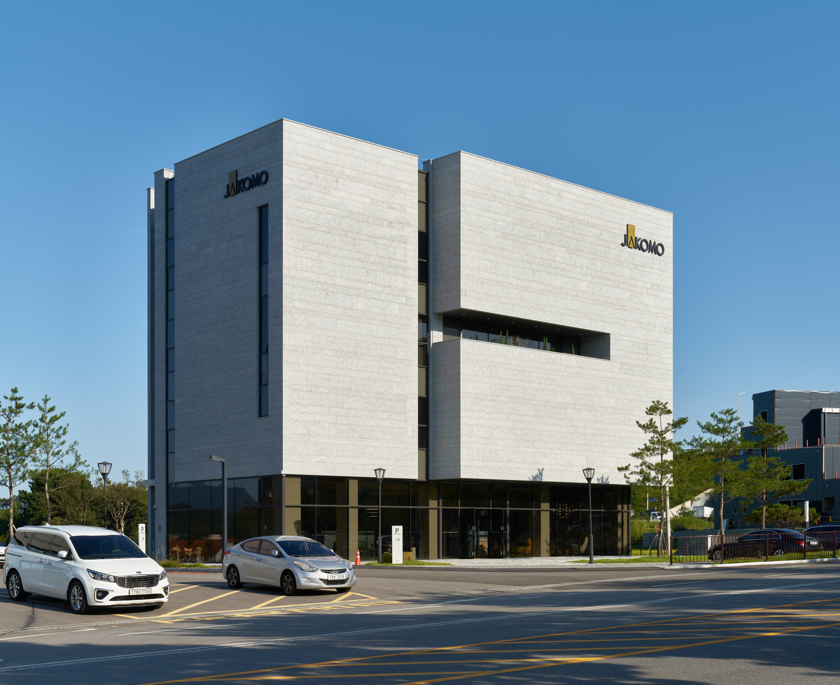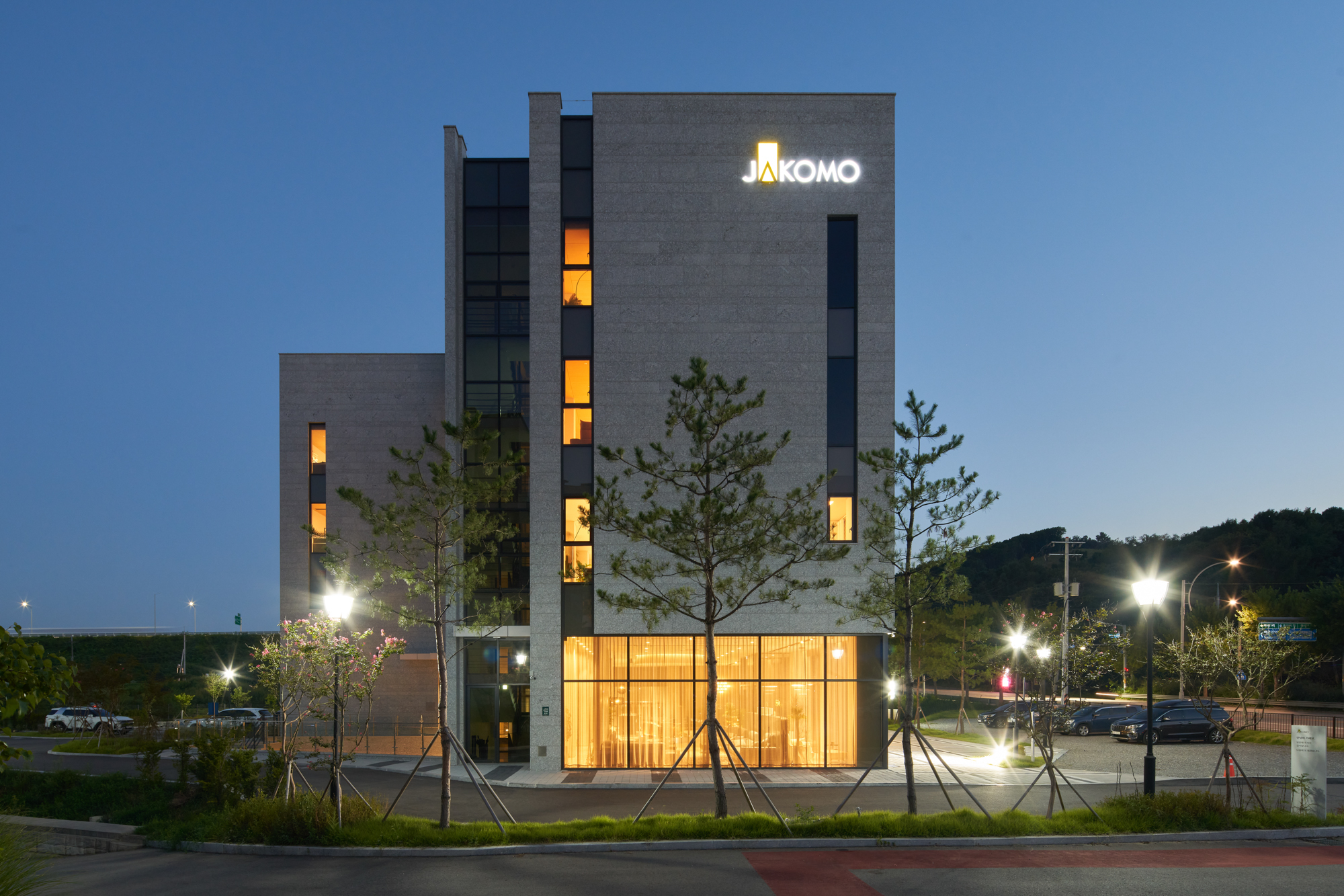 자코모 플래그십 스토어 용인은 경기도 용인시의 비교적 한적한 전면 도로와 제2 외곽 순환 도로와 인접한 대지에 계획된 프로젝트다. 건축가는 인접한 도로를 통행하는 차량이 건물을 잘 인지할 수 있어야 한다는 건축주의 요구에 따라 건물의 볼륨을 L 자형으로 구상했다. 그리고 건물의 코어는 이 볼륨의 중앙에 배치했다. 지하층의 선큰 가든과 연결된 코어는 개구부가 절제된 내부 공간과 외부를 연결하며 개방감을 주려는 의도가 담겼다. 이를 위해 계단실의 벽체를 오픈하고 누드형 엘리베이터를 계획했다.