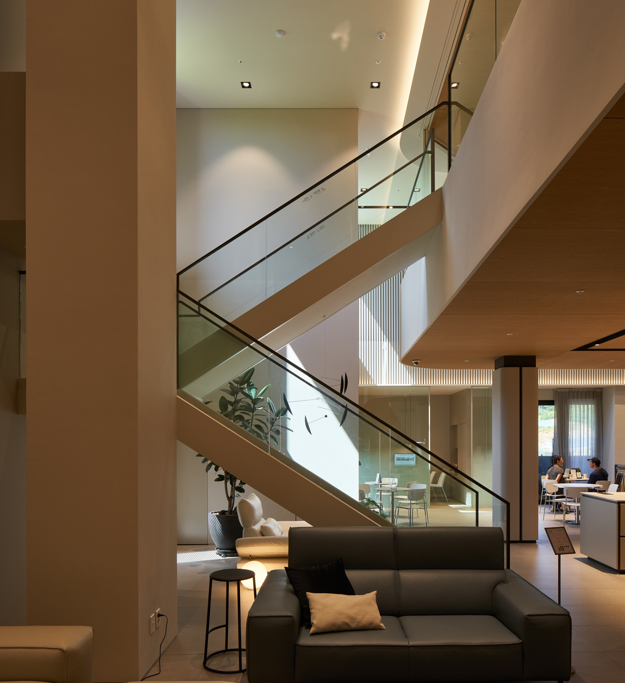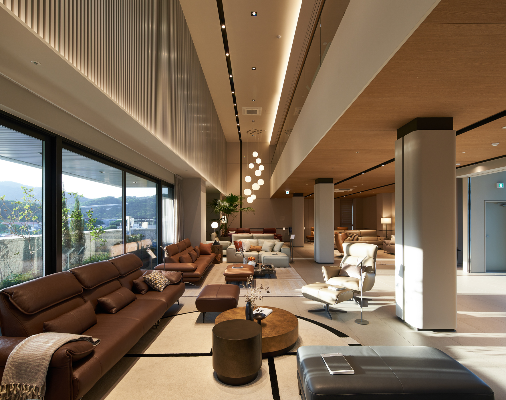 1층 전면부는 개방성을 줄 수 있도록 충분한 공간을 주었고, 지하층에는 두 개의 선큰 가든을 설치하여 내부와 외부를 수평으로 연결했다. 3층과 4층은 하나의 공간으로 오픈하는 대신 수직으로 연결하는 내부 계단을 설치하여 역동적이고 개방적인 공간으로 의도했다. 내부 공간은 소파를 전시하고 판매하는 프로그램 중심이 되며, 그 외의 부속 공간이 구성되어 있다. 가죽 제품을 전시하는 공간의 특성에 따라 가능한 한 큰 규모의 개방된 공간이 필요했다. 또, 제품을 보호하기 위해 직사광선을 차단해야 했다. 이로써 개구부의 볼륨은 최대한 절제하고, 매시브한 덩어리 형태로 표현하며 이를 분절하는 전략을 취했다. 한편, 외부 공간은 이와 대조되게 비교적 대지의 여유가 많아, 전원적인 주변 환경에 부합하는 개방적인 느낌을 준다.