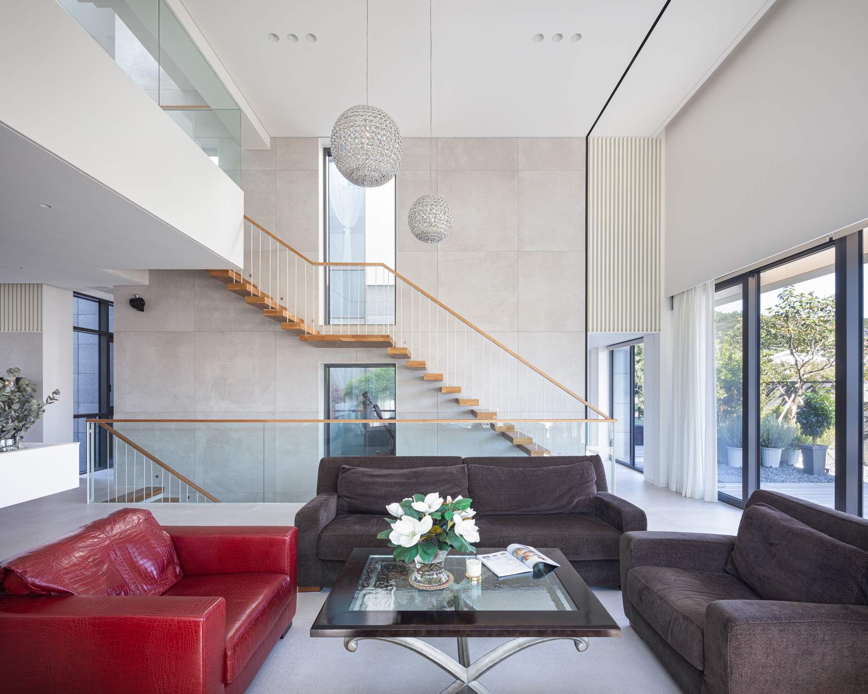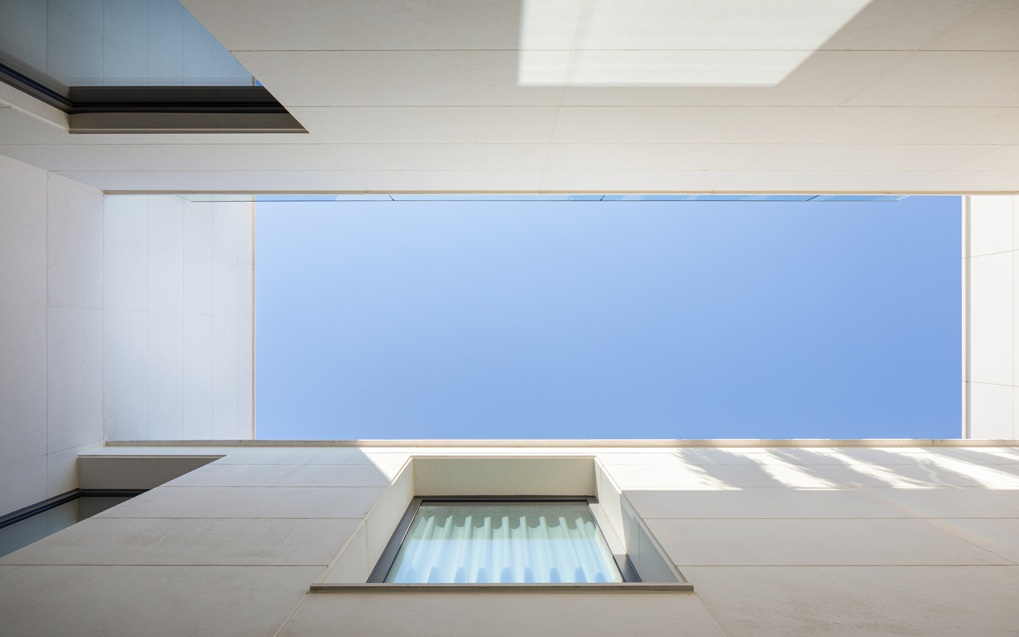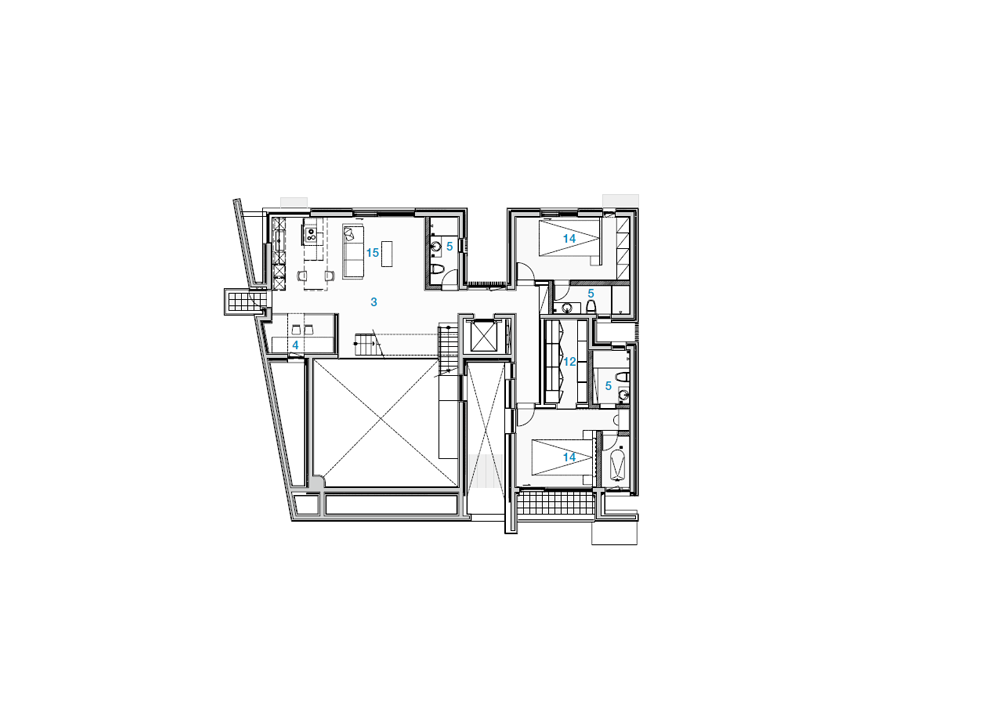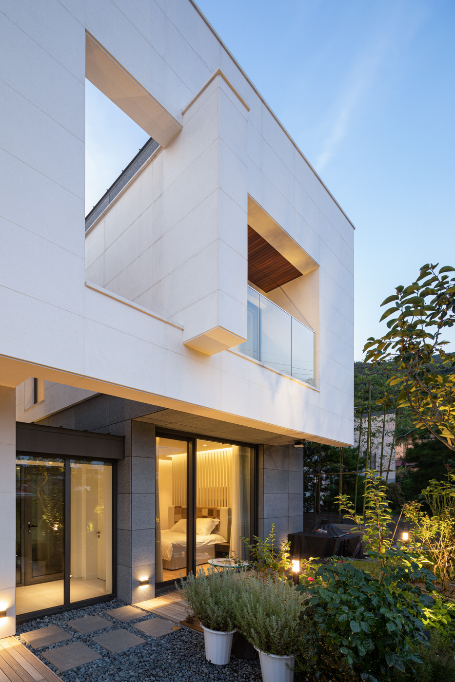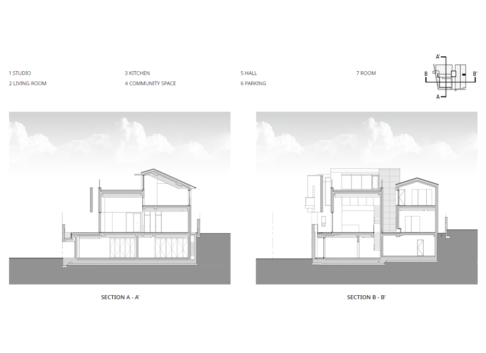 건축가는 여러 개의 선큰과 중정 공간을 만들며 정방형의 대지를 꽉 채웠다. 내부는 두 개의 매스가 엘리베이터와 복도로 연결되며, 서측의 공용 공간과 동측의 프라이빗한 공간으로 나뉜다. 그 사이의 중정은 두 공간을 이격시키고 내부 정원으로 이어지는 역할을 한다. 주택의 가장 프라이빗한 욕실이나 화장실 등의 공간은 외벽을 안쪽으로 말린 공간과 면하여 창을 내고 바깥에서는 보이지 않는 루버를 설치했다. 이와 반대로 공용 공간은 외부 도로를 향해 돌출된 발코니를 설치하여, 가족들이 집에서도 외부 공간을 충분히 느낄 수 있도록 의도했다.