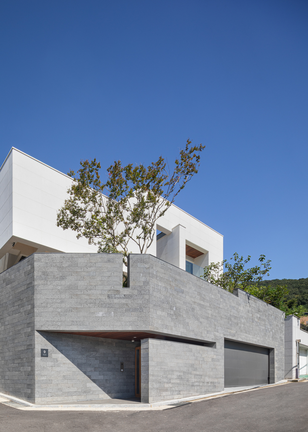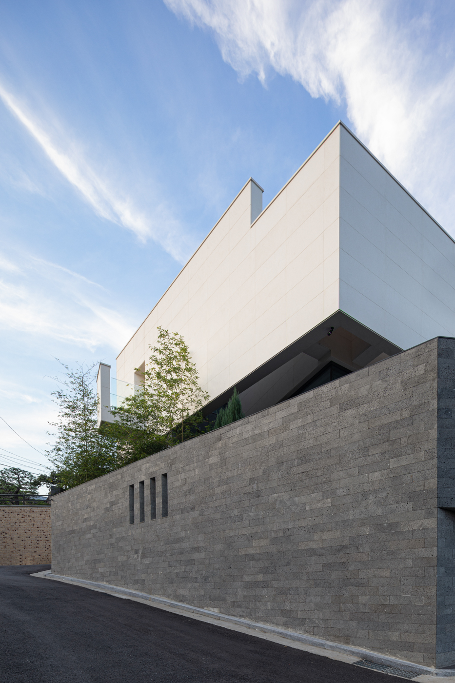 1층 모서리에서 세로로 길게 만들어진 담장에서는 길들이 내려다보인다. 안에서 밖을 내다보는 슬릿은 안쪽이 좁고 바깥이 넓어 사선으로 틈이 난 담장 안에서 외부를 바라볼 수 있다. 그 자리에는 배롱나무 한 그루가 식재되어 있어 이 주택의 스토리에 상징성을 부여한다.