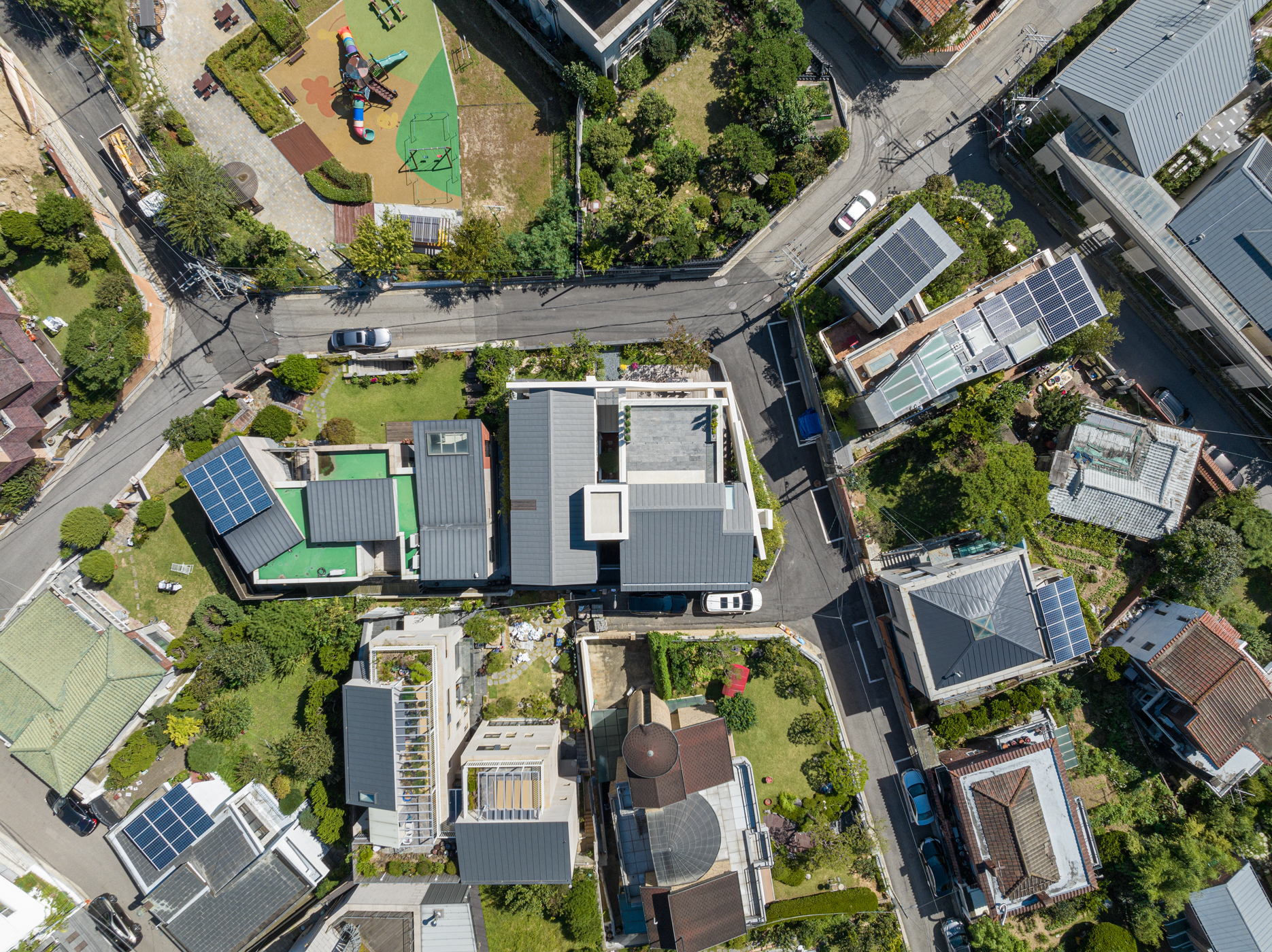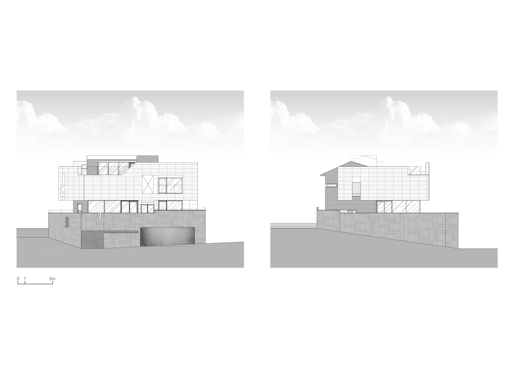 건축가는 여러 개의 선큰과 중정 공간을 만들며 정방형의 대지를 꽉 채웠다. 내부는 두 개의 매스가 엘리베이터와 복도로 연결되며, 서측의 공용 공간과 동측의 프라이빗한 공간으로 나뉜다. 그 사이의 중정은 두 공간을 이격시키고 내부 정원으로 이어지는 역할을 한다. 주택의 가장 프라이빗한 욕실이나 화장실 등의 공간은 외벽을 안쪽으로 말린 공간과 면하여 창을 내고 바깥에서는 보이지 않는 루버를 설치했다. 이와 반대로 공용 공간은 외부 도로를 향해 돌출된 발코니를 설치하여, 가족들이 집에서도 외부 공간을 충분히 느낄 수 있도록 의도했다.