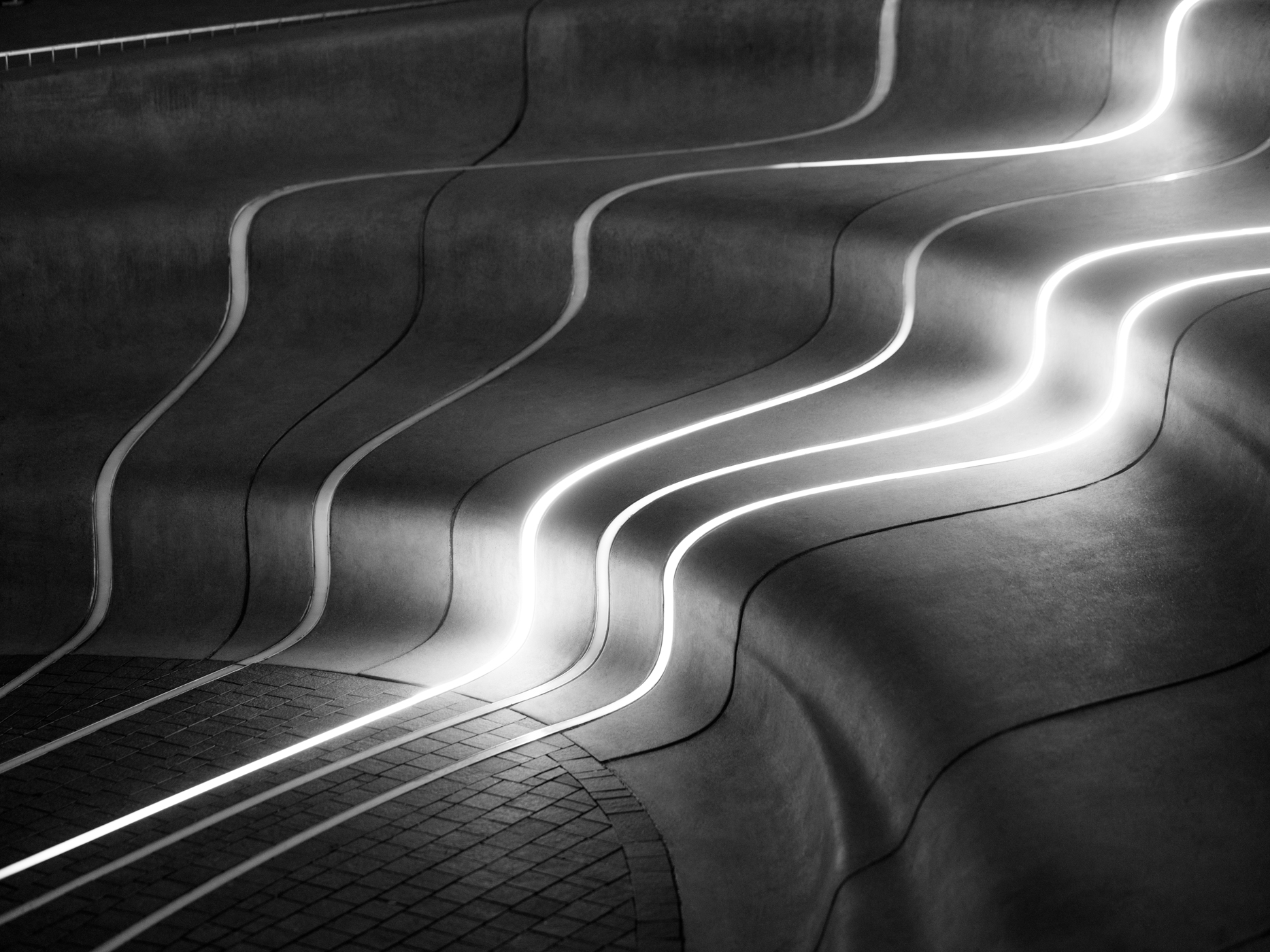 Delta is an embedded light sculpture that flows through streets and alleys of the Tullinløkka development in Oslo, Norway. Through new architecture, passages, public art, bars and cafes, and over an 80-tonne concrece waterfall amphitheatre, this river delta of light guides citizens and visitors through the complex. Sensors embedded in the architecture recognize walkers, making them propagate waves of light along the city floor.