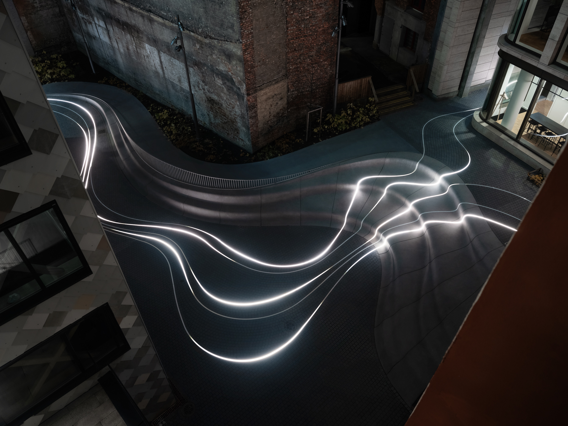 The interior of Tullinløkka district in Oslo has traditionally been cut off from the public. As the developer, Entra, in preparing for the erection of several new structures including the new University of Oslo Faculty of law, proposed to open the complex up and establish a new public space within, Void put forth a design that would invite the public in to explore the new area. Delta is an embedded light sculpture that flows through streets and alleys of the Tullinkvartalet development. It runs over a polished concrete waterfall in the heart of the block, which doubles as an amphitheatre.