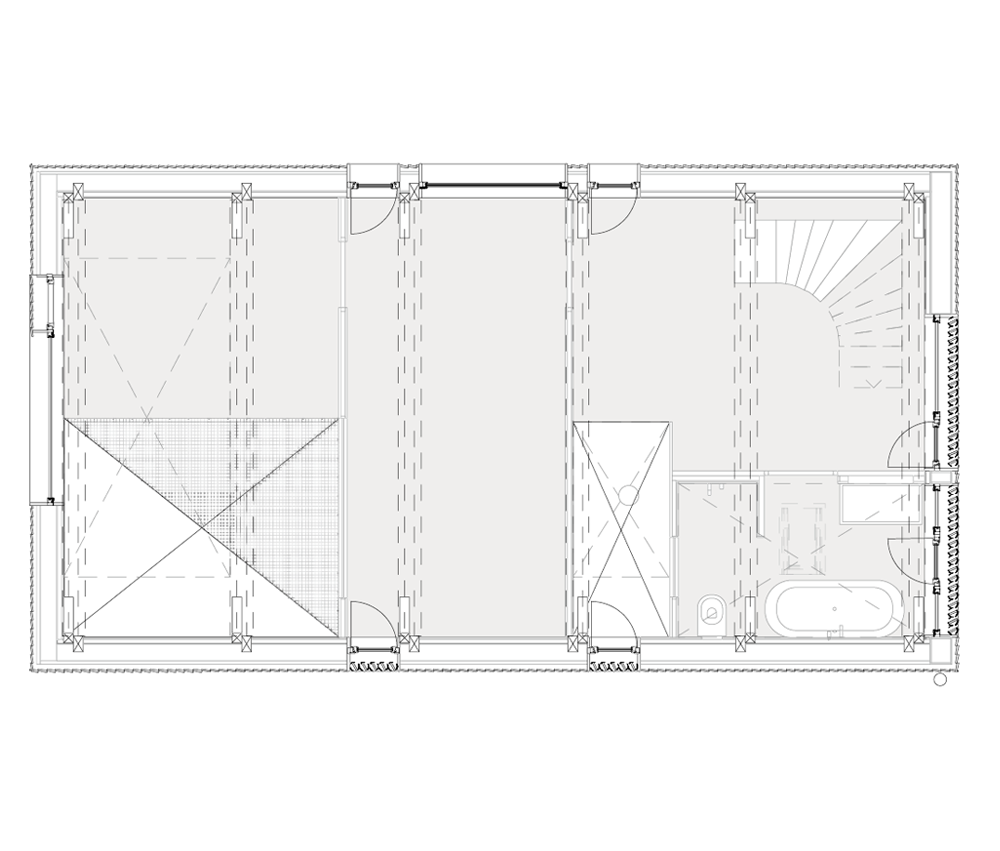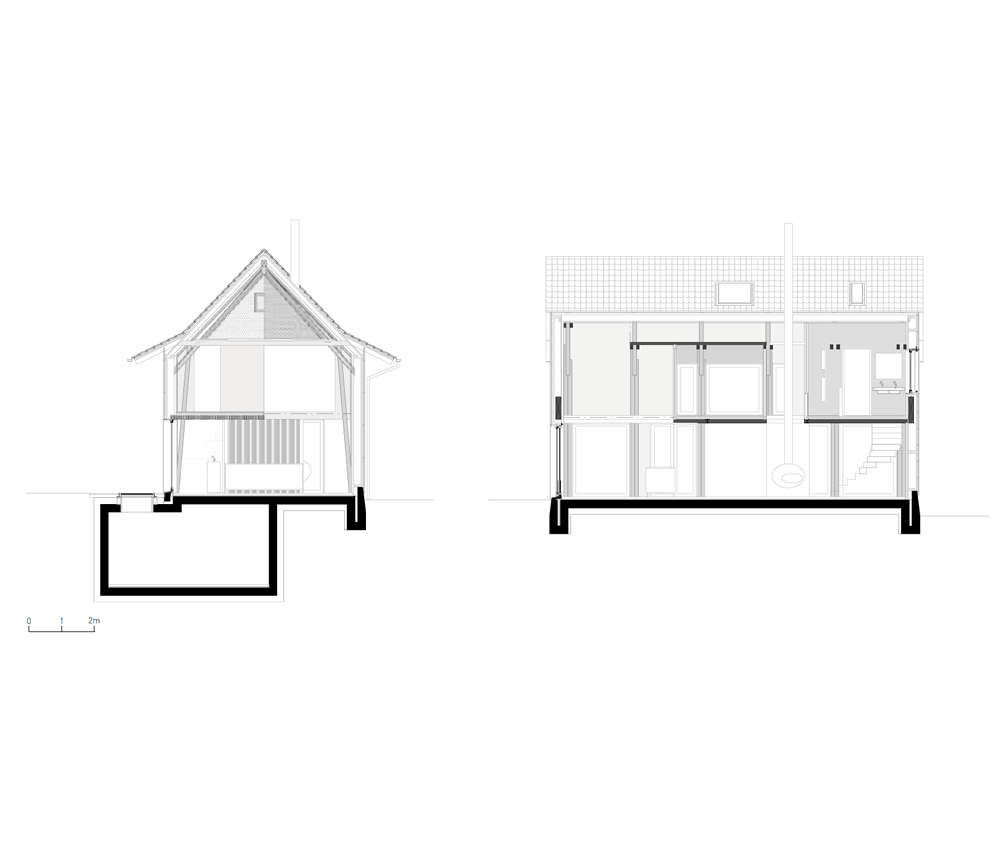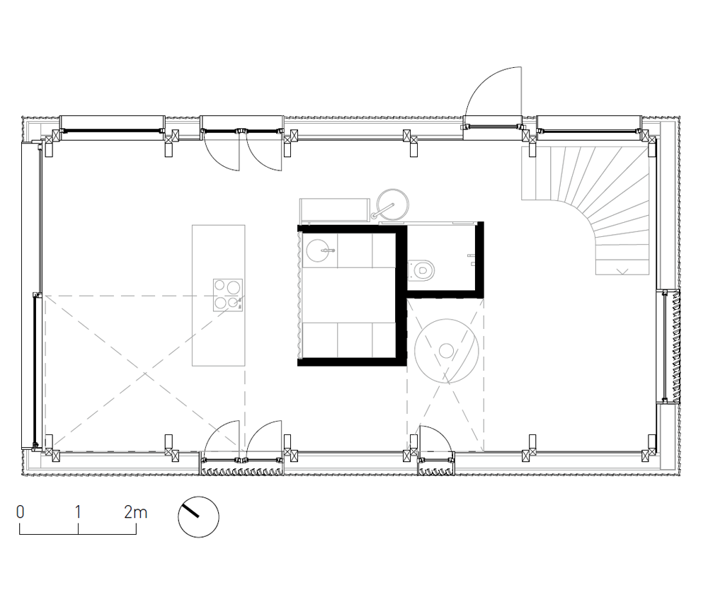 매스나 지붕 모양은 기존의 헛간 형태에서 크게 벗어나지 않았지만, 외벽에는 일본의 야키스기(Yakisugi) 기법을 적용한 전나무 패널을 새로 설치했다. 나무판자의 패널을 고열로 가공한 이 기법은 내구성을 크게 향상하므로, 이 집에서 몇 세대가 사는 동안에도 끄떡없을 것이다. 사생활 보호와 채광 조절을 위해 외부로 면하는 창문이 있는 건축물의 두 면에는 빛을 조절할 수 있도록 목재 창살로 만든 덧문을 계획했다.