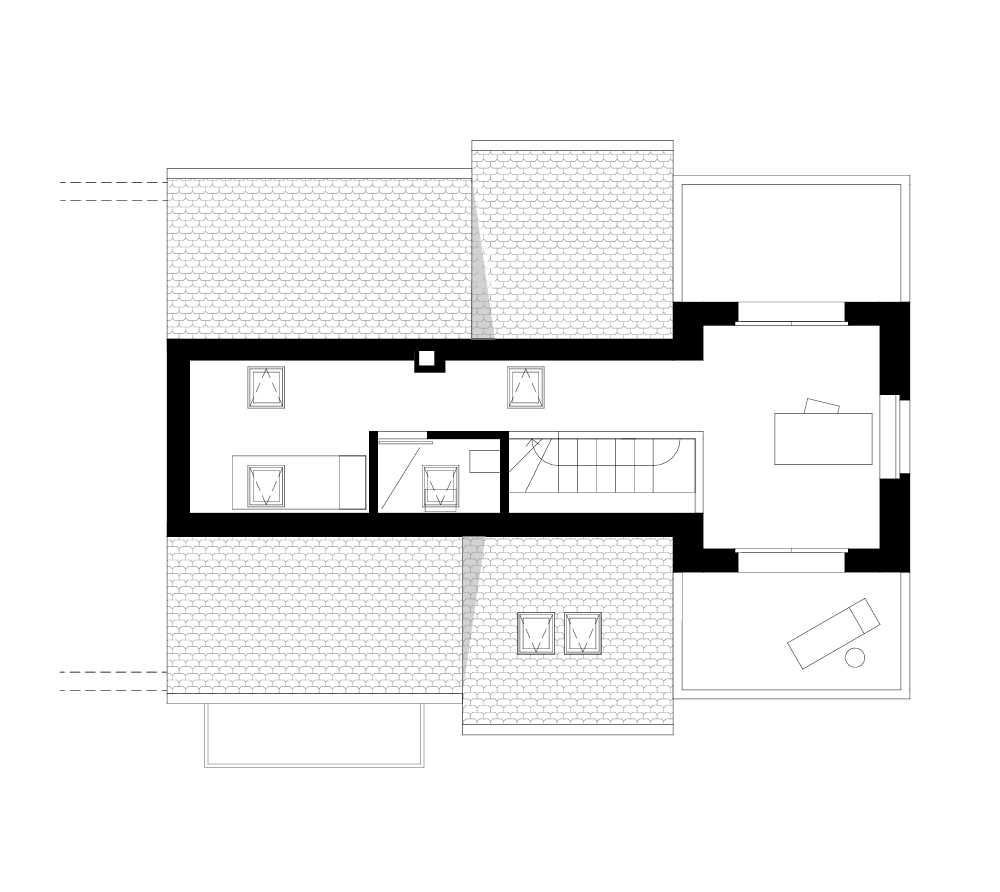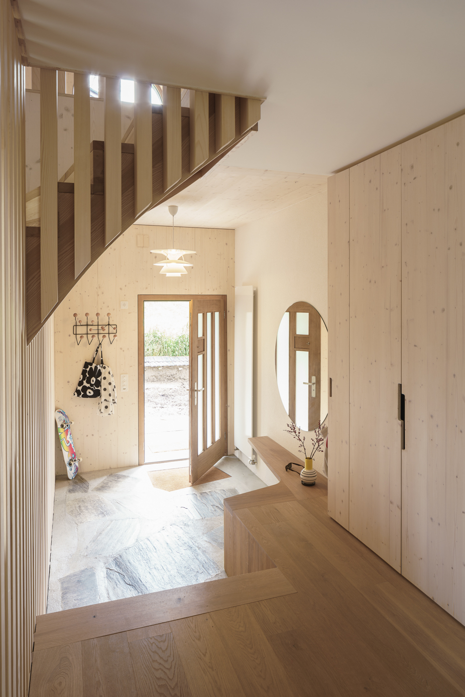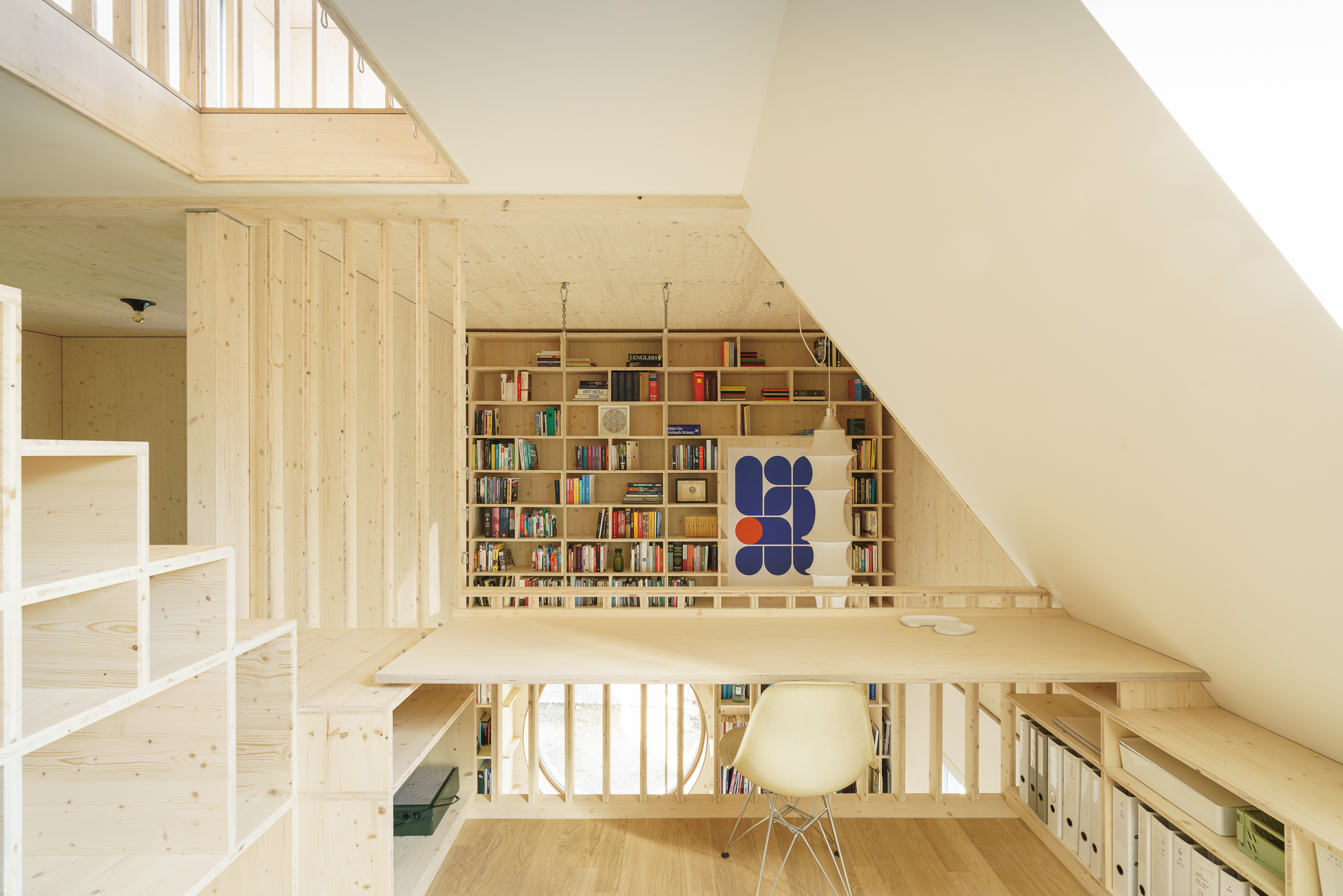 턱솔이음을 사용해 조인트의 나사와 볼트 사용을 최소화했고, 내부의 목재 패널 위에는 추가적인 마감재를 적용하지 않았다. 다만, 시간이 지나며 목재가 노랗게 바래는 것을 방지하기 위해 천연 아마 오일과 화이트 미네랄 페인트로 코팅했다. 천연 목재를 사용해 실내 온습도가 조절되며, 기분 좋은 소나무 향도 맡을 수 있다.