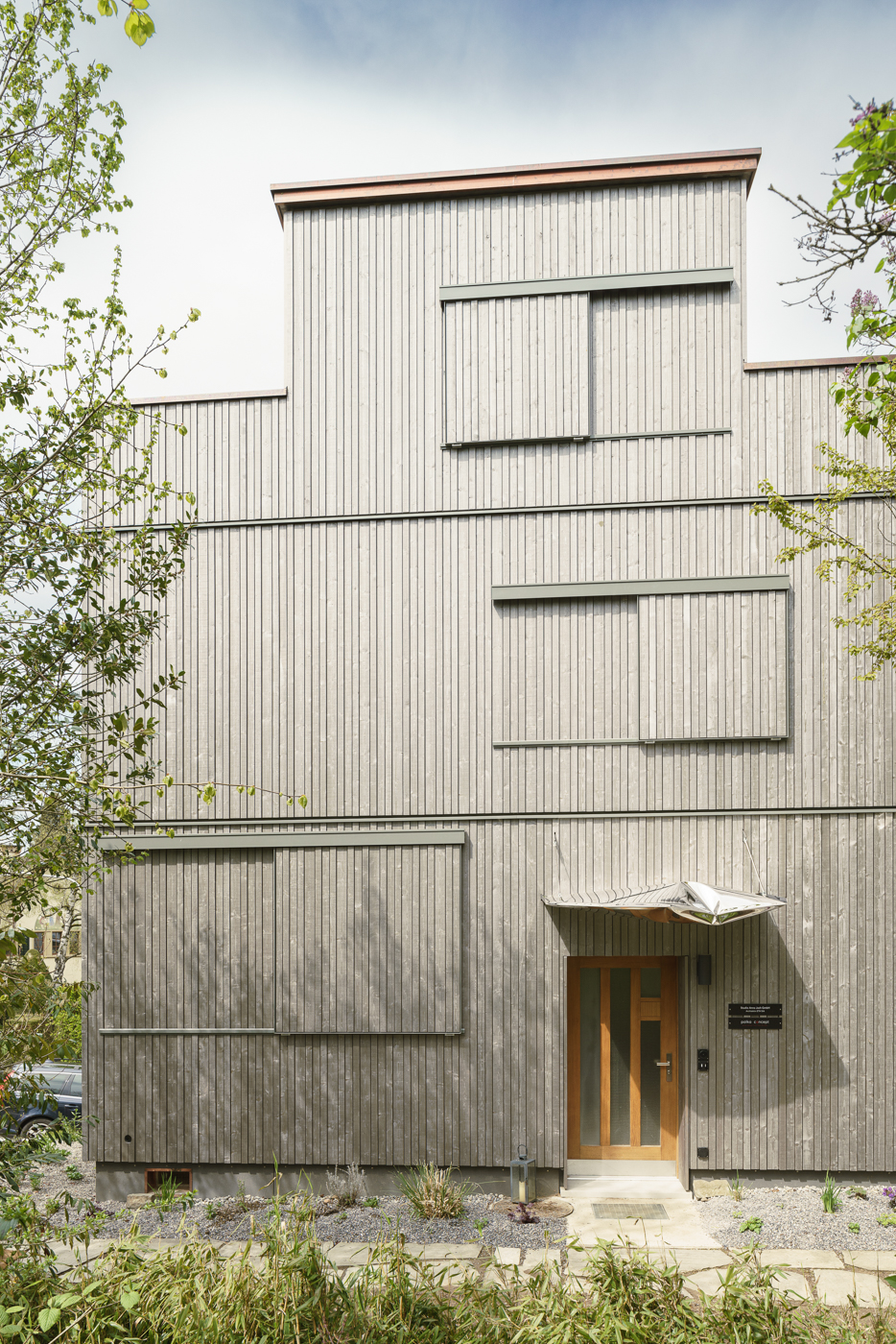 눈의 주택은 건축주의 요청에 따라 짧은 기간에 진행된 프로젝트다. 건축가는 시공의 편의성을 높이고 시간을 절약하기 위해 현장에서 조립할 수 있는 소나무 단열 샌드위치 패널을 사용했다. 소나무 패널은 외부 마감에 적합한 외장재이며, 건설 현장에서 37km 떨어진 지역 조립장에서 CNC 기계로 생산되었다. 현장으로 조달된 패널은 4명의 인원과 이동식 크레인으로 5시간 만에 조립했다. 또한 지역에서 생산된 건축 자재를 사용하며 탄소 발자국을 크게 줄였으며, 굴착한 토사는 조경에 재활용했다. 26cm의 단열재가 포함된 총 두께 40cm의 벽체는 난방비를 50% 이상 절감한다.