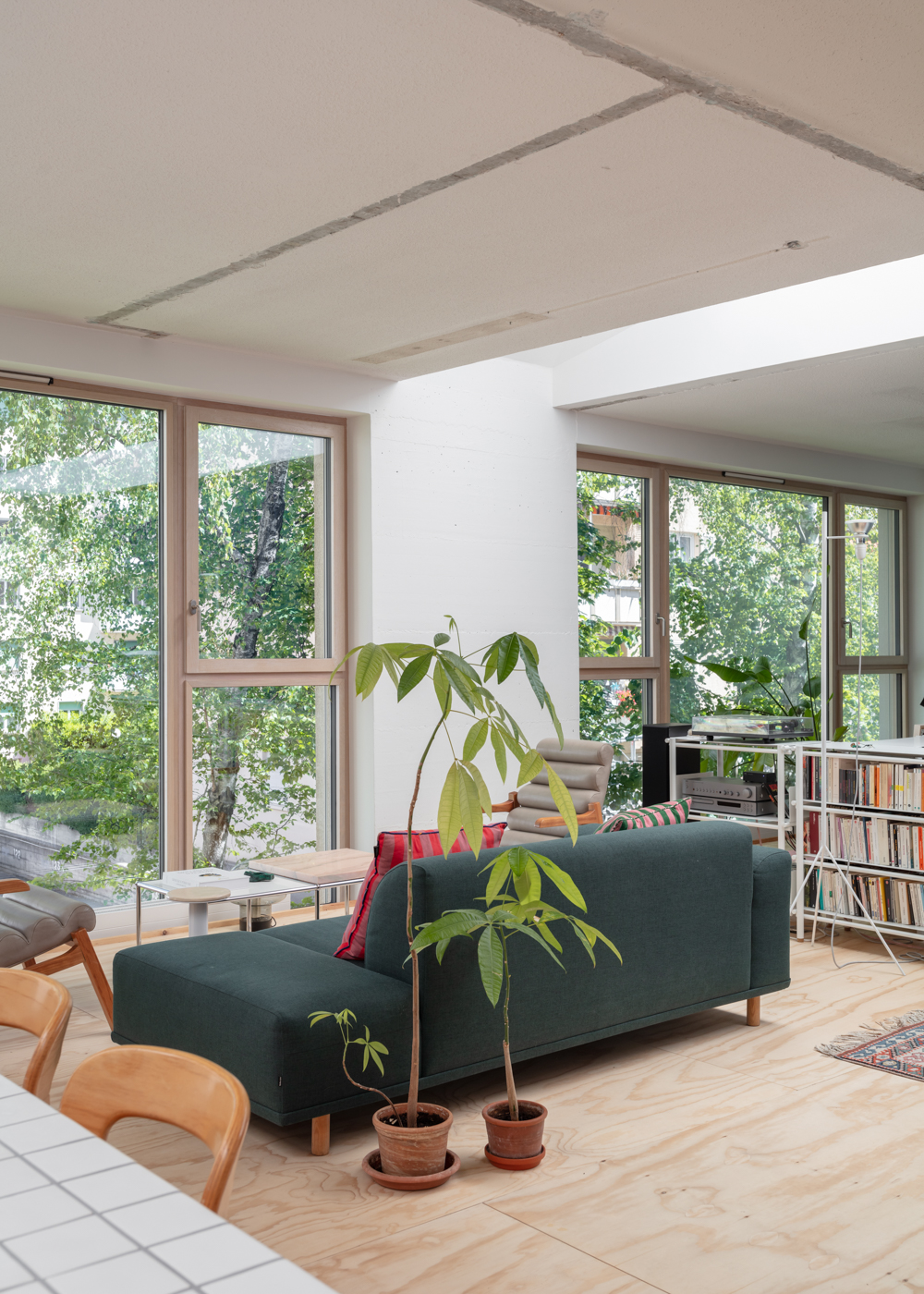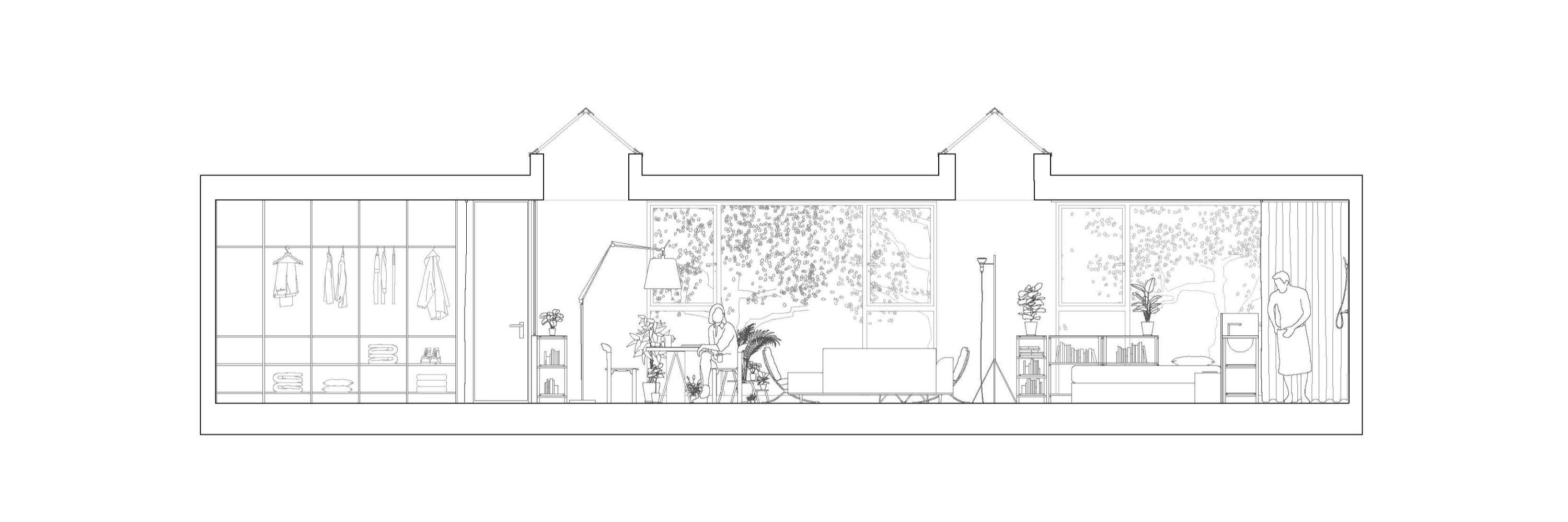 가정과 주택은 이러한 예상되는 삶의 움직임을 어떻게 흡수할까? 건축가 메리 오티스 스티븐스(Mary Otis Stevens)가 인간 생명의 흐름(Flux of Human Life)이 일시적 혹은 영구적으로 그룹화하고 해체하는 모습은 매우 자연스러운 존재 방식이라고 했다. 우리 가정이라는 집단의 구성원으로 순응한다는 것은 공간에 대한 반응이라고 생각하는가? 이 아파트의 경우도 이전에는 치과로 사용되었듯이 ‘끊임없는 변화’에 열린 상태를 유지하여 때에따라 일어날 수 있는 일들을 받아드리려고 했다. 공간적 진화의 가능성에 마주하고 노력했다. 기존의 만들어 놓은 기반이 도움이 된다. 공간은 구조적으로 자유롭다. 북쪽 개구부에 수직으로 놓인 2개의 채광창을 통해 빛이 들어온다.