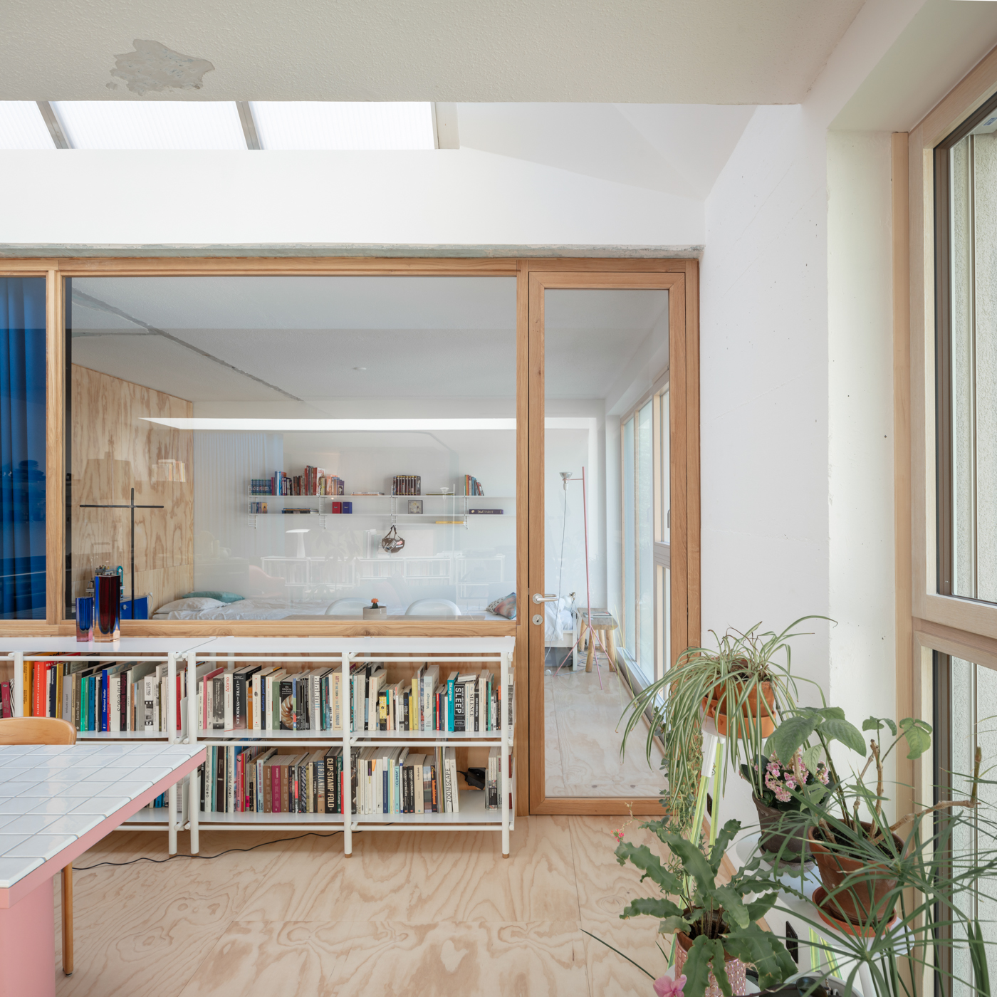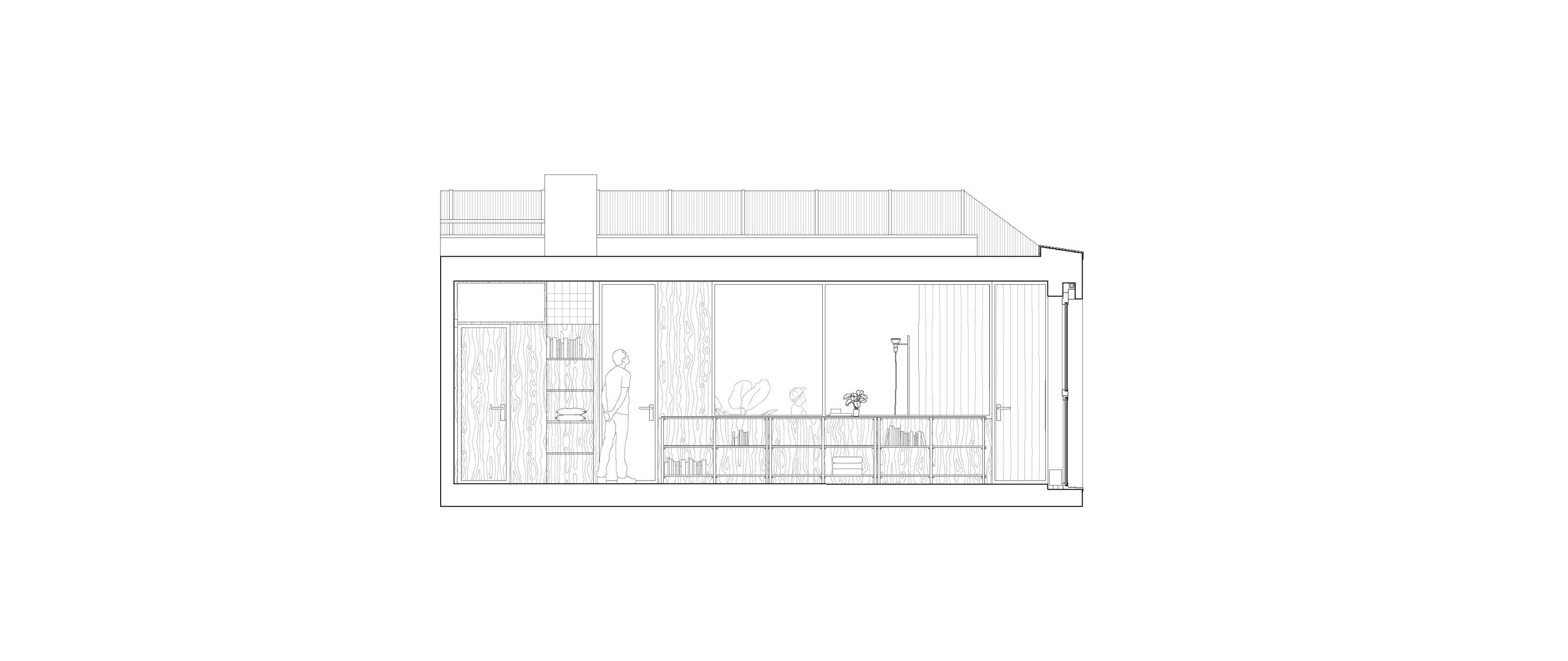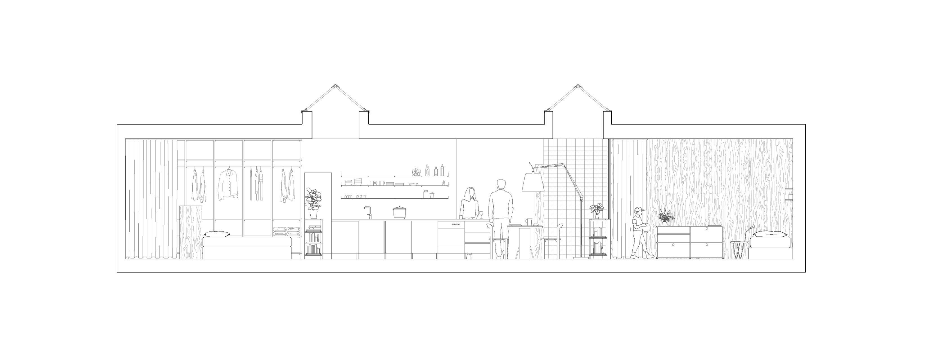 How do homes and houses absorb these expected movements of life? What architect Mary Otis Stevens described as the Flux of Human Life is just our very natural way of being, of grouping and ungrouping temporarily or permanently. Does the elasticity of the inhabitants as a group find spatial responses in our homes? In the case of this apartment, a former dentist cabinet, the attempt is to welcome that “flux” and stay open, to keep the possibilities of spatial evolution exposed to what might happen in time. The existing base helps. The space is structurally free, letting the light in through 2 transversal skylights, perpendicular to the important north-oriented openings.