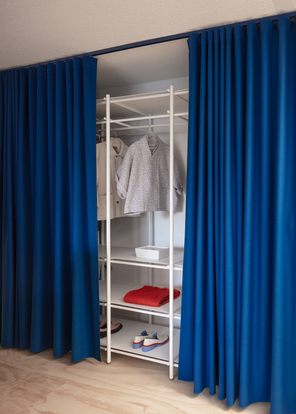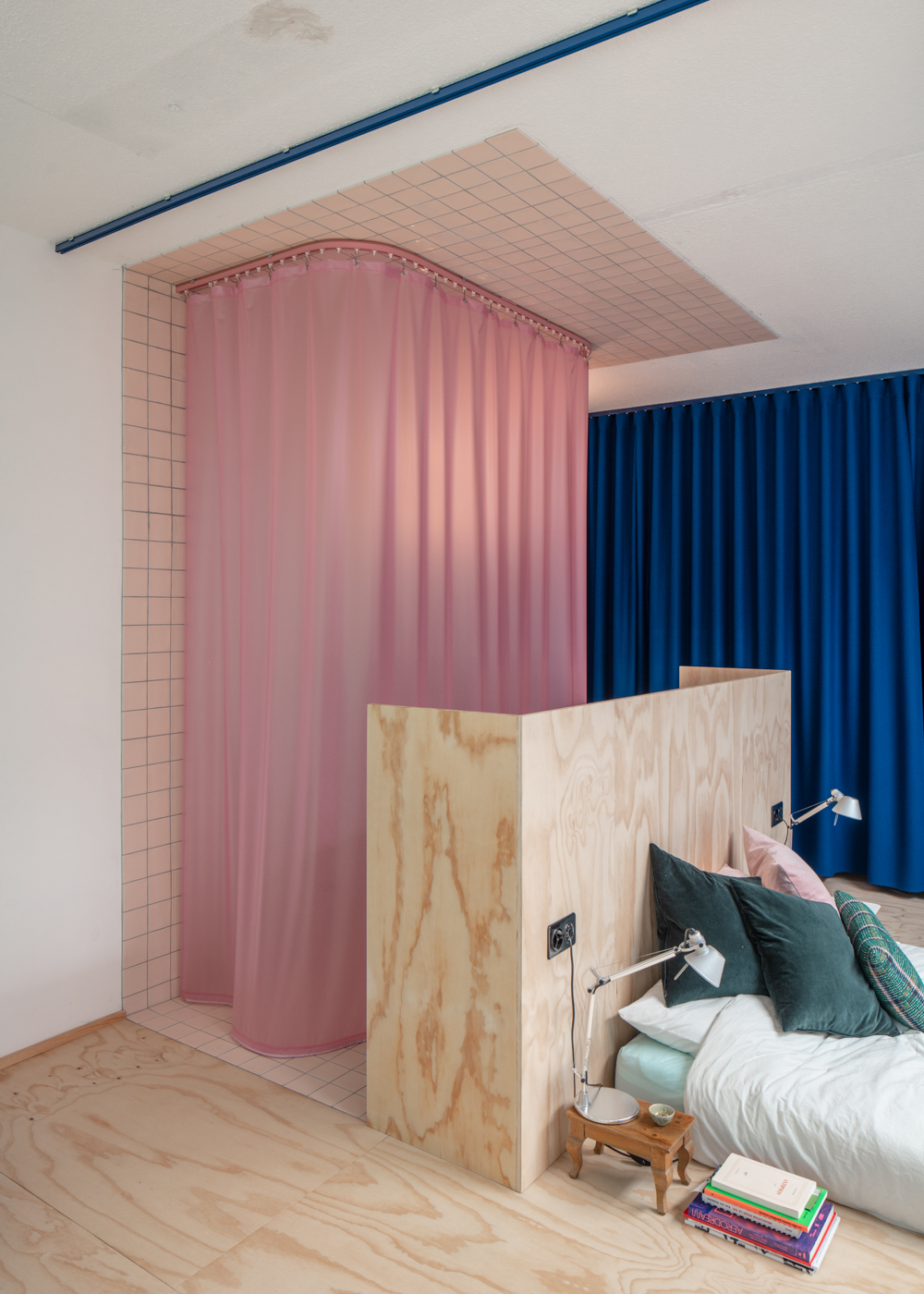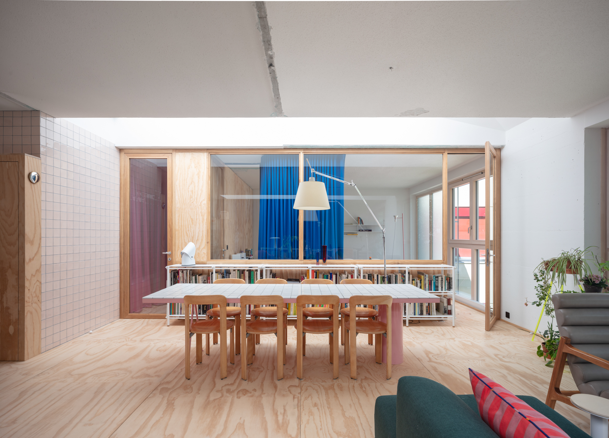 The very idea of openness translates into a physical experience as not much is walled. Spaces, confinement and the needed feeling of gentle enclosures are defined by other means other than partitions. Curtains and glazed surfaces arrange the possibilities of perceiving and impeding, opening, closing and other in-between situations. The full house becomes a sort of perceptive shifting machine as textiles, furniture and light unfold at ease, provoking different situations, visual and experiential. The domestic material experience is mainly wrapped up in industrial wood panels, obsessively used floors and necessary partitions. Furniture, objects, carpets built-in elements, are dealt with as if everything was alive, as a dynamic theater stage without spectators where everything is part of a relation, a conversation, moving and displacing around at any moment. The possibility of disorder is present at all times.