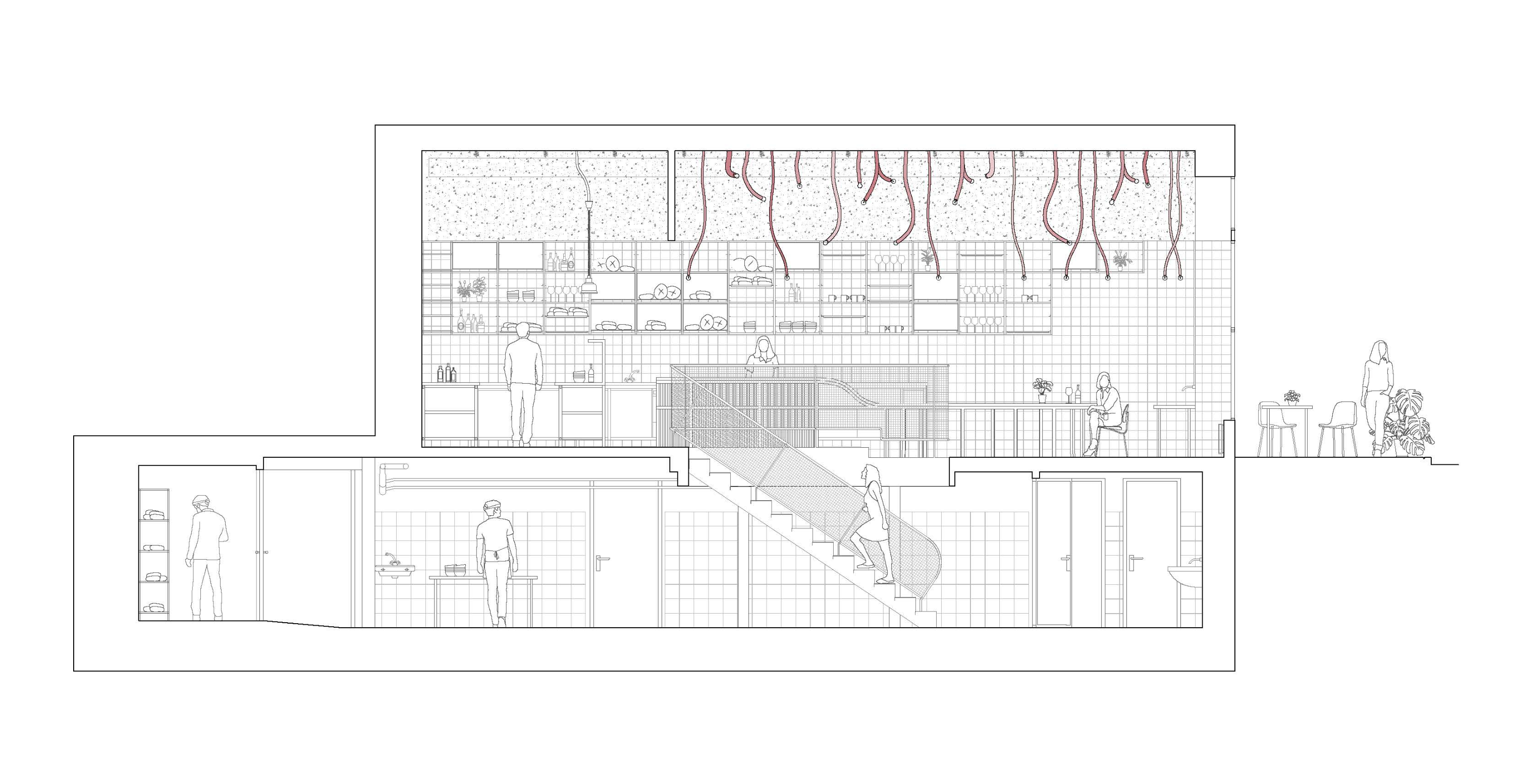 이 프로젝트에서는 우리 삶의 "순간"을 공간화하고 구성했다. 사람들을 비롯하여 모든 것이 물질적이고 무대 같은 테이블 주변을 둘러싼다. 대리석이나 강철 스피드 랙과 같은 전통적인 제빵 도구에 대한 기존의 틀에서 벗어나 새로운 발상은 매우 간단 해졌다. 다양한 구성이 가능한 호스팅 테이블이다. 반은 가정식이고 반은 전문적인 테이블 정식이 어우러져 베이커리에서 식사하는 것이라고 할 수 있다.