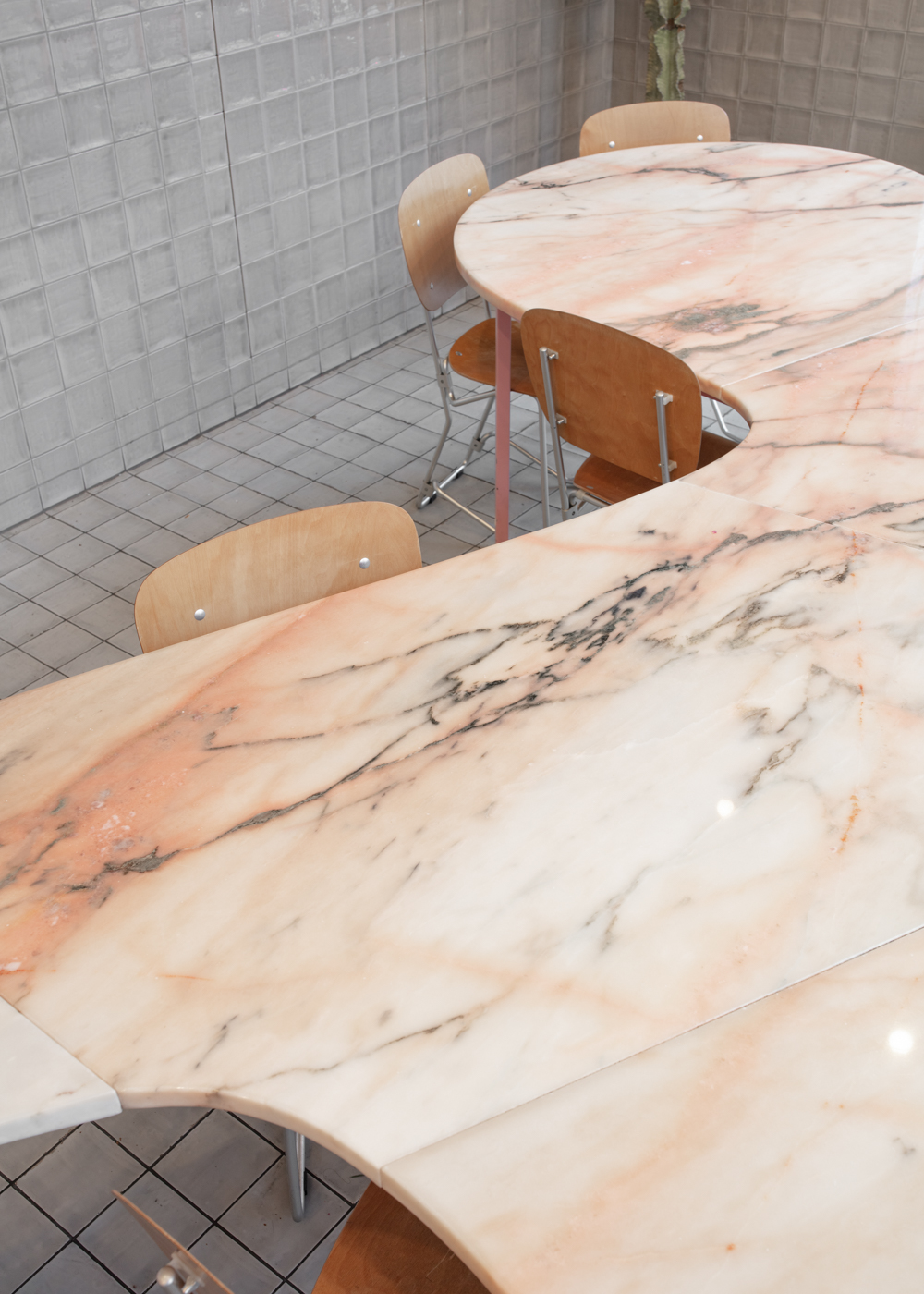 Our project spatialised and constructed this “moment” of our lives and put everything and everyone around a staged and very material table. Beyond the obvious references to traditional bread-making materials like marble and steel speed racks, the idea became quite simple: a hosting table allowing a variety of configurations. Somehow, the set is a half domestic, half professional one, between sharing “table d’hôtes” and dining in the interior of a bakery.