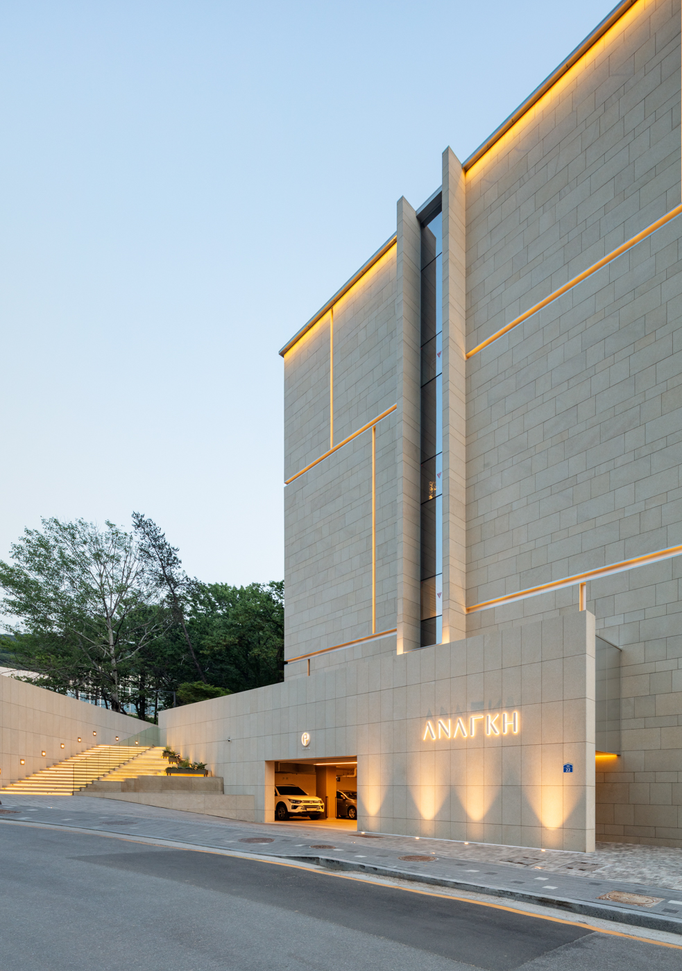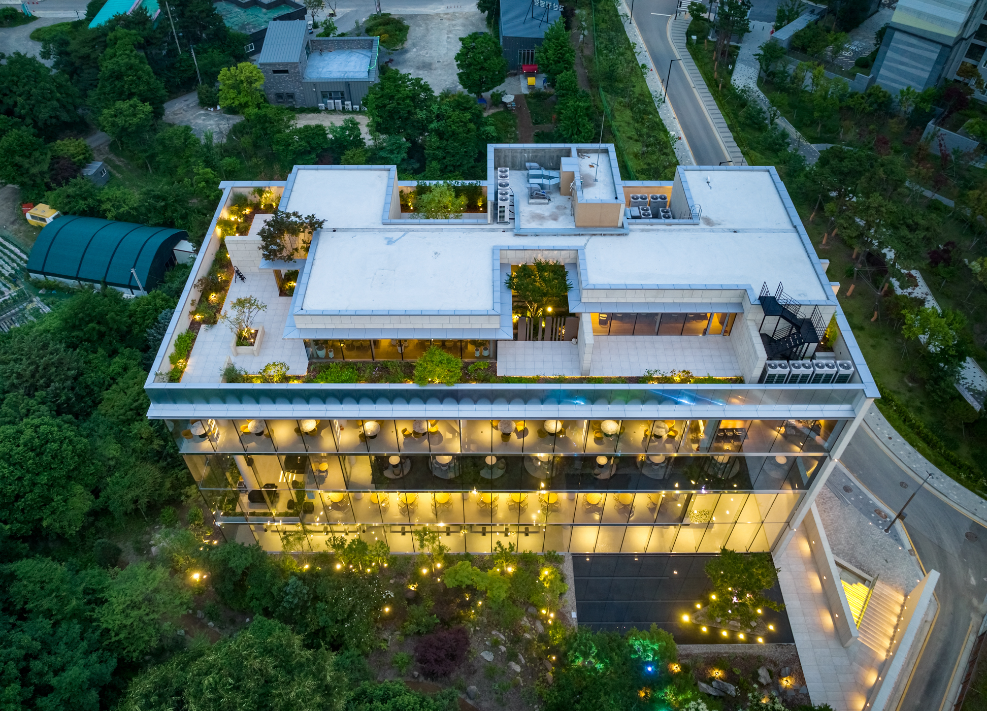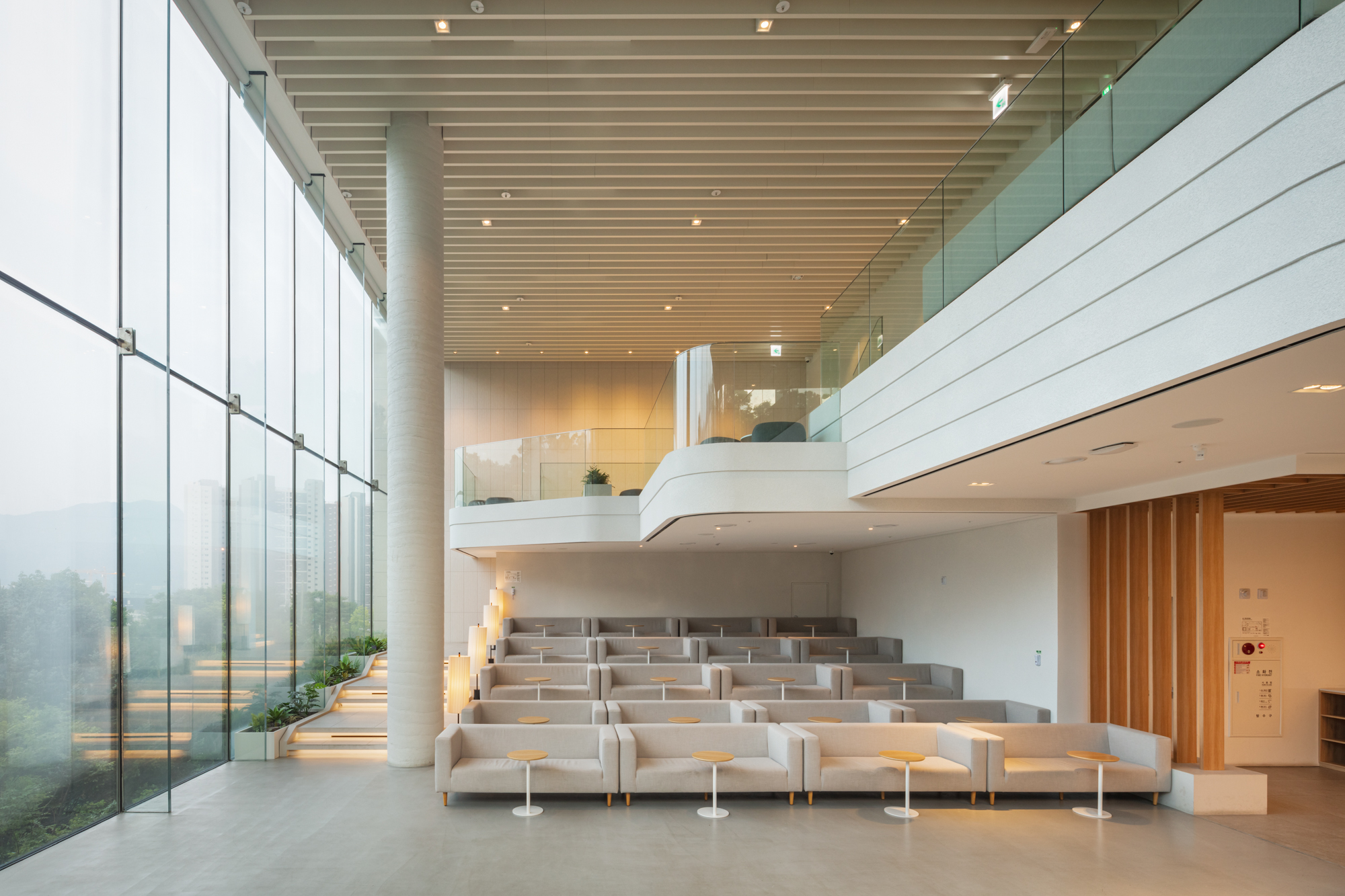 건물은 단순한 장방형의 매스다. 남측과 동측의 전면 유리로 시야가 열려 푸르게 조성된 녹음을 마주할 수 있다. 북서 측으로는 아파트 단지가 위치해 있는데, 시야를 차단하고 녹음을 향한 온전한 휴식을 위해 솔리드 벽체로 마감했다. 방문객들은 서측의 입면을 바라보며 접근하게 된다. 최소한의 오프닝을 제외하고 차단된 벽체의 사비석 마감에서는 석재 모듈을 다시 큰 스케일로 분할하였다. 이로 인해 마치 거대한 자연의 바위를 마주하는 것처럼 웅장함을 드러낸다. 지하 1층의 부 출입구와 주차 진입로를 지나 북동 측의 진입 계단을 마주하면, 좌우의 벽으로 시야를 차단하고 연결된 계단식 수공간을 바라보며 위로 오르게 된다. 이렇듯 계단 상부에 다다를수록 시야가 열리면서 건물의 모습이 서서히 드러나게 된다. 거대한 매스 한가운데를 가르는 주 출입구로 들어서면, 이번에는 내부에서 외부로 향하는 경치를 전면 창을 통해 감상할 수 있다.