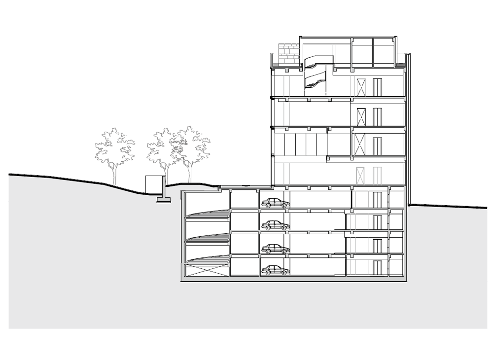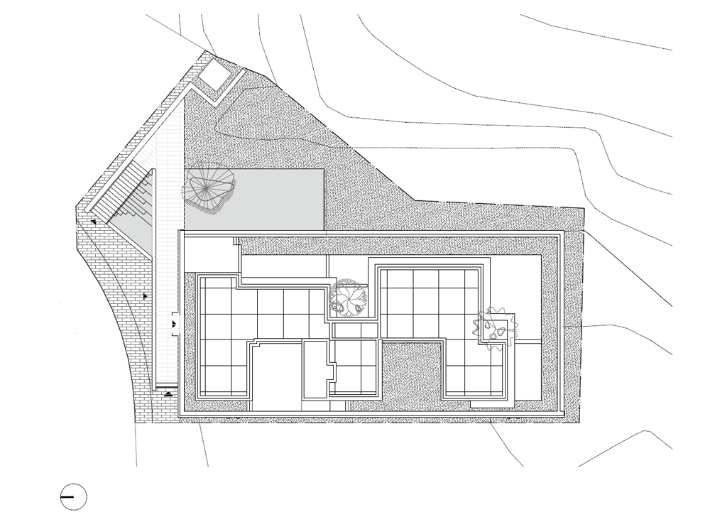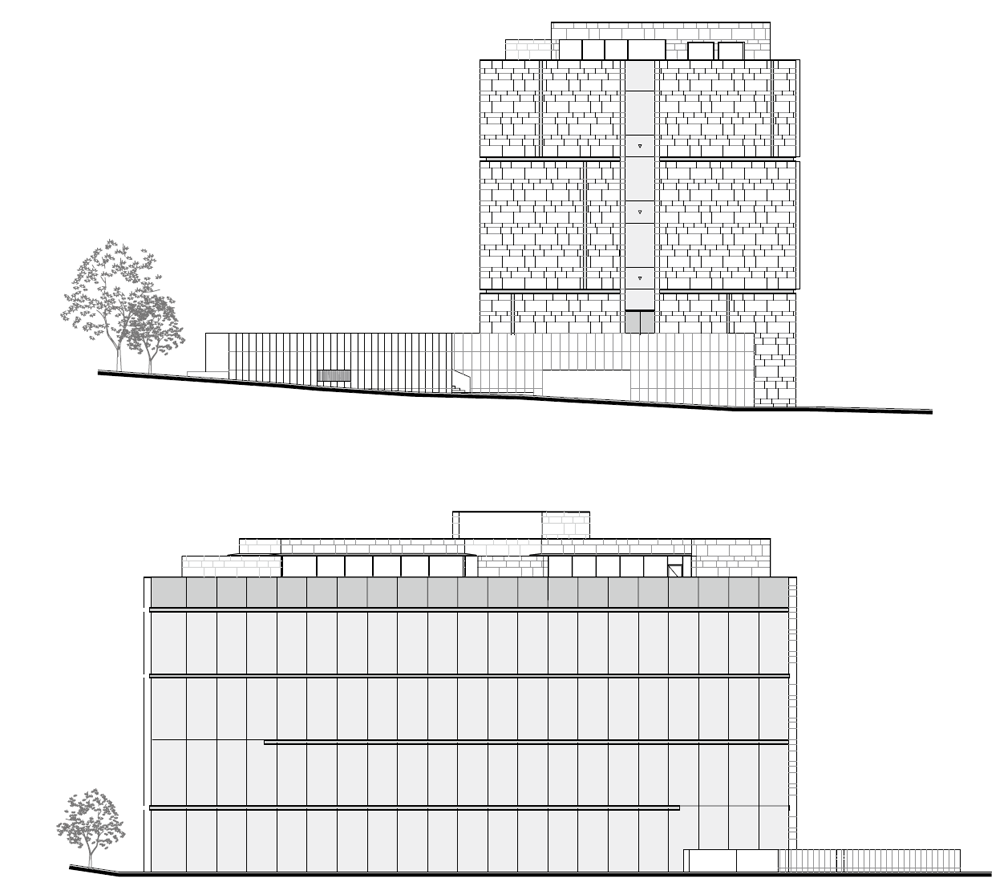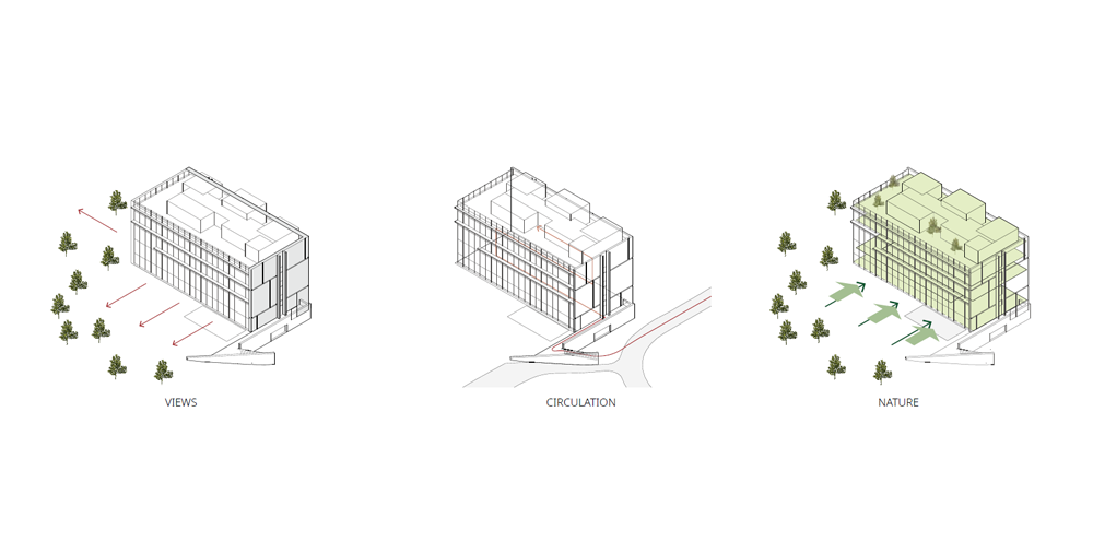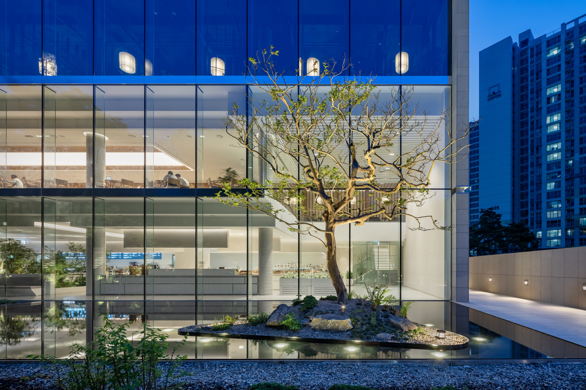 건물은 단순한 장방형의 매스다. 남측과 동측의 전면 유리로 시야가 열려 푸르게 조성된 녹음을 마주할 수 있다. 북서 측으로는 아파트 단지가 위치해 있는데, 시야를 차단하고 녹음을 향한 온전한 휴식을 위해 솔리드 벽체로 마감했다. 방문객들은 서측의 입면을 바라보며 접근하게 된다. 최소한의 오프닝을 제외하고 차단된 벽체의 사비석 마감에서는 석재 모듈을 다시 큰 스케일로 분할하였다. 이로 인해 마치 거대한 자연의 바위를 마주하는 것처럼 웅장함을 드러낸다. 지하 1층의 부 출입구와 주차 진입로를 지나 북동 측의 진입 계단을 마주하면, 좌우의 벽으로 시야를 차단하고 연결된 계단식 수공간을 바라보며 위로 오르게 된다. 이렇듯 계단 상부에 다다를수록 시야가 열리면서 건물의 모습이 서서히 드러나게 된다. 거대한 매스 한가운데를 가르는 주 출입구로 들어서면, 이번에는 내부에서 외부로 향하는 경치를 전면 창을 통해 감상할 수 있다.