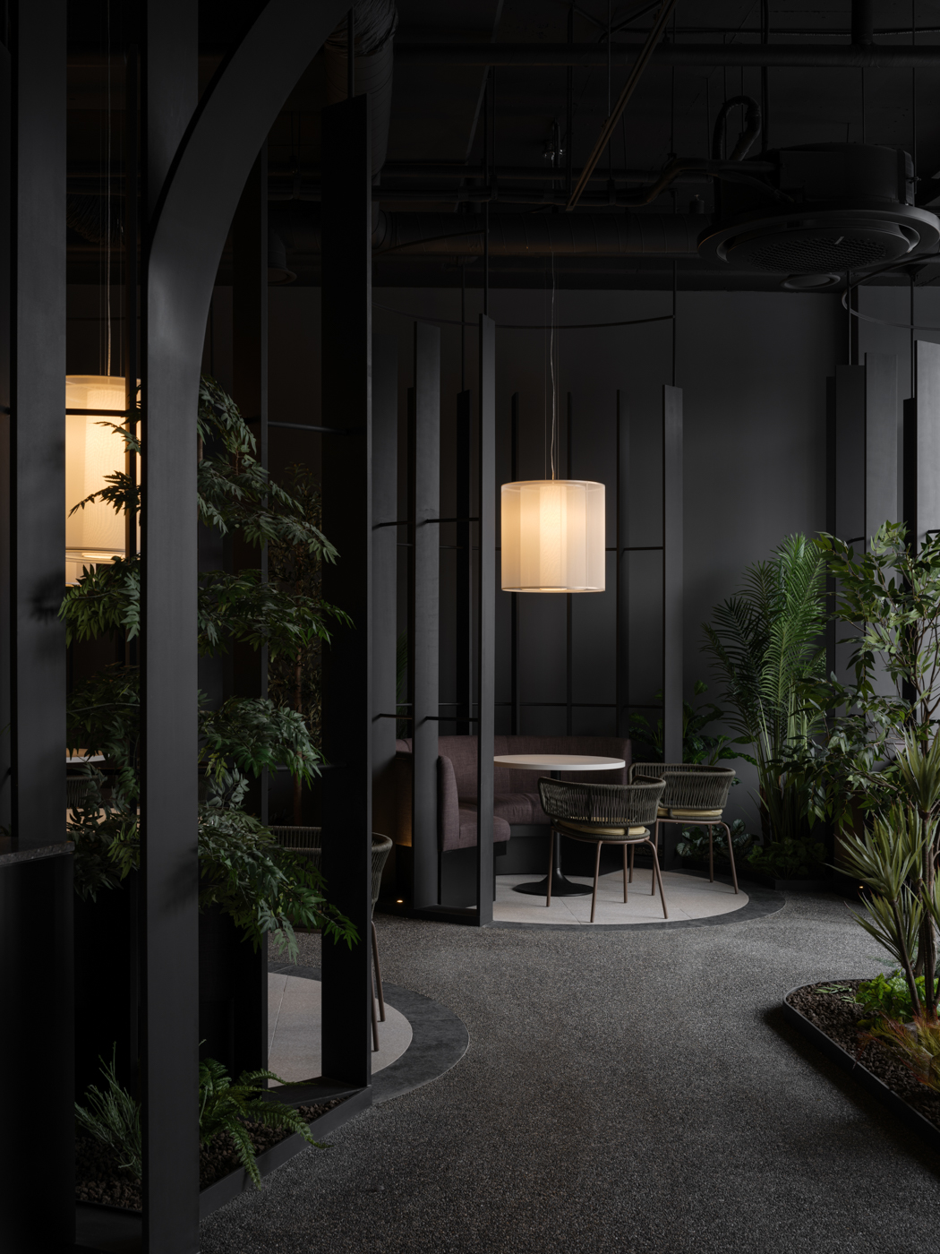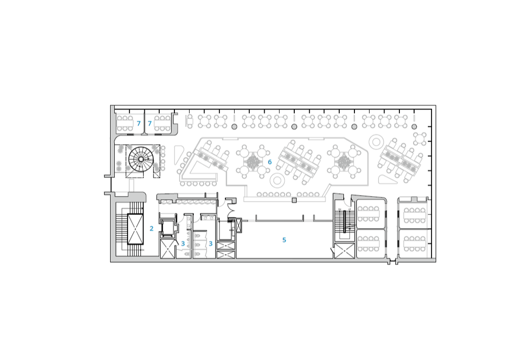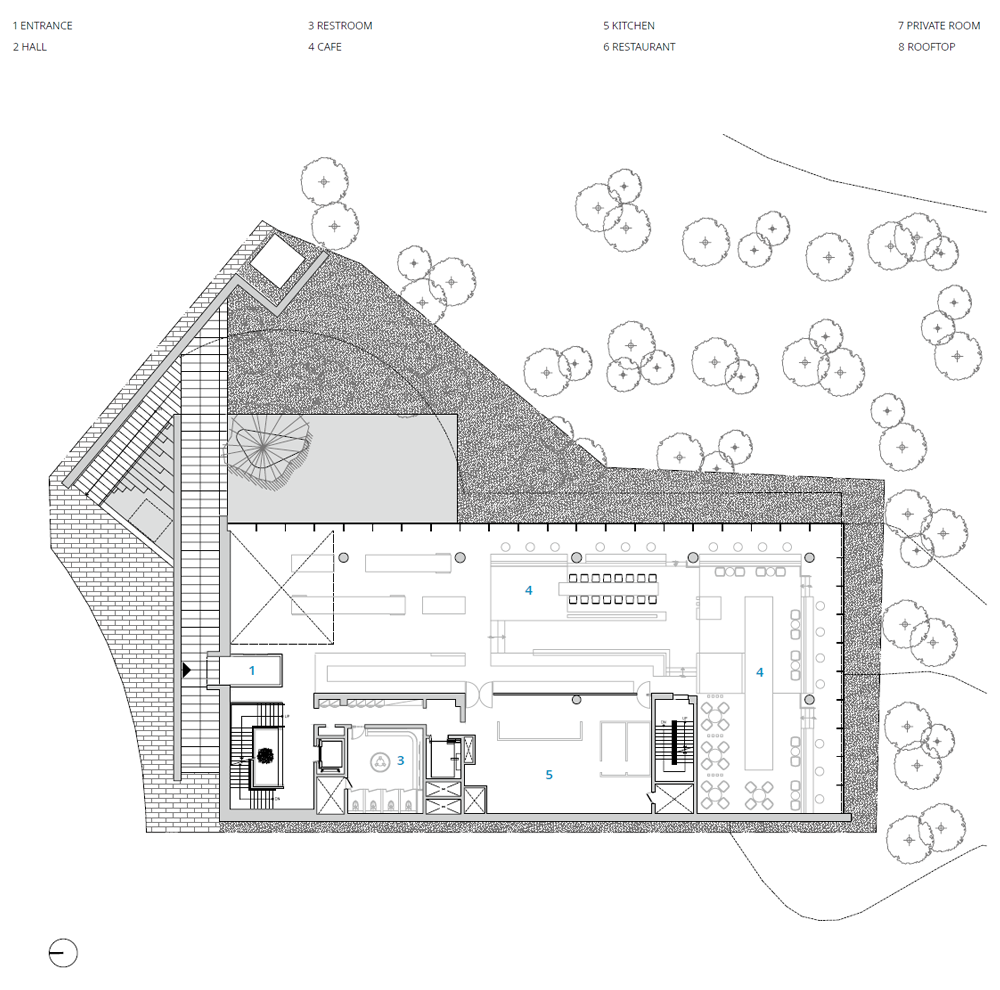 아나키아 카페 레스토랑의 1층부터 3층까지는 카페, 4층과 5층은 레스토랑으로 구성되어 있다. 각각의 카페는 서로 다른 인테리어 콘셉트를 가지고 있어, 방문객들이 층을 오르며 다른 경험을 하도록 의도하였다. 1층은 푸르른 녹음과 함께 수공간의 모습을 감상할 수 있으며, 플랜테리어를 활용한 2층은 내부의 식재와 외부의 자연이 소통한다. 2층과 3층 사이에 자리 잡은 복층의 카페는 경관이 가장 좋은 남동 측 코너를 향해 열려, 미술과 음악, 전시 등 문화 체험을 할 수 있다. 3층은 프라이버시를 유지하며 식음을 즐길 수 있는 공간, 4층과 5층은 루프톱 조경과 연계한 레스토랑을 마련했다.