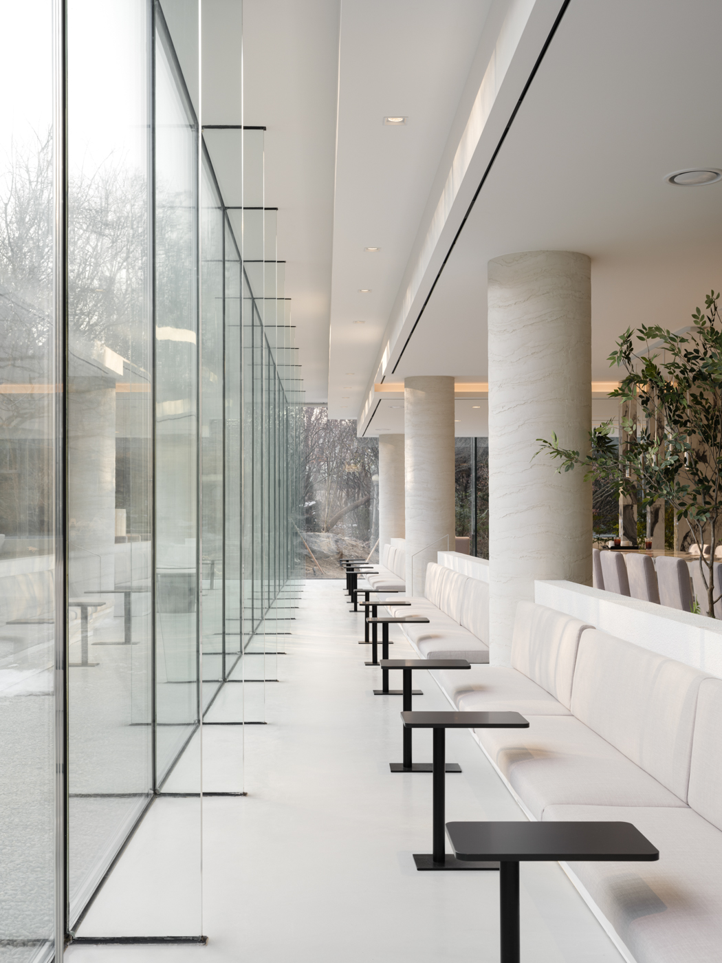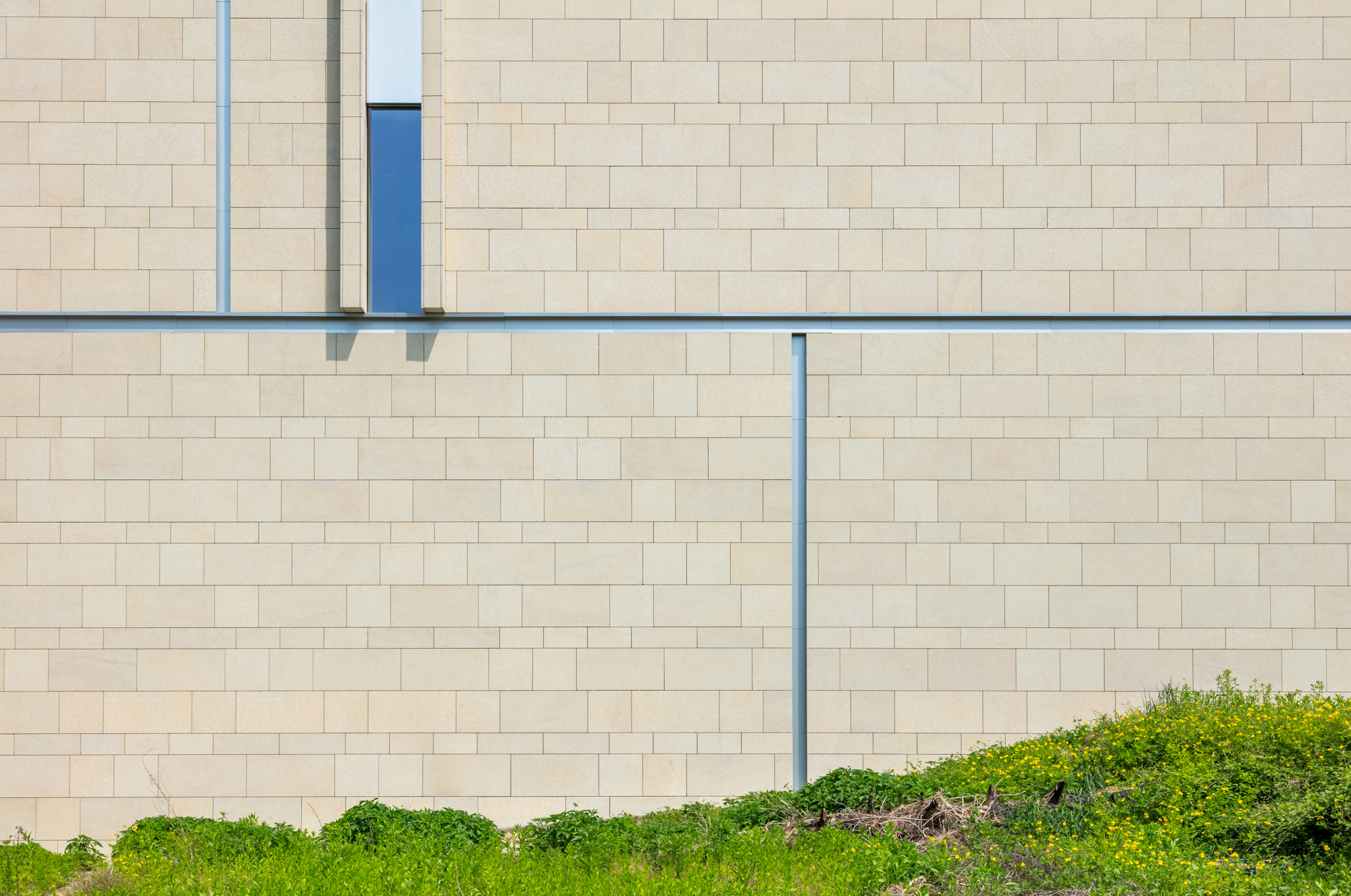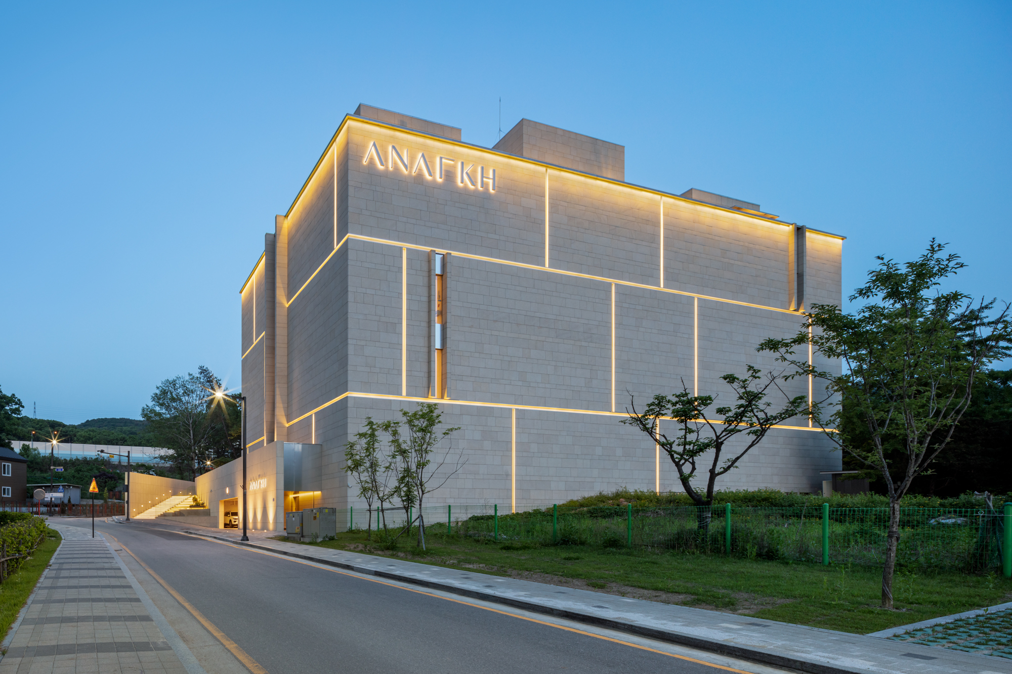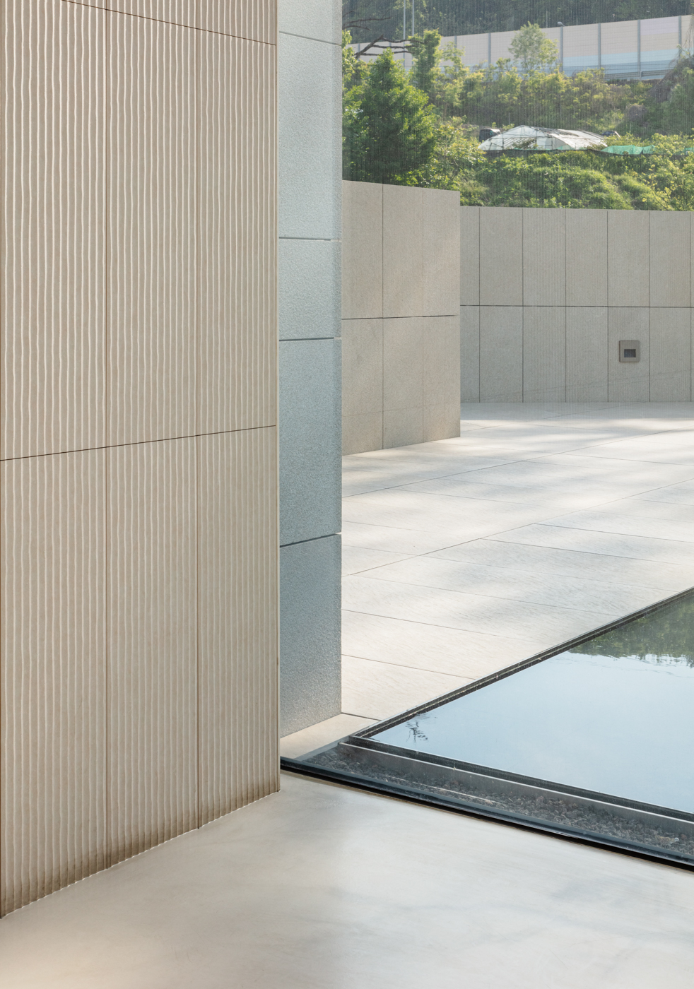 건물은 단순한 장방형의 매스다. 남측과 동측의 전면 유리로 시야가 열려 푸르게 조성된 녹음을 마주할 수 있다. 북서 측으로는 아파트 단지가 위치해 있는데, 시야를 차단하고 녹음을 향한 온전한 휴식을 위해 솔리드 벽체로 마감했다. 방문객들은 서측의 입면을 바라보며 접근하게 된다. 최소한의 오프닝을 제외하고 차단된 벽체의 사비석 마감에서는 석재 모듈을 다시 큰 스케일로 분할하였다. 이로 인해 마치 거대한 자연의 바위를 마주하는 것처럼 웅장함을 드러낸다. 지하 1층의 부 출입구와 주차 진입로를 지나 북동 측의 진입 계단을 마주하면, 좌우의 벽으로 시야를 차단하고 연결된 계단식 수공간을 바라보며 위로 오르게 된다. 이렇듯 계단 상부에 다다를수록 시야가 열리면서 건물의 모습이 서서히 드러나게 된다. 거대한 매스 한가운데를 가르는 주 출입구로 들어서면, 이번에는 내부에서 외부로 향하는 경치를 전면 창을 통해 감상할 수 있다.