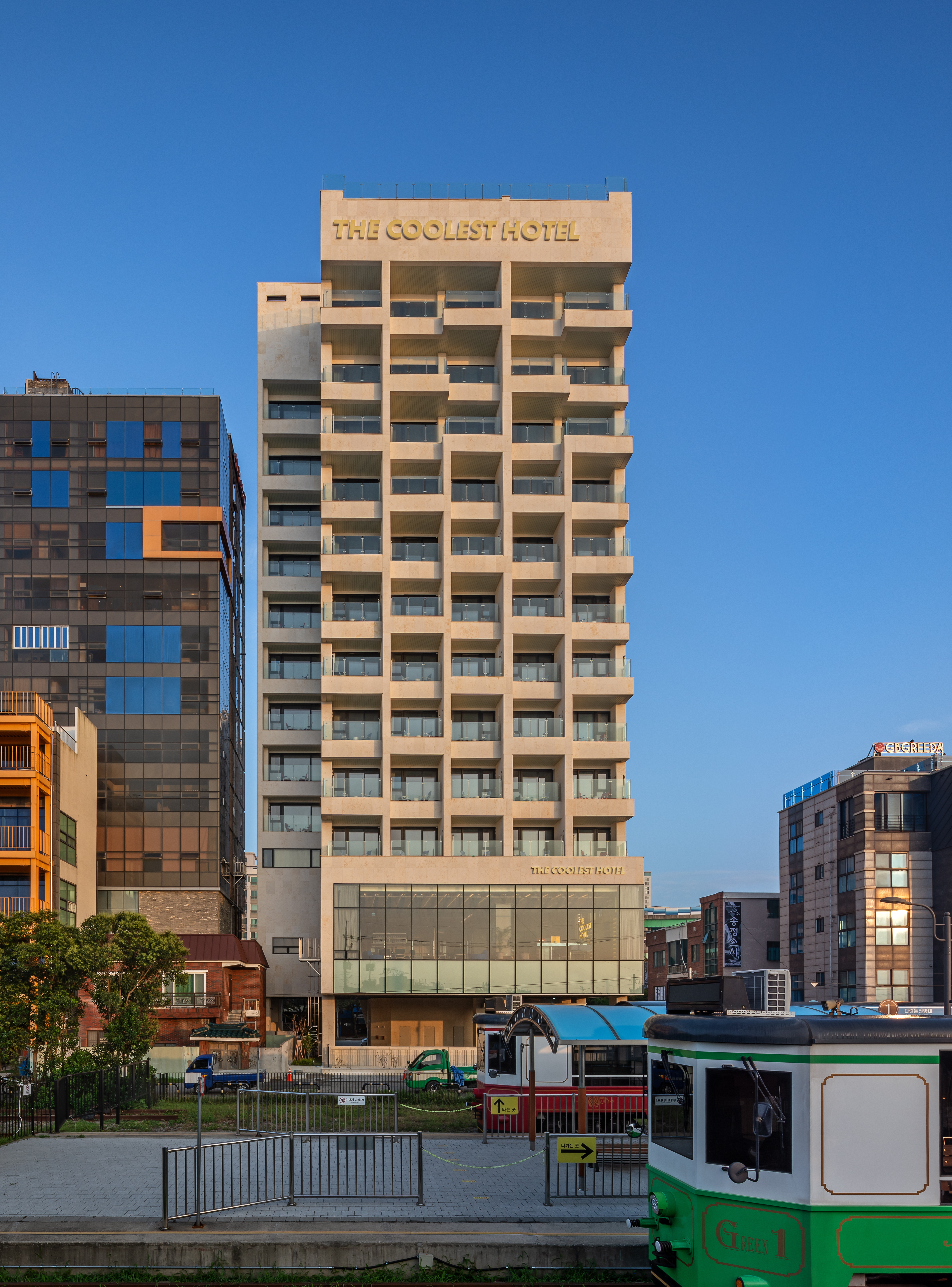 더 쿨리스트 호텔은 부산의 대표적인 관광지로 부상하고 있는 송정동에 위치하며 송정 해수욕장과 인접하고 있다. 송정 해안가는 사계절 내내 서핑이 가능한 온후한 기온으로 해안가 주변으로 서핑 관련 시설과 호텔이 밀집한 곳이다. 건축가는 자연환경을 기반으로 하는 호텔 건축을 진행하며 바다와 도시의 사이에서 건축 계획과 경제성에 대한 가중치를 나누었다. 결과적으로 전 객실의 오션 뷰를 적용하는 대신, 도시를 향한 입면은 닫힌 형태가 되었다. 동시에 ‘광어골 거리’라는 인접 관광지의 관계성을 고려하여 도시 측 입면에 폴딩을 활용하여 보다 입체적인 조형을 도입하고 지역 경관 형성에 의미를 담고자 했다.