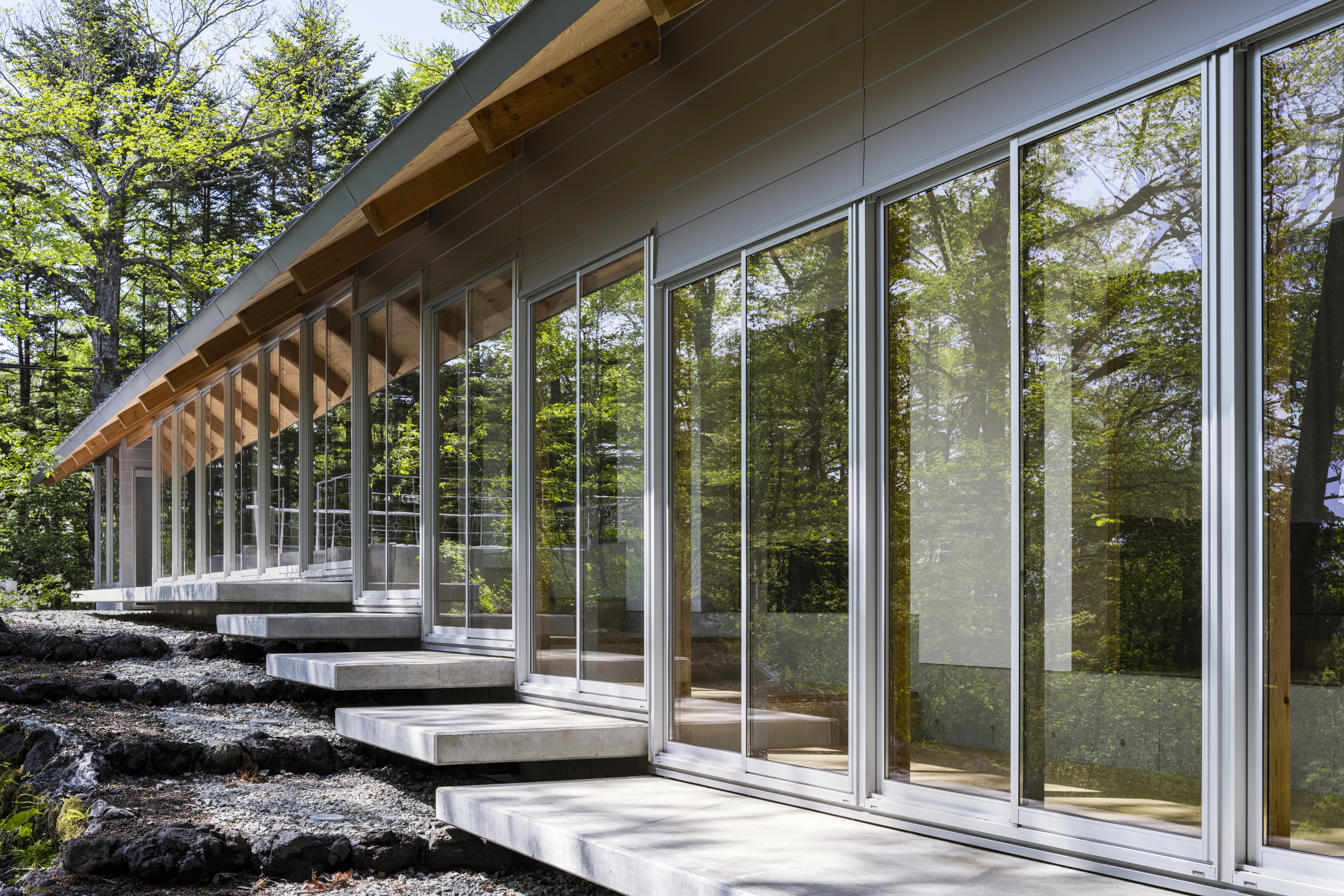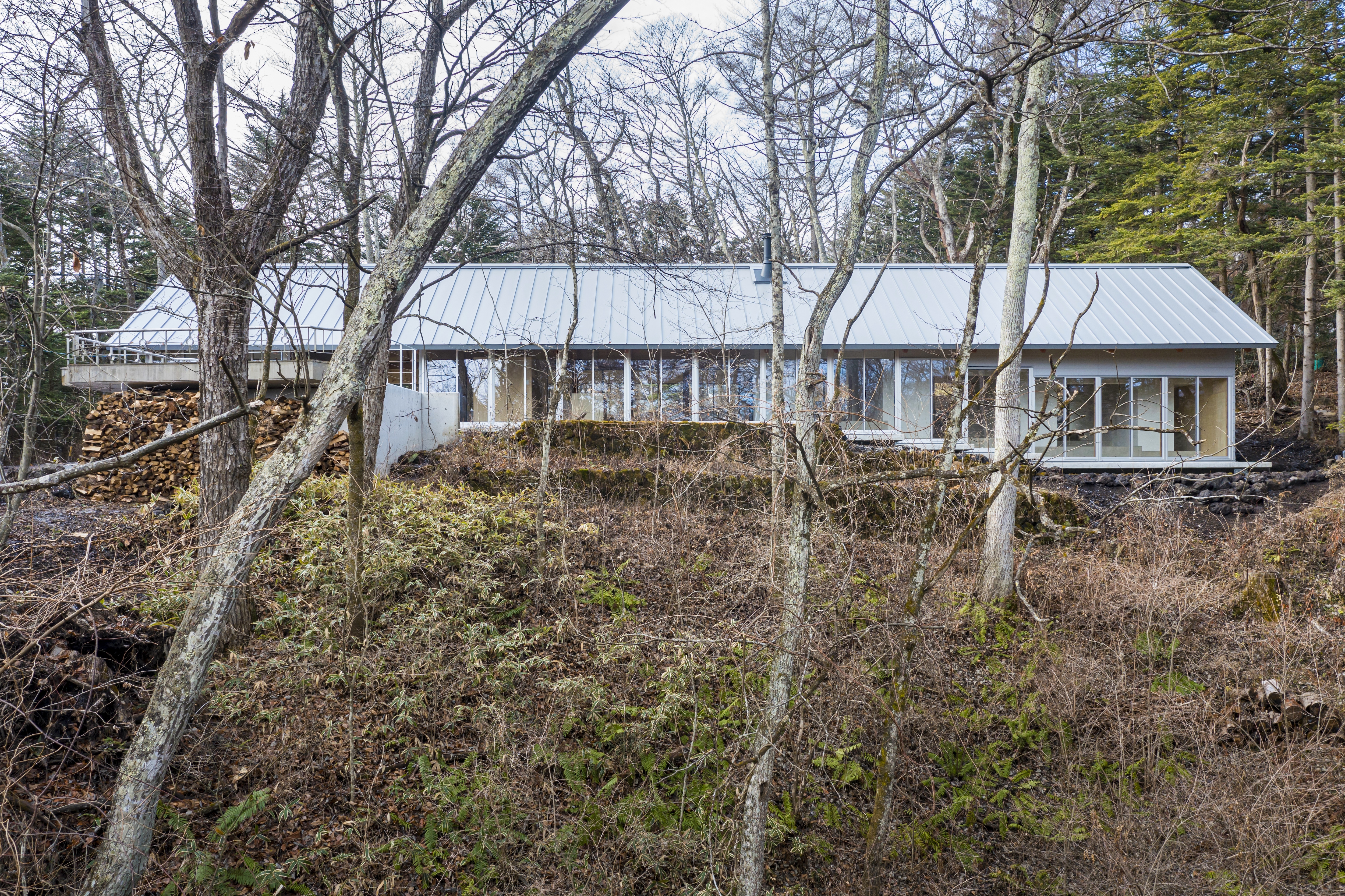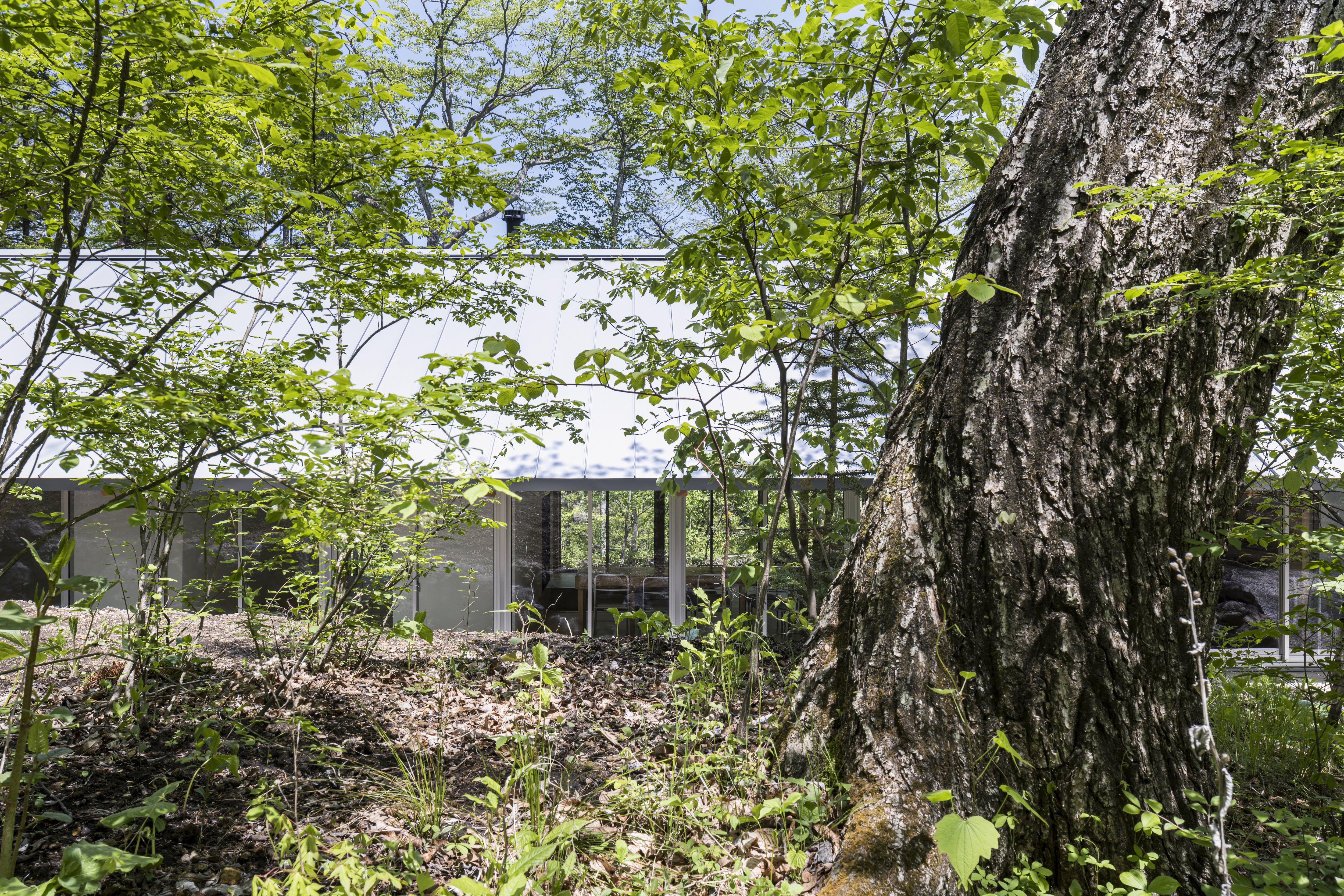 카루이자와의 별장은 네 가족의 열네 명이 함께하는 별장을 재건한 계획이다. 광대한 숲에 자리하여 주변의 집들도 보이지 않는 곳에 있다. 건축주는 이 지역에서 오랜 기간 별장을 소유하며 수많은 경험을 쌓았다. 여름에는 계곡 아래 시내에서 수박을 식히고, 가을에는 숲으로 나가 밤(栗)을 모았다. 건축주는 매년 여름휴가 일주일 동안 식사를 해 먹고, 빨래하고, 청소하면서 다른 사람과 함께 공존하는 경험을 ‘훈련소와 같다’고 표현했다. 그래서 디자인은 ‘숲으로 나가기’와 ‘훈련소 같은 느낌’의 두 가지 경험을 기반으로 하였다. 동쪽으로 경사지는 숲과 최대한 많은 접점을 가지기 위해 남북으로 길고 좁게 부지를 설정했다. 약 30m 길이의 길고 가느다란 형태의 매스는 기존 건축물이 있던 평지를 벗어난 경사 지대에 배치했고, 평지와 경사 사이의 최대 1m 수준의 높이 차이를 활용했다. 건축가는 어디서든 숲에 접근할 수 있도록 건물의 긴 면을 알루미늄 창문으로 계획하여 숲과 함께 사는 가족의 경험을 아우르는 공간을 만들었다.