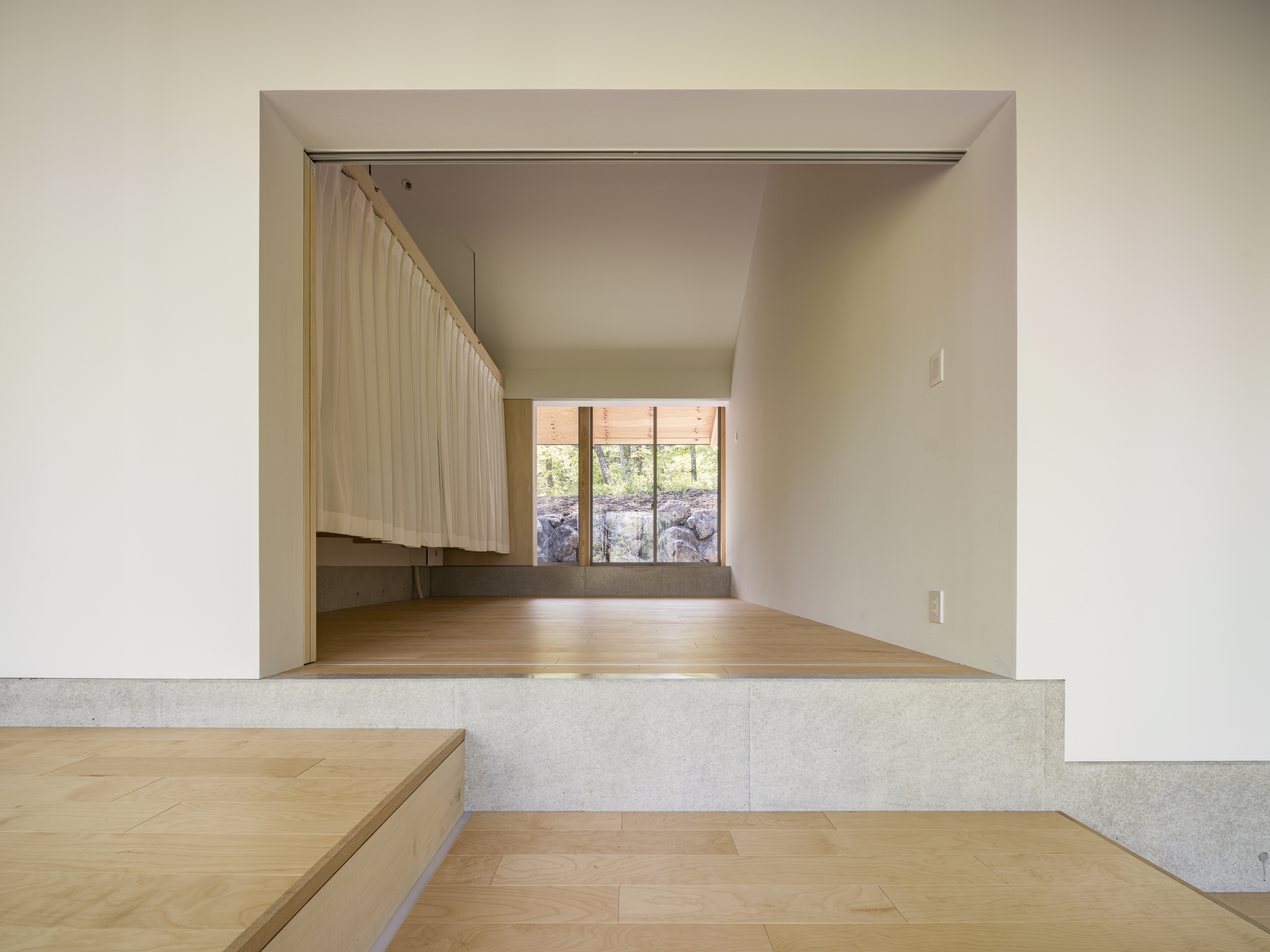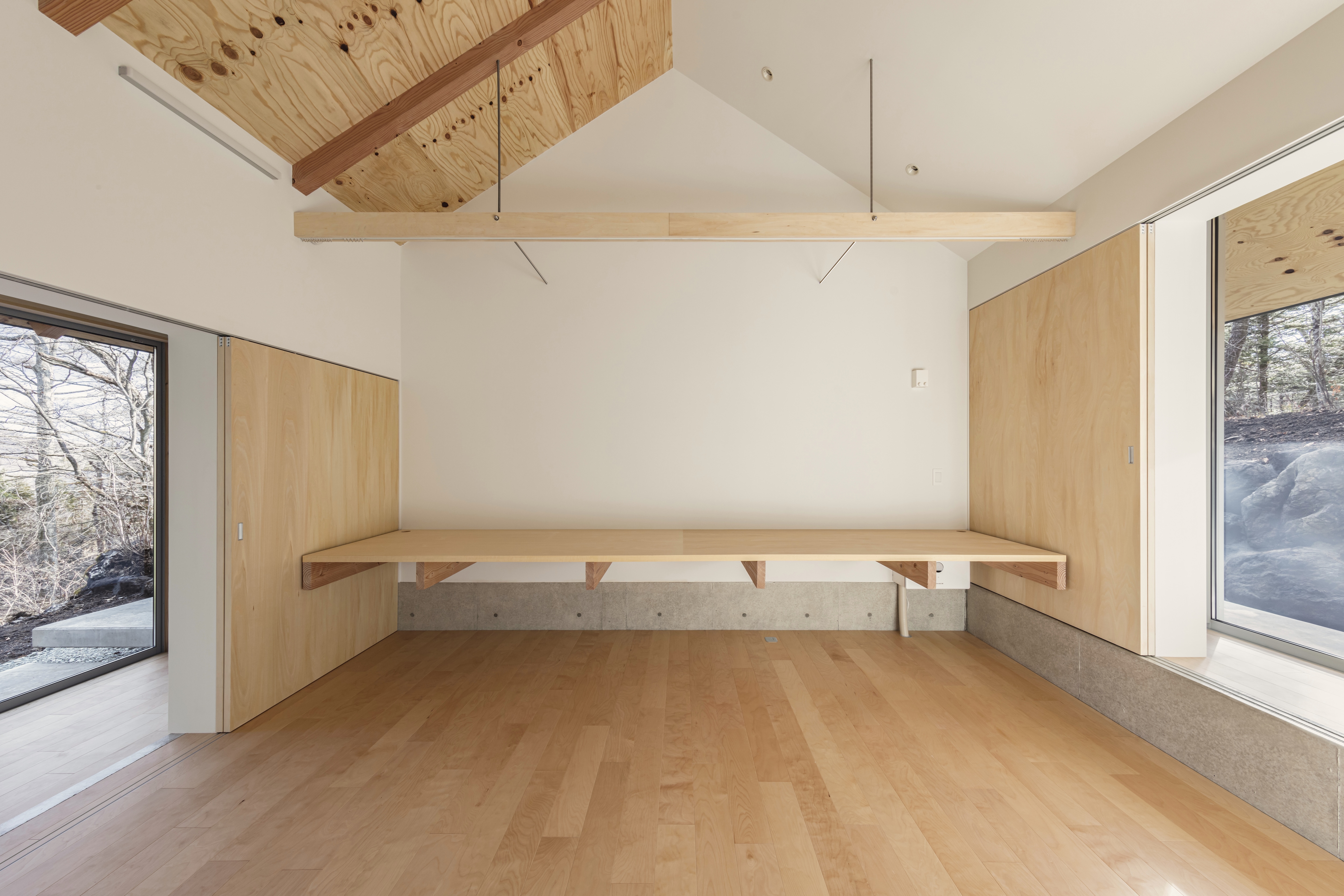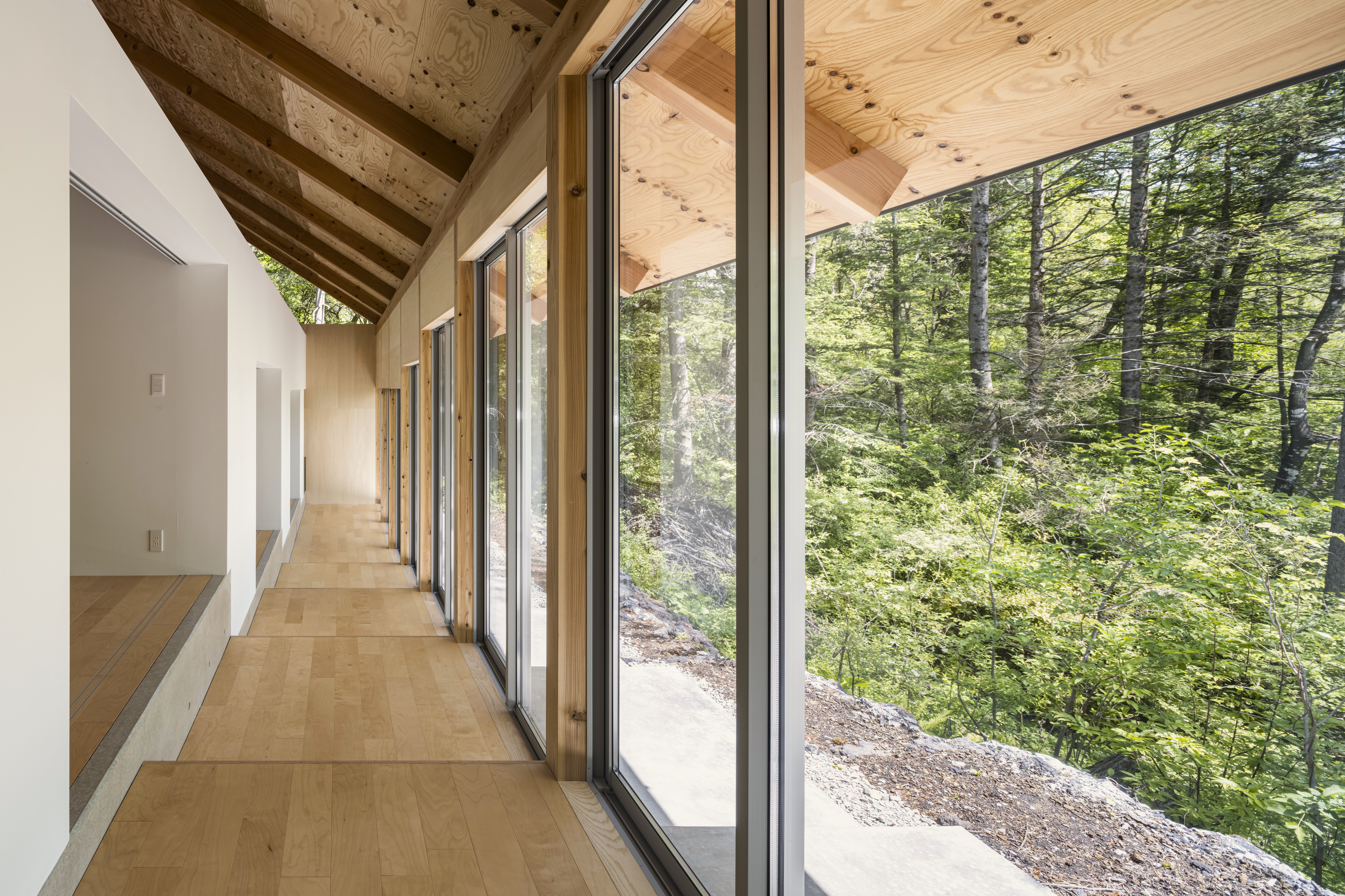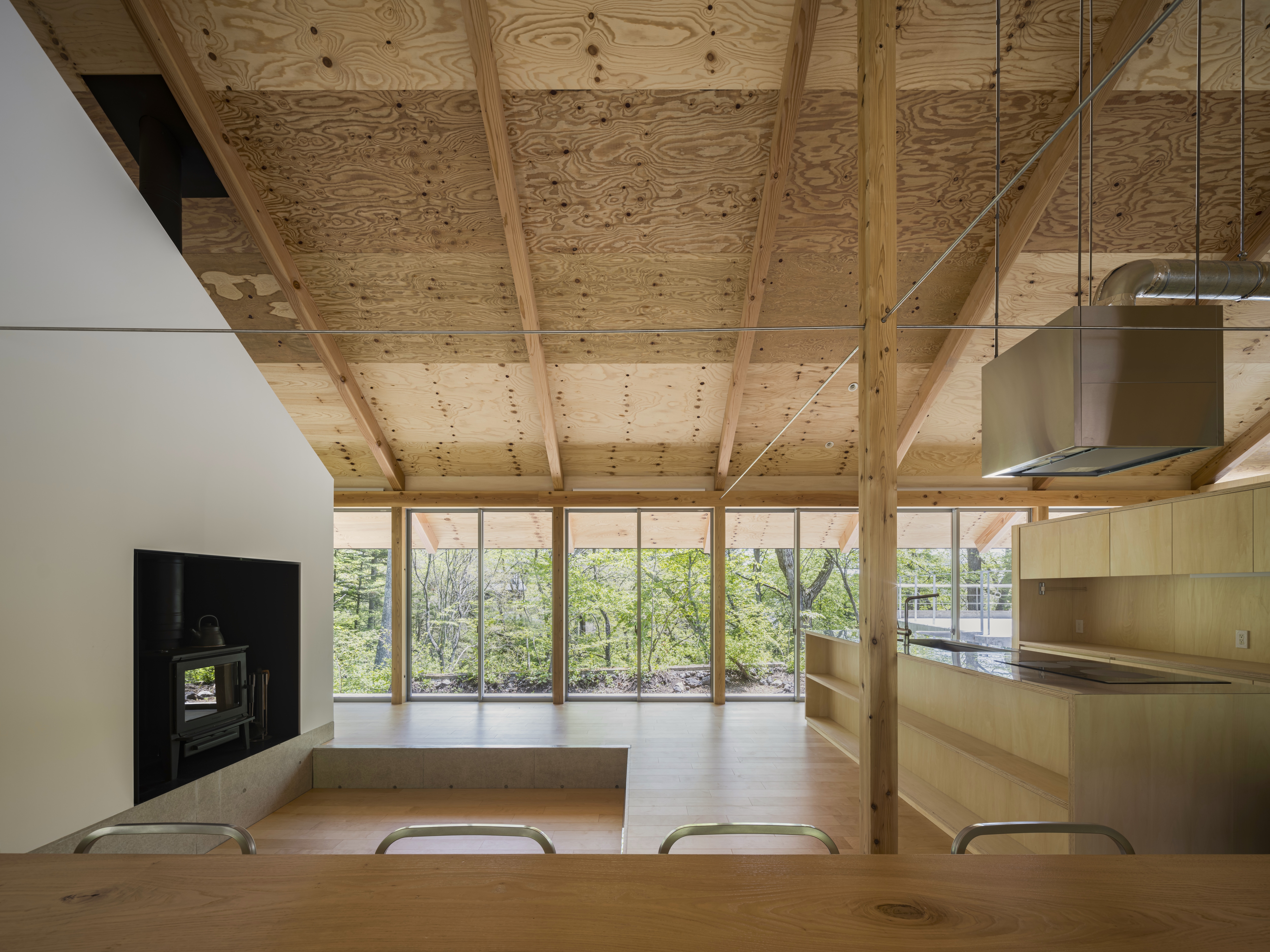 카루이자와의 별장은 네 가족의 열네 명이 함께하는 별장을 재건한 계획이다. 광대한 숲에 자리하여 주변의 집들도 보이지 않는 곳에 있다. 건축주는 이 지역에서 오랜 기간 별장을 소유하며 수많은 경험을 쌓았다. 여름에는 계곡 아래 시내에서 수박을 식히고, 가을에는 숲으로 나가 밤(栗)을 모았다. 건축주는 매년 여름휴가 일주일 동안 식사를 해 먹고, 빨래하고, 청소하면서 다른 사람과 함께 공존하는 경험을 ‘훈련소와 같다’고 표현했다. 그래서 디자인은 ‘숲으로 나가기’와 ‘훈련소 같은 느낌’의 두 가지 경험을 기반으로 하였다. 동쪽으로 경사지는 숲과 최대한 많은 접점을 가지기 위해 남북으로 길고 좁게 부지를 설정했다. 약 30m 길이의 길고 가느다란 형태의 매스는 기존 건축물이 있던 평지를 벗어난 경사 지대에 배치했고, 평지와 경사 사이의 최대 1m 수준의 높이 차이를 활용했다. 건축가는 어디서든 숲에 접근할 수 있도록 건물의 긴 면을 알루미늄 창문으로 계획하여 숲과 함께 사는 가족의 경험을 아우르는 공간을 만들었다.