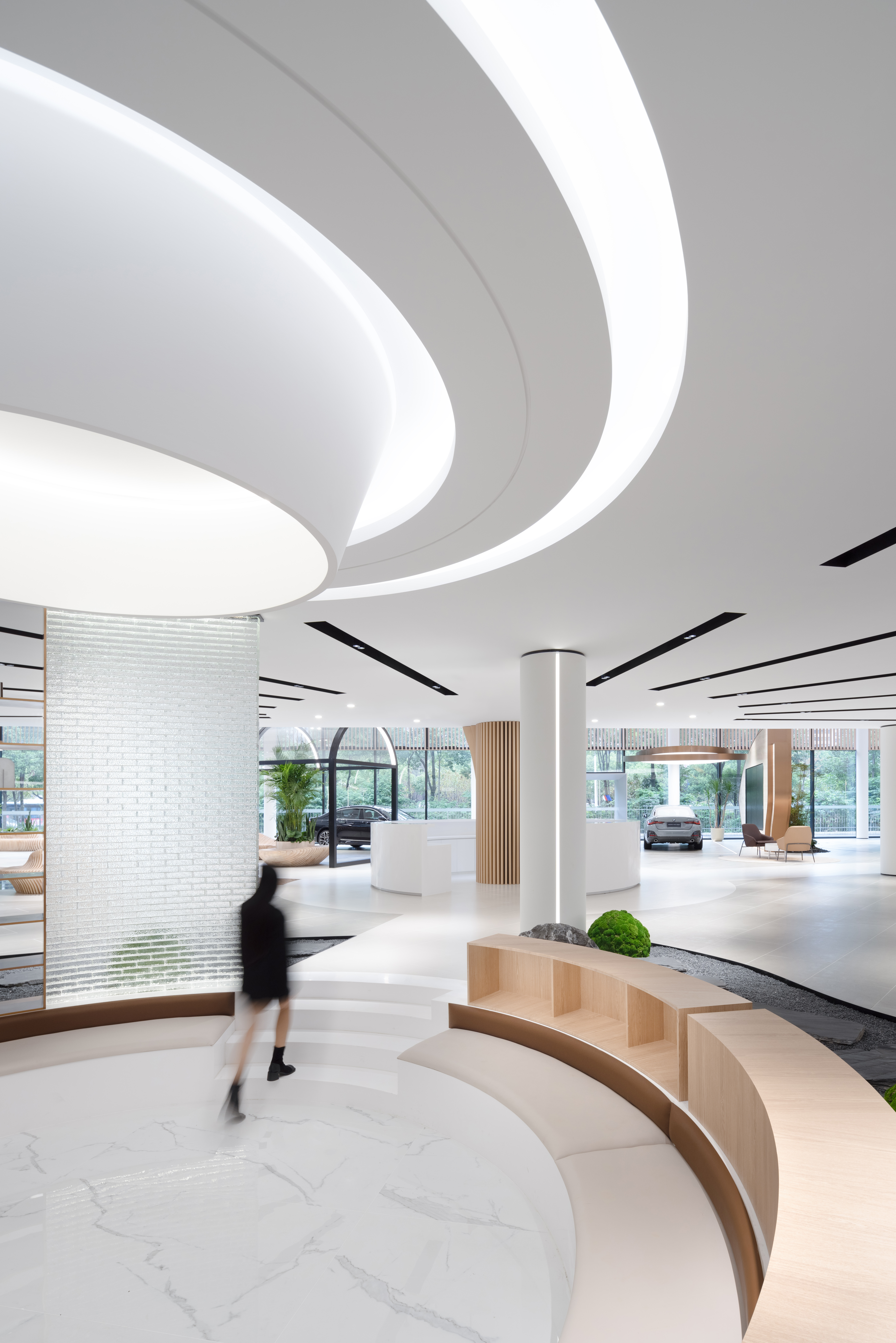 아키호프는 중국 장사시의 BMW 전시관에 마치 게임 속 도시를 걷는 듯한 경험을 불어넣었다. 현대 도시 계획 개념에서 아이디어를 얻어 중심부에서 방사형 형태로 뻗어 나가는 디자인을 적용했다. 지속 가능한 발전을 이룩한 완전한 도시 생태계를 테마로, 다양한 로드뷰와 공공 공간을 조합해 미래 도시의 구체적인 모습을 이 프로젝트에 담고자 했다. 전시관의 중심부는 수공간과 포켓 정원, 북 바(Book bar) 등의 요소를 활용한 매력적인 공간이 되었으며, 모든 차종을 파노라마로 감상할 수 있는 원형 선큰 가든이 특징이다. 건축가는 지속 가능성을 염두하여 재활용한 나무 합판, 종이 튜브, 파티클 보드 및 각종 친환경 소재를 사용했다. 목재와 실내 정원을 적극적으로 활용하자 자연스럽고 부드러운 공간으로 완성됐다. 바닥부터 천장까지 이어지는 목재 선형 요소는 마치 나뭇가지처럼 보인다. 공간을 확장하는 반개방형 천장과 함께, 전시관은 멈춰 있는 장소가 아니라 생명체처럼 성장하는 공간이 된다