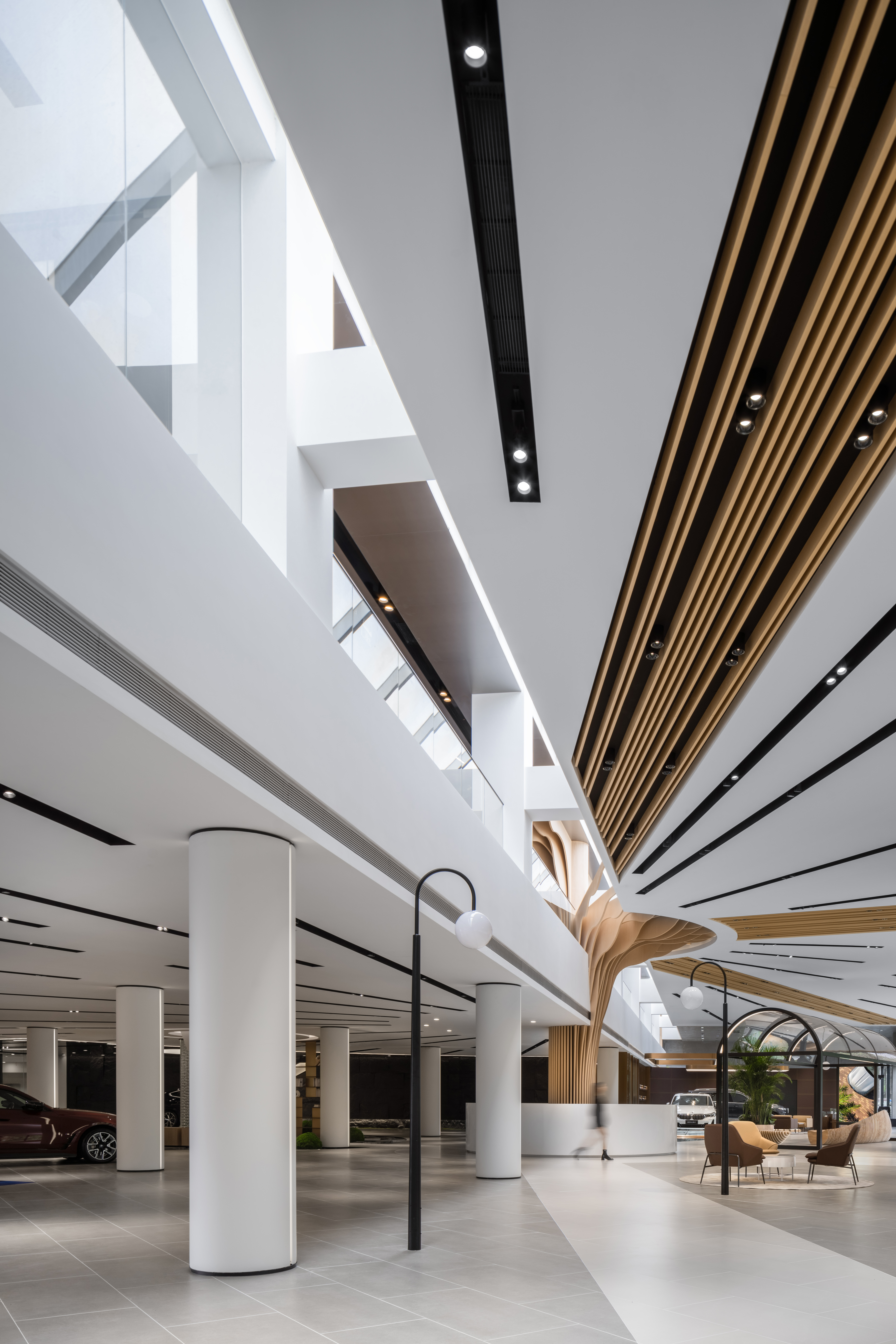 아키호프는 중국 장사시의 BMW 전시관에 마치 게임 속 도시를 걷는 듯한 경험을 불어넣었다. 현대 도시 계획 개념에서 아이디어를 얻어 중심부에서 방사형 형태로 뻗어 나가는 디자인을 적용했다. 지속 가능한 발전을 이룩한 완전한 도시 생태계를 테마로, 다양한 로드뷰와 공공 공간을 조합해 미래 도시의 구체적인 모습을 이 프로젝트에 담고자 했다. 전시관의 중심부는 수공간과 포켓 정원, 북 바(Book bar) 등의 요소를 활용한 매력적인 공간이 되었으며, 모든 차종을 파노라마로 감상할 수 있는 원형 선큰 가든이 특징이다. 건축가는 지속 가능성을 염두하여 재활용한 나무 합판, 종이 튜브, 파티클 보드 및 각종 친환경 소재를 사용했다. 목재와 실내 정원을 적극적으로 활용하자 자연스럽고 부드러운 공간으로 완성됐다. 바닥부터 천장까지 이어지는 목재 선형 요소는 마치 나뭇가지처럼 보인다. 공간을 확장하는 반개방형 천장과 함께, 전시관은 멈춰 있는 장소가 아니라 생명체처럼 성장하는 공간이 된다