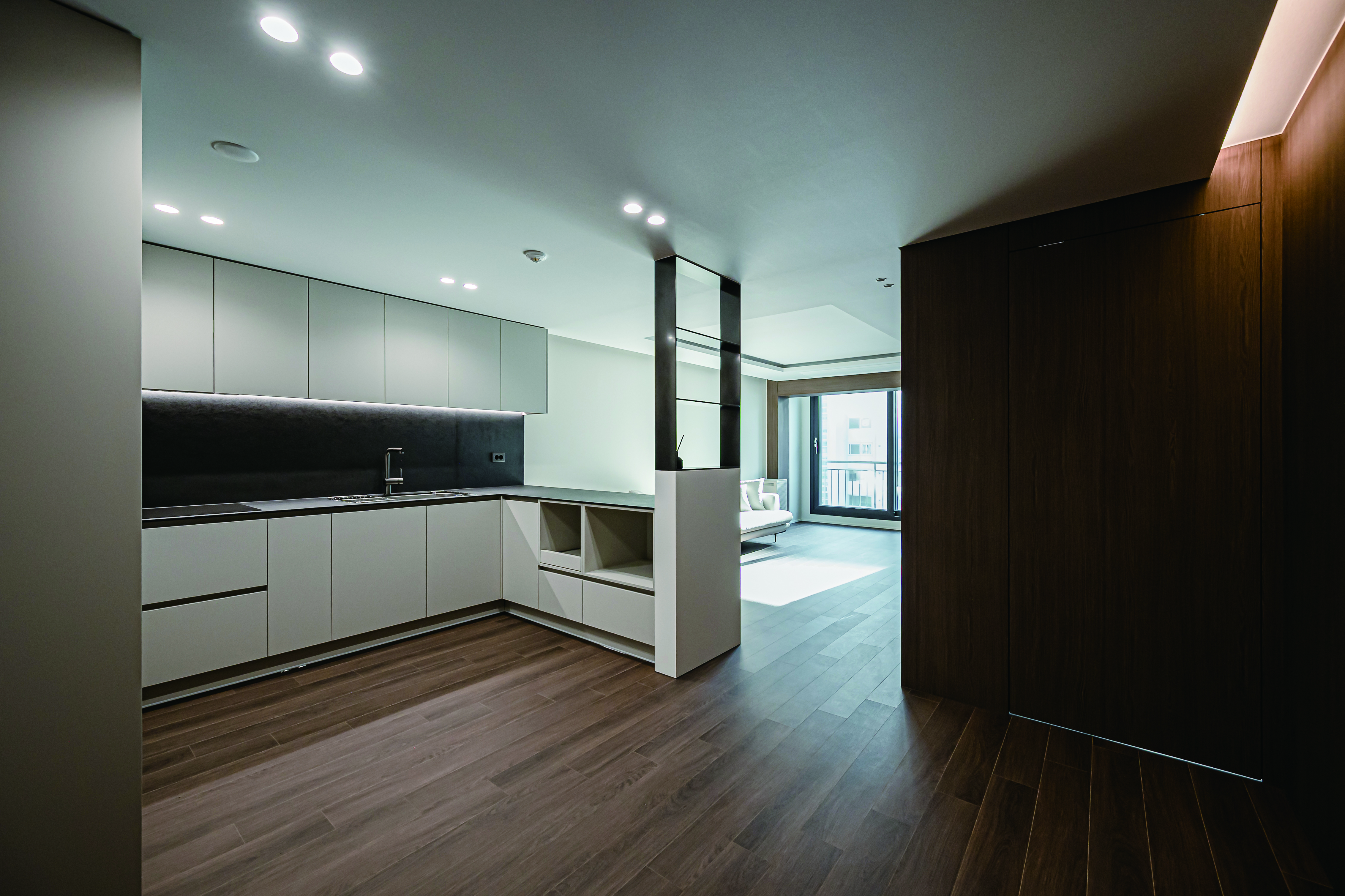 집에서 많은 시간을 보내는 거주자의 성향을 고려해 일상에서 여유를 즐길 수 있는 프리미엄 호텔 분위기의 공간을 연출했다. 짙은 우드 톤에 대비감을 주는 크림 톤 컬러를 조화롭게 매치하여 모던함과 안락함이 함께 느껴진다. 무몰딩 마감으로 공간에 확장감을 부여하고, 직부등보다는 간접 조명을 활용해 눈의 피로도를 덜었다.