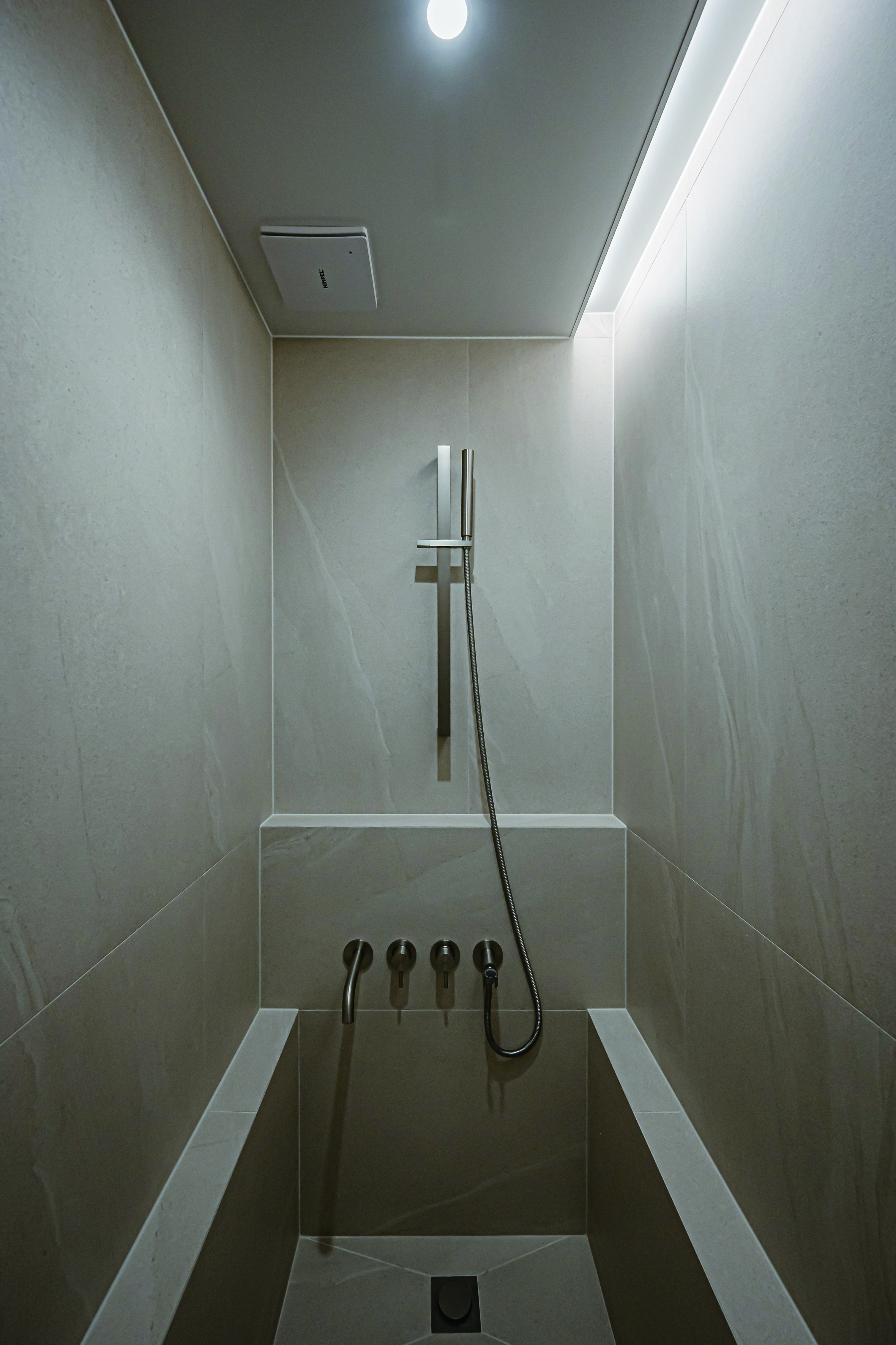 욕실은 조적식 세면대와 욕조, 매립형 수전을 설치하여 럭셔리하고 힘이 있는 분위기를 자아낸다. 간결함이 특징인 라우체 코인시리즈 매립 수전은 조절부와 토수구를 제외한 구조물이 벽 안으로 매립되어 위생에 좋은 점이 특징이다. 더불어 단정한 디자인과 차분한 컬러감으로 욕실의 미감을 더욱 극대화한다.