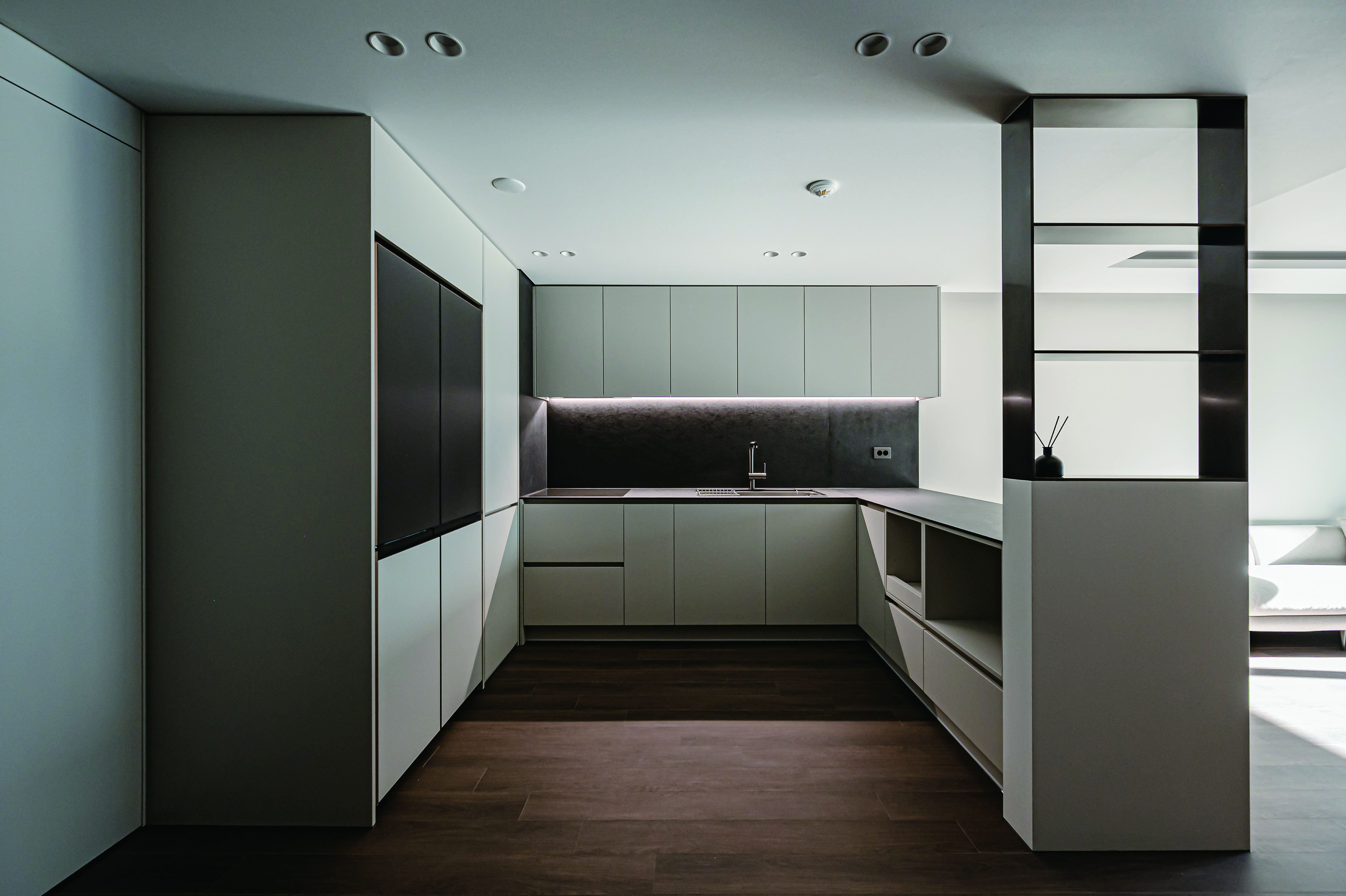 주방은 독립적인 공간으로 인식할 수 있으면서, 거실과 이질감이 느껴지지 않게 소통이 자유로운 대면형으로 배치했다. 슬림한 'L' 자 바디라인의 코인 싱크 수전은 어떤 콘셉트와도 잘 어우러지며 주방에 균형미를 더한다. 안방은 거주자의 로망이었던 평상 침대를 구현하고 간살 파티션을 설치했다. 이로 인해 안방 공간에 포인트를 주는 동시에 수면 공간과 활동 공간을 분리할 수 있다.