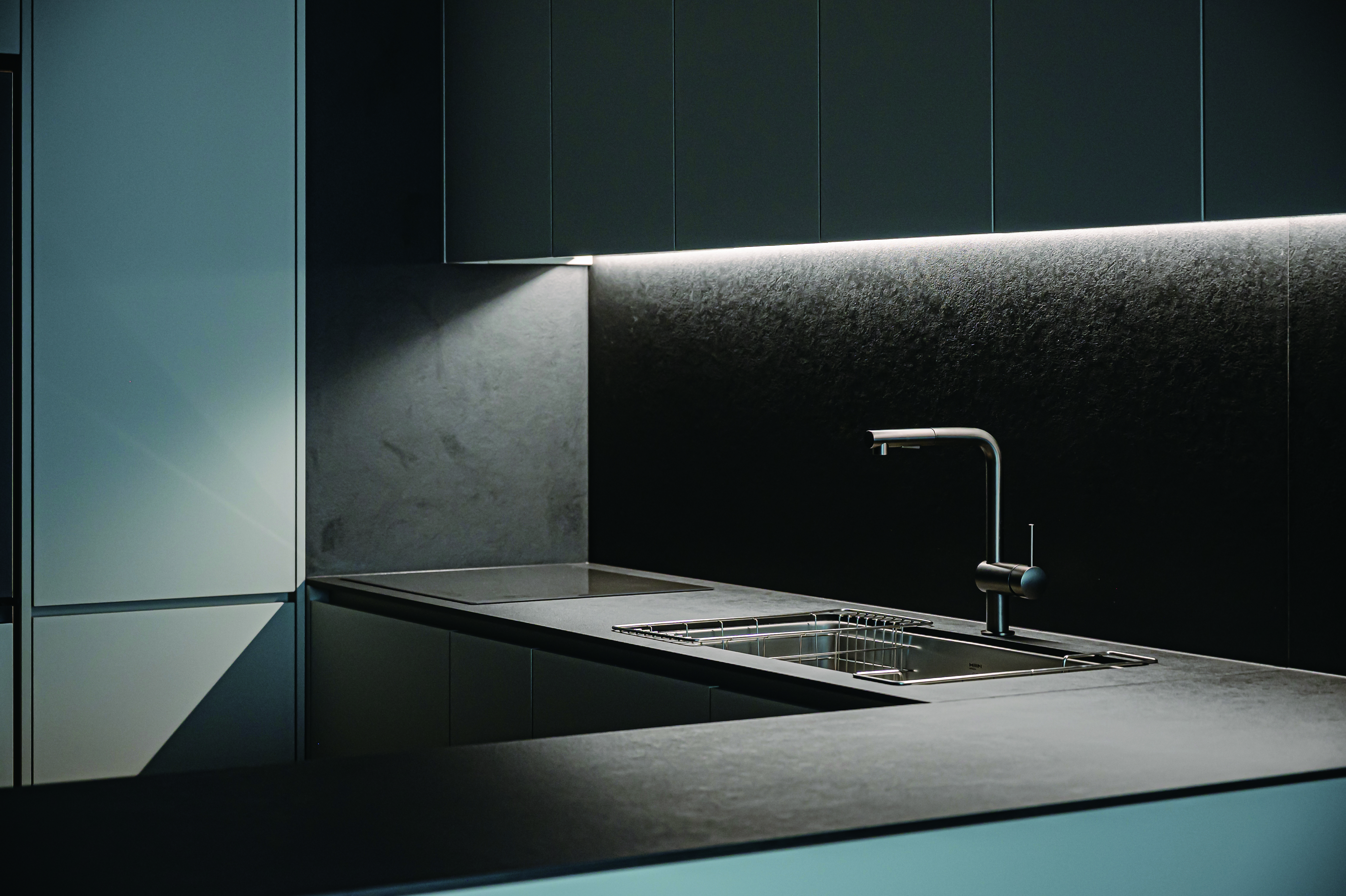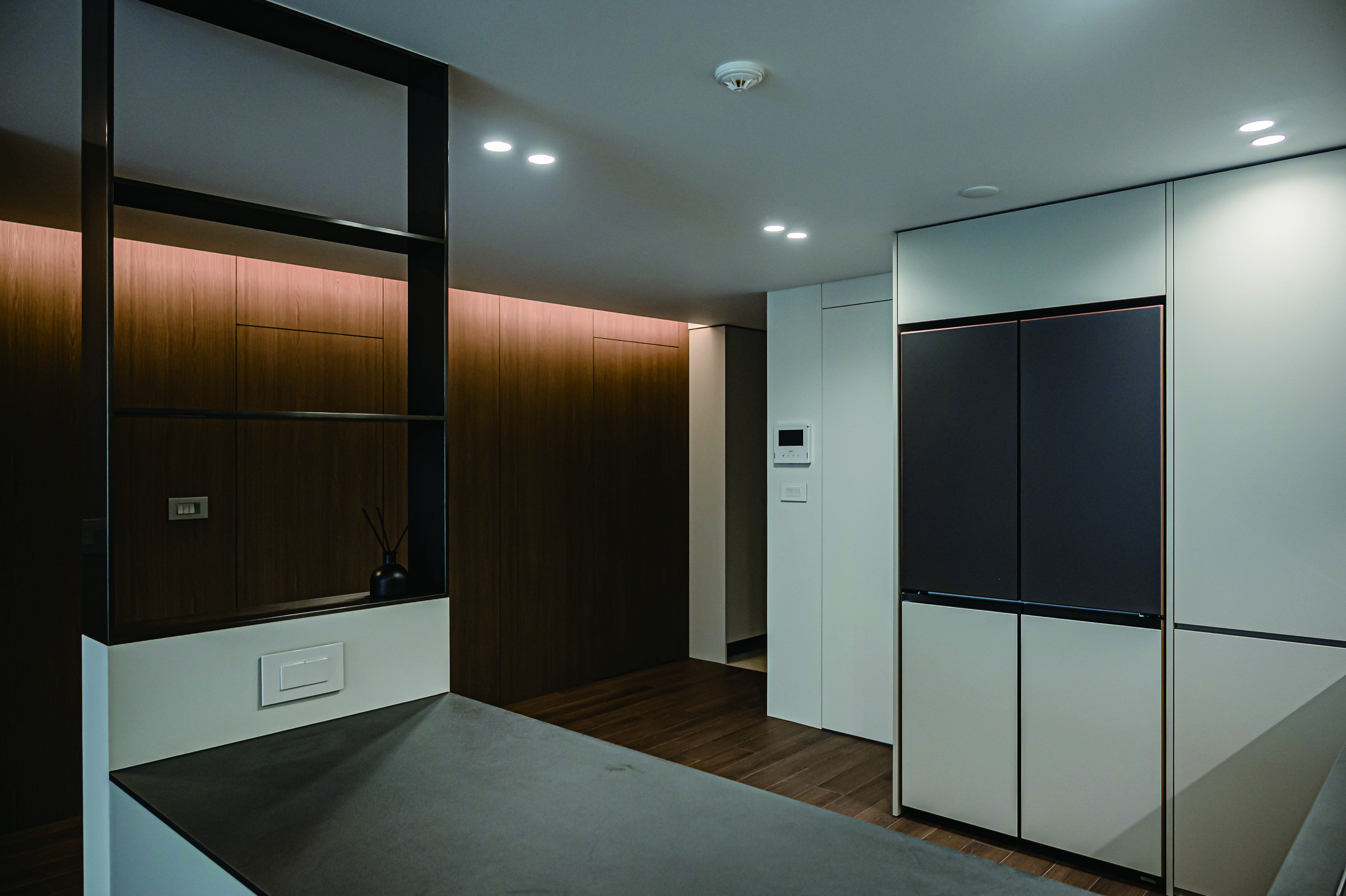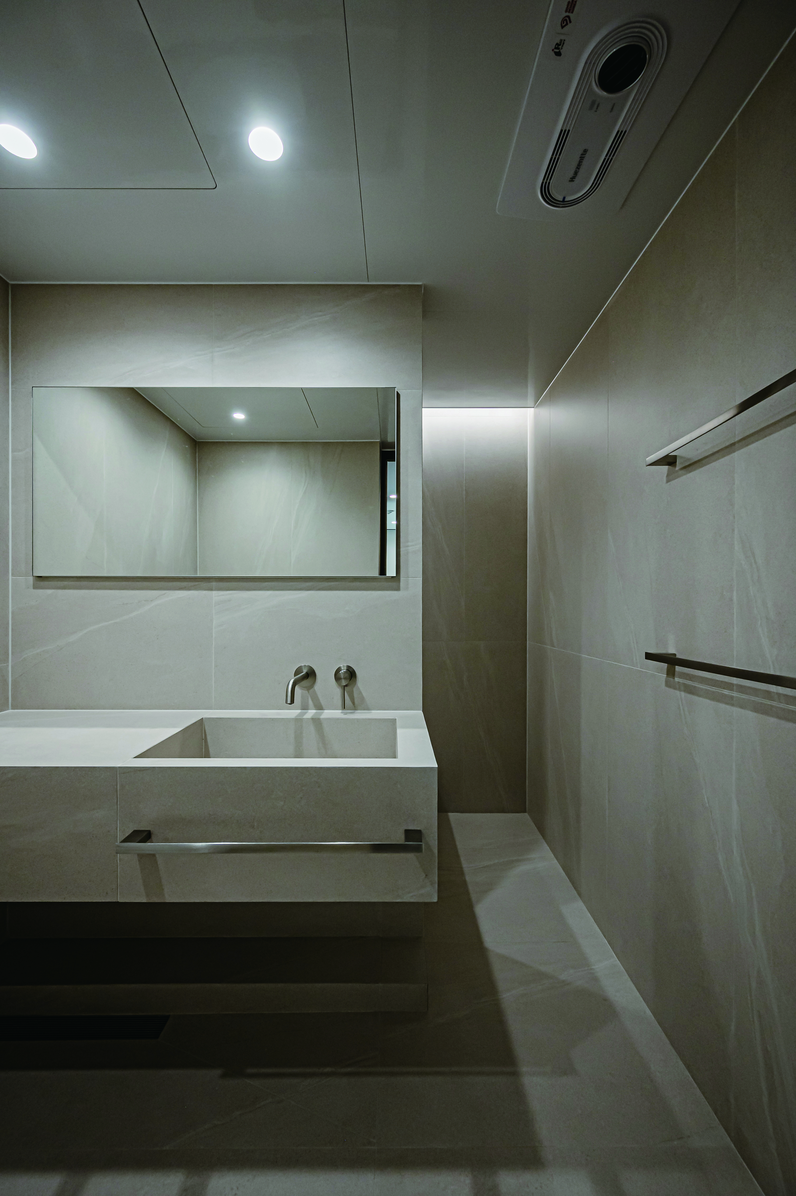 욕실은 조적식 세면대와 욕조, 매립형 수전을 설치하여 럭셔리하고 힘이 있는 분위기를 자아낸다. 간결함이 특징인 라우체 코인시리즈 매립 수전은 조절부와 토수구를 제외한 구조물이 벽 안으로 매립되어 위생에 좋은 점이 특징이다. 더불어 단정한 디자인과 차분한 컬러감으로 욕실의 미감을 더욱 극대화한다.