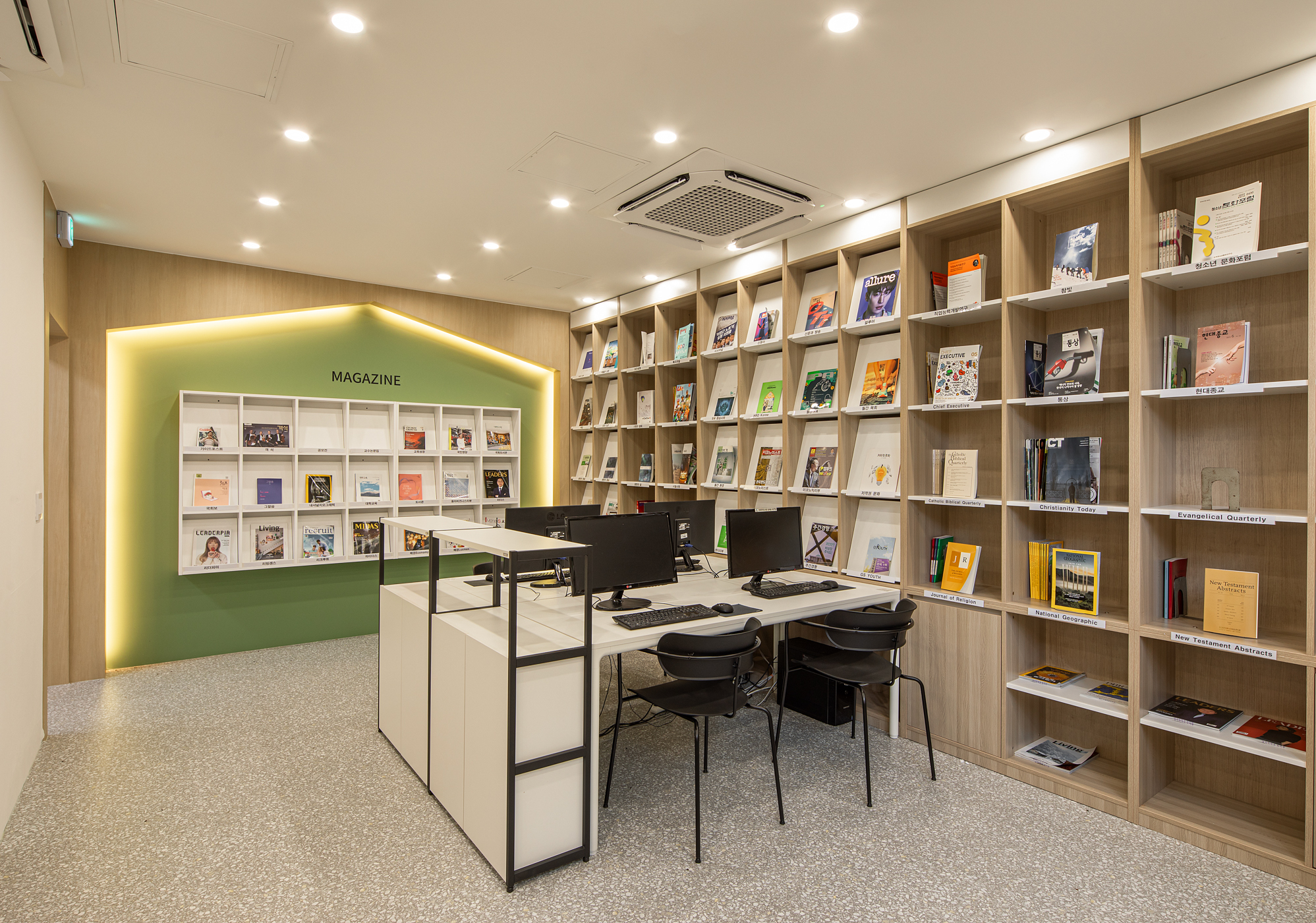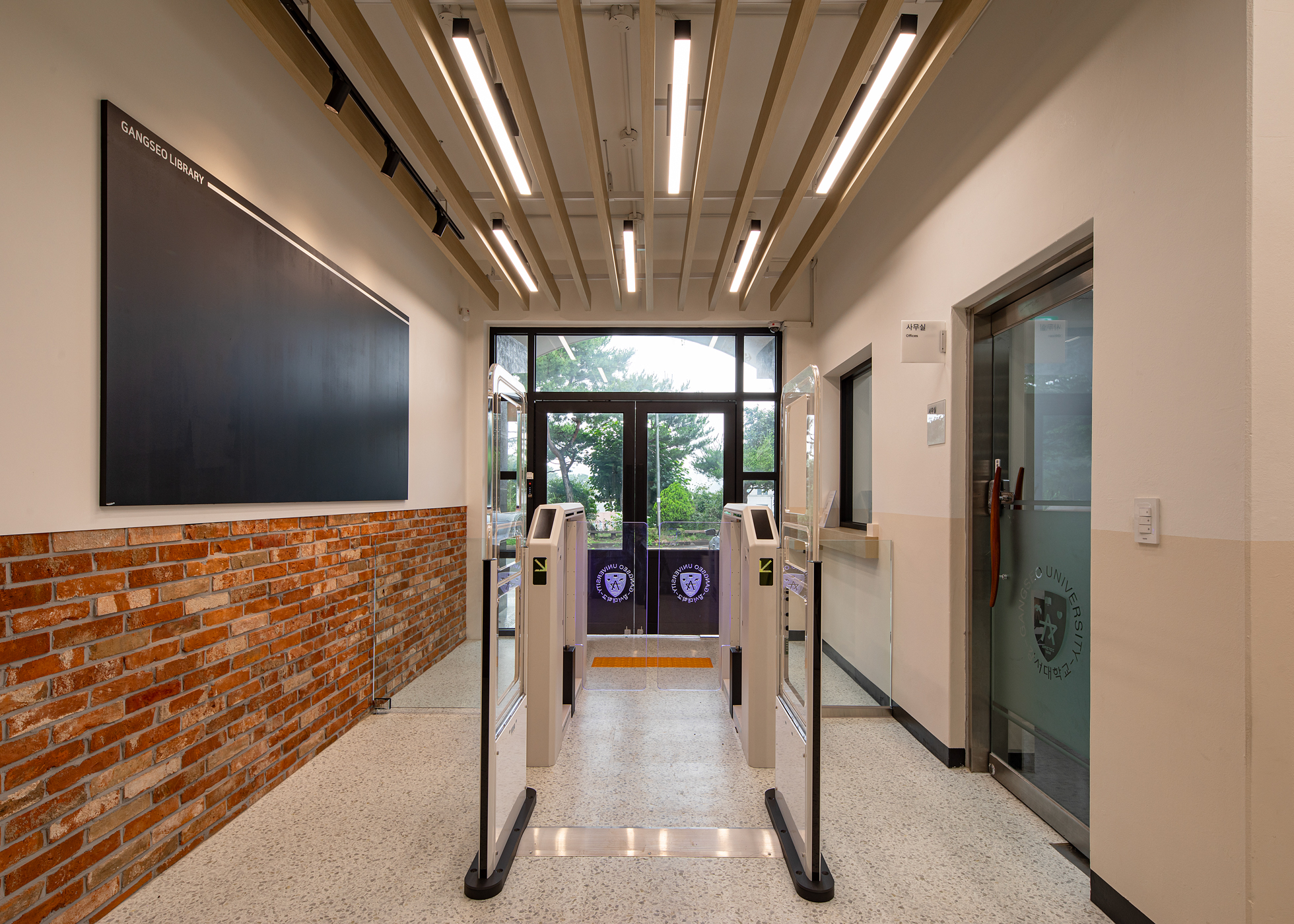 강서대학교는 60년 동안 기독교 정신을 바탕으로 한 학생 중심의 교육 이념을 실천해 오고 있다. 채셔관(도서관)은 세월의 흔적이 느껴지는 붉은 벽돌이 고전적인 분위기를 자아내며 오랜 역사와 전통을 말해 주고 있다. 현대의 도서관은 기존의 단순히 책만 읽는 공간이 아니라 새로운 아이디어와 영감을 얻을 수 있는 공간이다. 이에 따라 다양한 활동이 가능한 공간의 변화가 필요하다. 건축가는 여행을 가듯 설레는 마음으로 도서관에 방문할 수 있도록 여행(Travel)과 도서관(Library)의 합성어인 ‘트레브러리(Travelary)’의 콘셉트로 계획했다. 사용자는 아름다운 교정의 풍경을 바라보며 책을 읽고, 휴식을 취할 수 있다. 이러한 콘셉트에 맞는 플랜테리어는 심리적 안정을 줄 수 있는 요소이다. 본관에는 ‘새로움을 한 겹 더한다’는 콘셉트의 ‘레이어드 스페이스(Layered Space)’의 복합 문화 공간을 기획했다. 건물 외벽의 고전적인 분위기가 내부로 연결되고, 자연스러운 그린 톤과 차분한 우드 톤을 활용하여 안정적이고 편안한 내부 공간을 연출했다. 각 공간에는 체계적이고 전문적인 조도 계획으로 공간의 활용도를 고려하며 기능적인 측면을 더하였다.