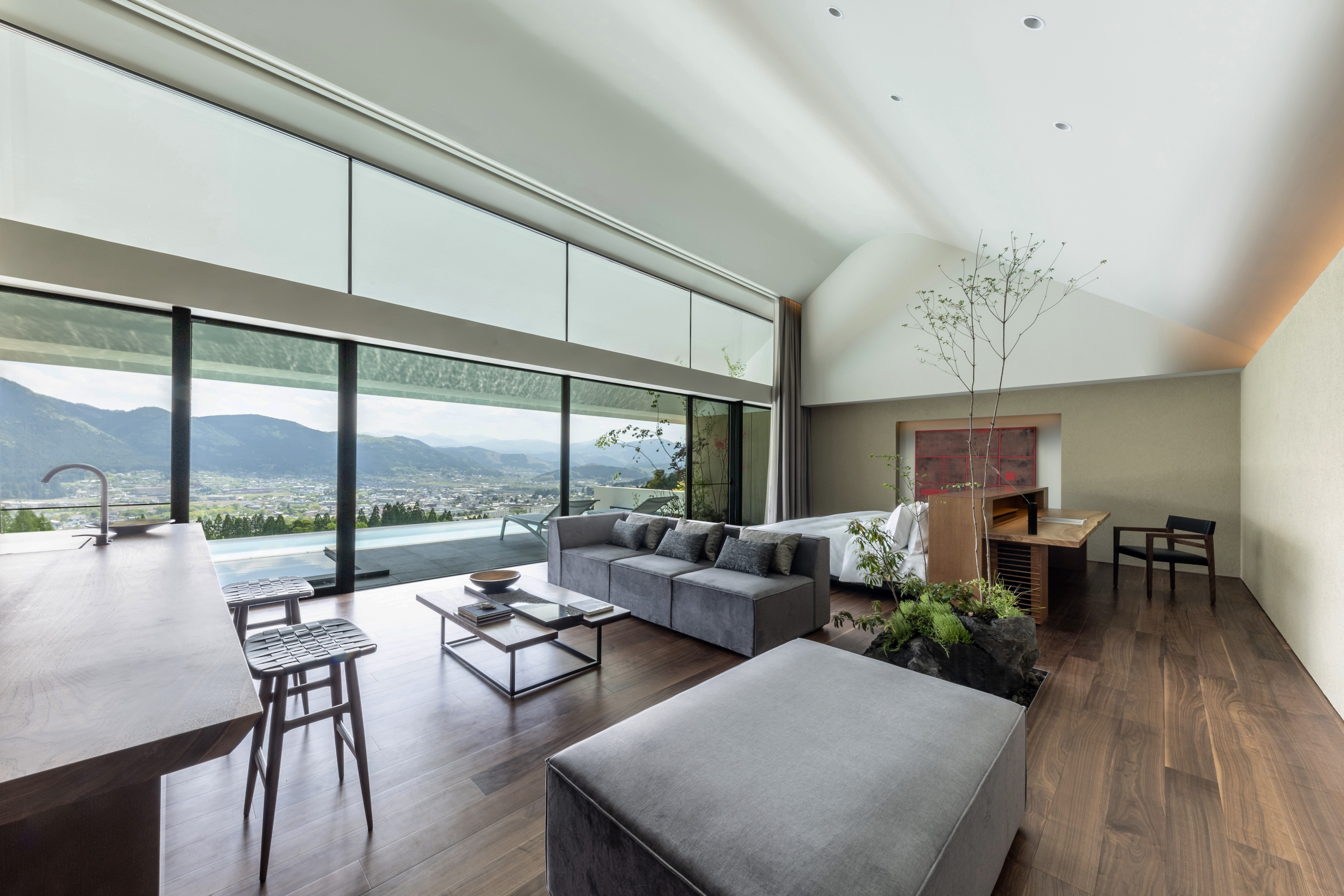 에노와 유후인은 그림 같은 풍경을 자랑하는 온천 거리의 언덕에 자리 잡은 고급 리조트다. 건축가는 동쪽으로는 유후산을, 남쪽으로는 유후시의 마을을 내려다보는 대지에 녹음이 우거진 은신처 같은 숙박시설을 계획했다. 대지는 40m에 달하는 등고 차가 특징이며, 건축가는 이를 고려하여 여러 시설을 배치했다. 10채의 독채 빌라, 레스토랑, 프라이빗 다이닝 공간, 9개의 게스트룸이 있는 호텔은 기존의 지형 위에 자연스럽게 펼쳐져 있다. 게스트룸은 목재와 석재 등 자연적이고 따뜻한 느낌이 나는 재료를 사용한 심플하고 고급스러운 공간이다. 독채 빌라는 리조트의 중심 공간으로, 큰 창문과 테라스로 주변 환경과 잘 어우러지게 계획했다. 또한 각각 인피니티 풀과 야외 온천이 있어 자연을 한껏 만끽할 수 있다. 요즘은 기술의 발전으로 직접 어떤 공간에 가지 않고서도 다양한 경험을 할 수 있지만, 건축가는 자연 속에서 시간의 흐름을 느낄 수 있는 에노와 유후인을 통해 자연과 인간을 잇는 경험을 주고자 했다.