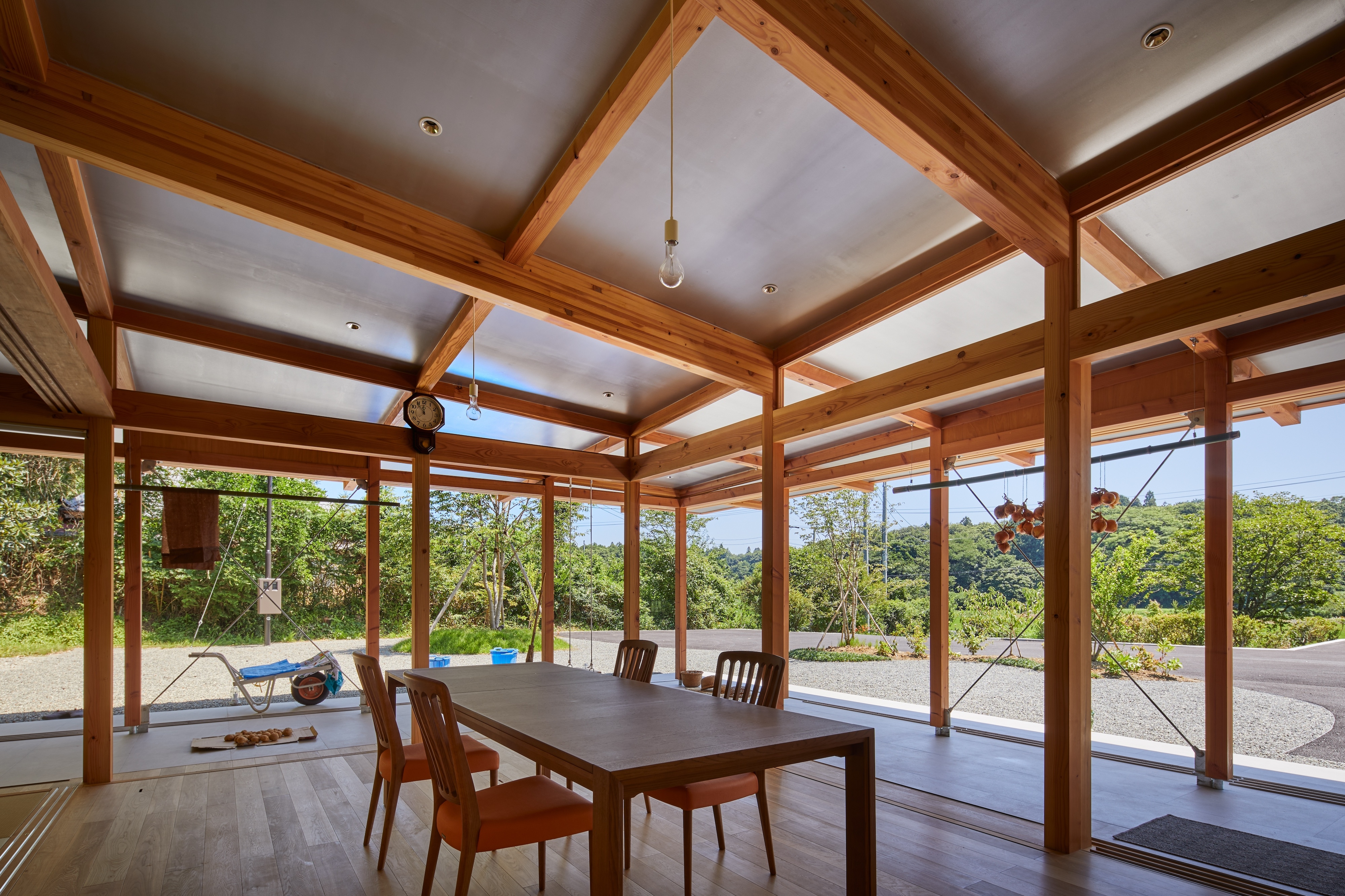 마운틴풋 베이스는 산 초입에 있는 주말 별장으로 고령화로 인해 인구가 줄어든 마을의 커뮤니티 공간이다. 친척, 친구 그리고 이웃과의 만남의 장소이자 행사를 진행하는 공간이 되기도 한다. 곡선 지붕은 산의 능선을 자연스럽게 닮았으며 반사가 되는 자재로 마감된 천장은 주변의 풍경과 내부에서 일어나는 활동을 담아낸다. 두 종류의 미닫이문도 특징적이다. 건축물의 경계는 바깥의 경치를 투명하게 담아내는 유리 미닫이문과, 햇빛을 조절하는 목재 루버가 부착된 유리 미닫이문으로 정의된다. 뒤틀린 형태의 독특한 지붕은 지역의 장인이 사용하는 공법으로 제작됐다. 지붕의 곡선을 구현하기 위해 빔의 각도에 조금씩 변화를 주었다.