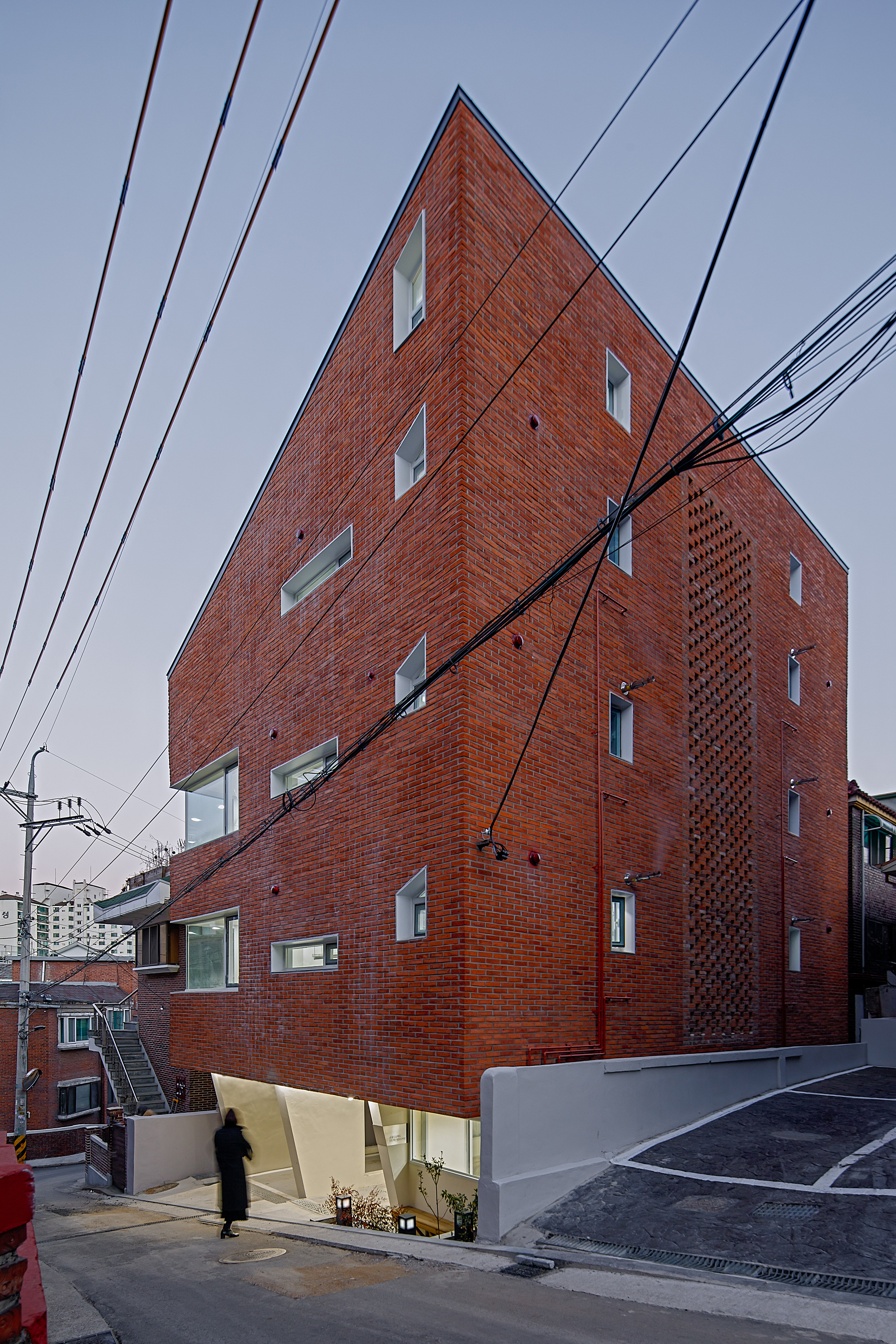 프로젝트가 위치한 대지는 북서 측의 4m 도로에 접하며, 인접한 세 면은 주택으로 둘러싸여 있어 충분한 일조와 전망을 기대하기는 어려웠다. 여기에 정해진 기준의 규모 내에서 여섯 가구의 평면 계획, 가구 간의 적절한 거리 유지, 느슨한 친밀감의 공유라는 개념을 실현해야 했다. 건축가는 이를 실현하기 위해 하늘 위로 열린, 깊은 마당을 가진 중정형의 필로티 건물을 구상했다. 건물의 외벽에는 주택가의 풍경에 부담 없이 스며들 수 있는 점토 벽돌을, 내부 중정은 공간의 크기와 개방감을 고려하여 백색의 스터코를 마감으로 사용했다.