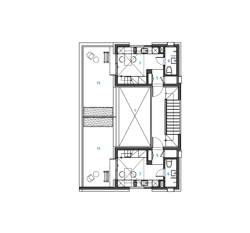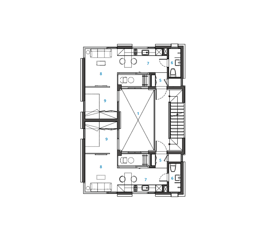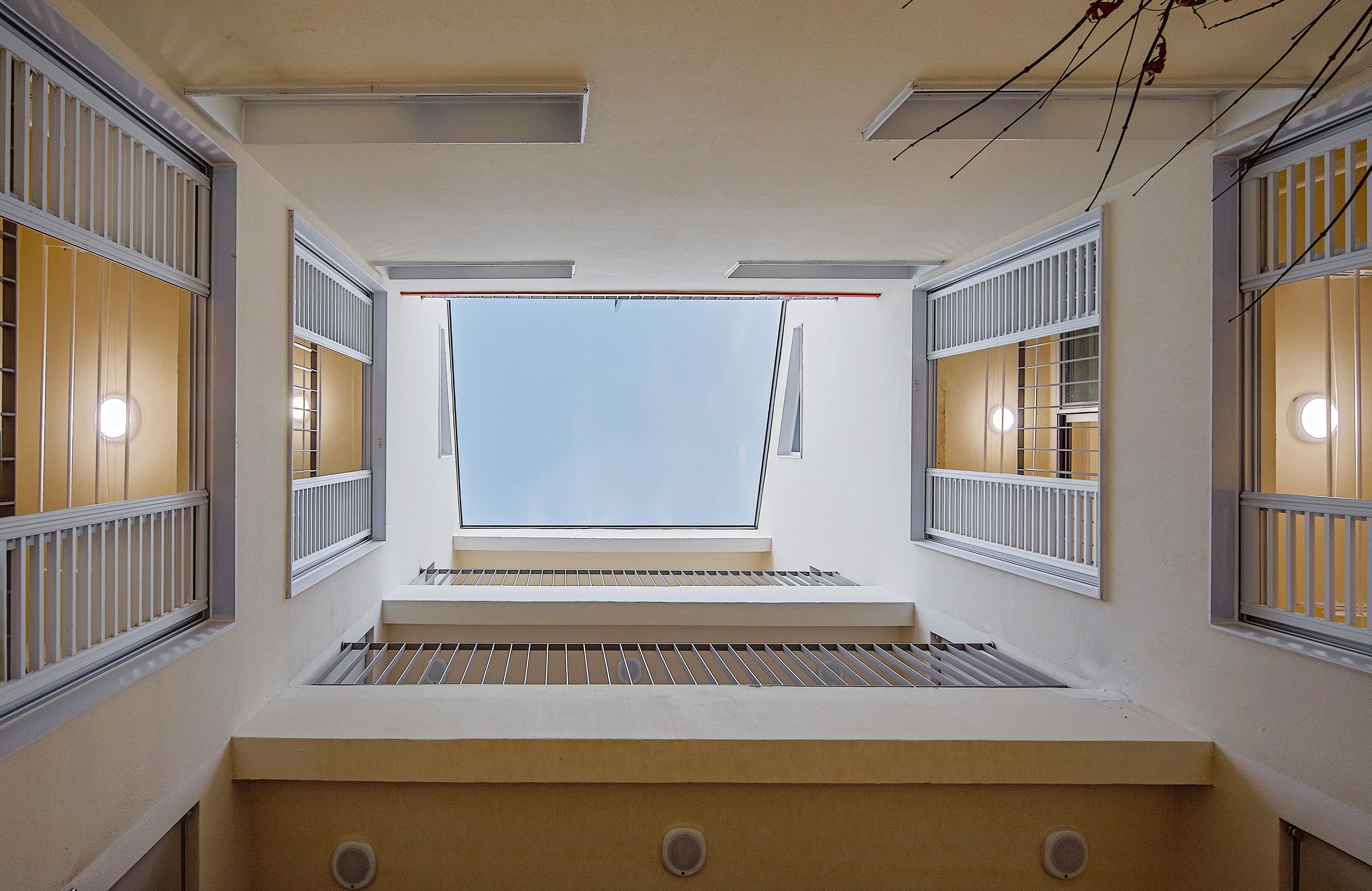 단위 가구는 각각 ‘ㄱ’ 자, ‘ㄴ’ 자 형의 평면을 가지며, 층마다 비워진 마당을 사이에 두고 적절한 거리를 유지하고 있다. 쾌적한 주거 생활을 위해서는 각각 공간의 기능별로 적절히 분리하고 서비스 공간을 확보해야 한다. ‘마당 깊은 집’은 단위 가구 사이에서 거실을 중심으로 주방과 침실을 각각 분리했다. 침실과 거실 사이를 나누는 유리 파티션은 개방감을 유지하면서 수면 공간을 물리적으로 분리하는 기능을 한다. 주방에 면한 중정의 발코니는 집 안에서도 외기를 접하며 휴식을 취할 기회를 만든다. 발코니에는 알루미늄 루버 덧창이 설치되어 창을 여닫는 정도에 따라 가구 간 직접적으로 시선이 마주치는 부담을 덜어 준다.