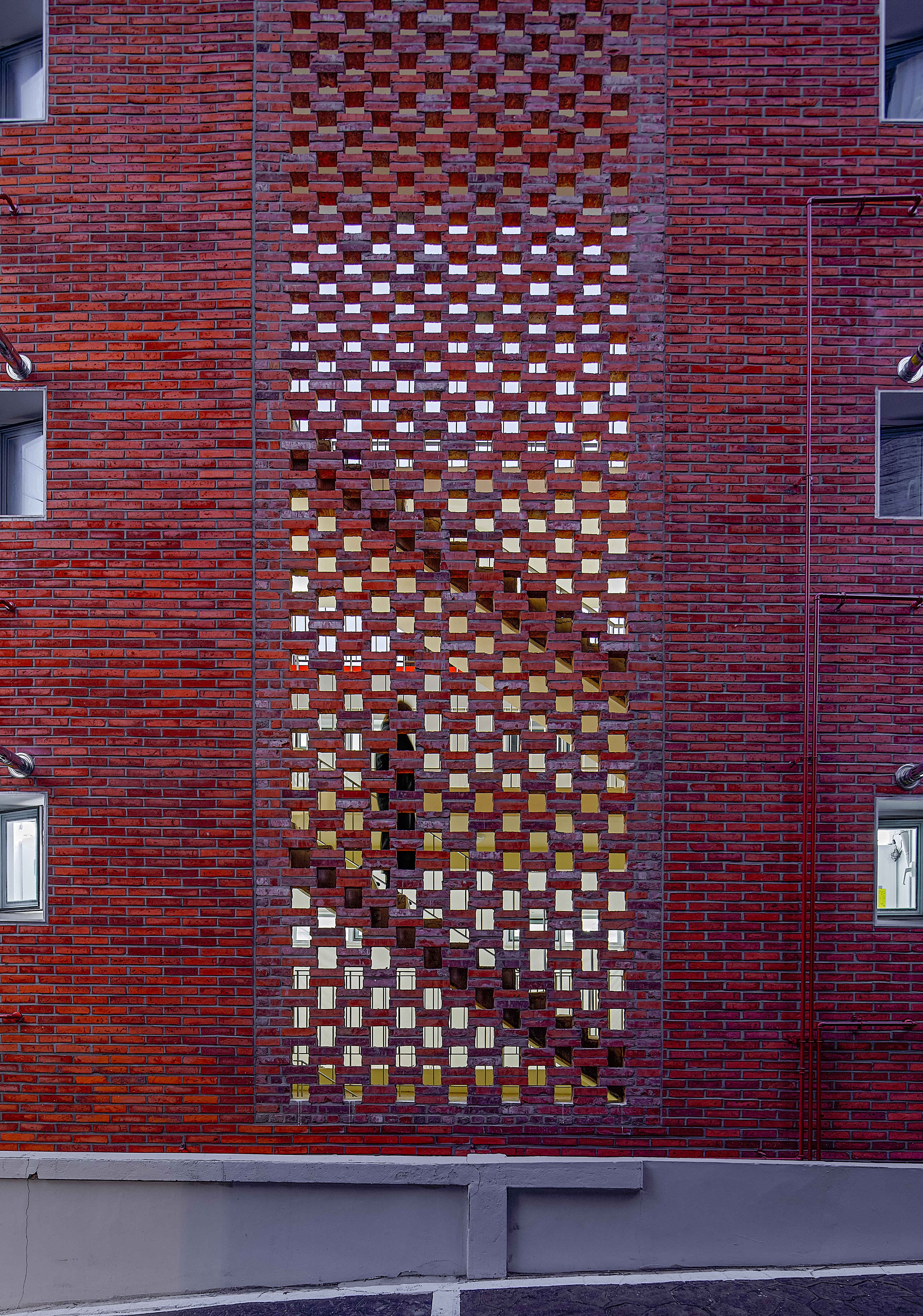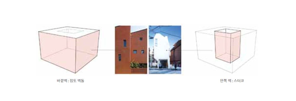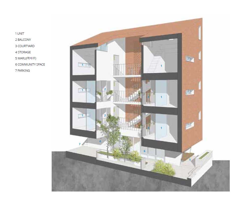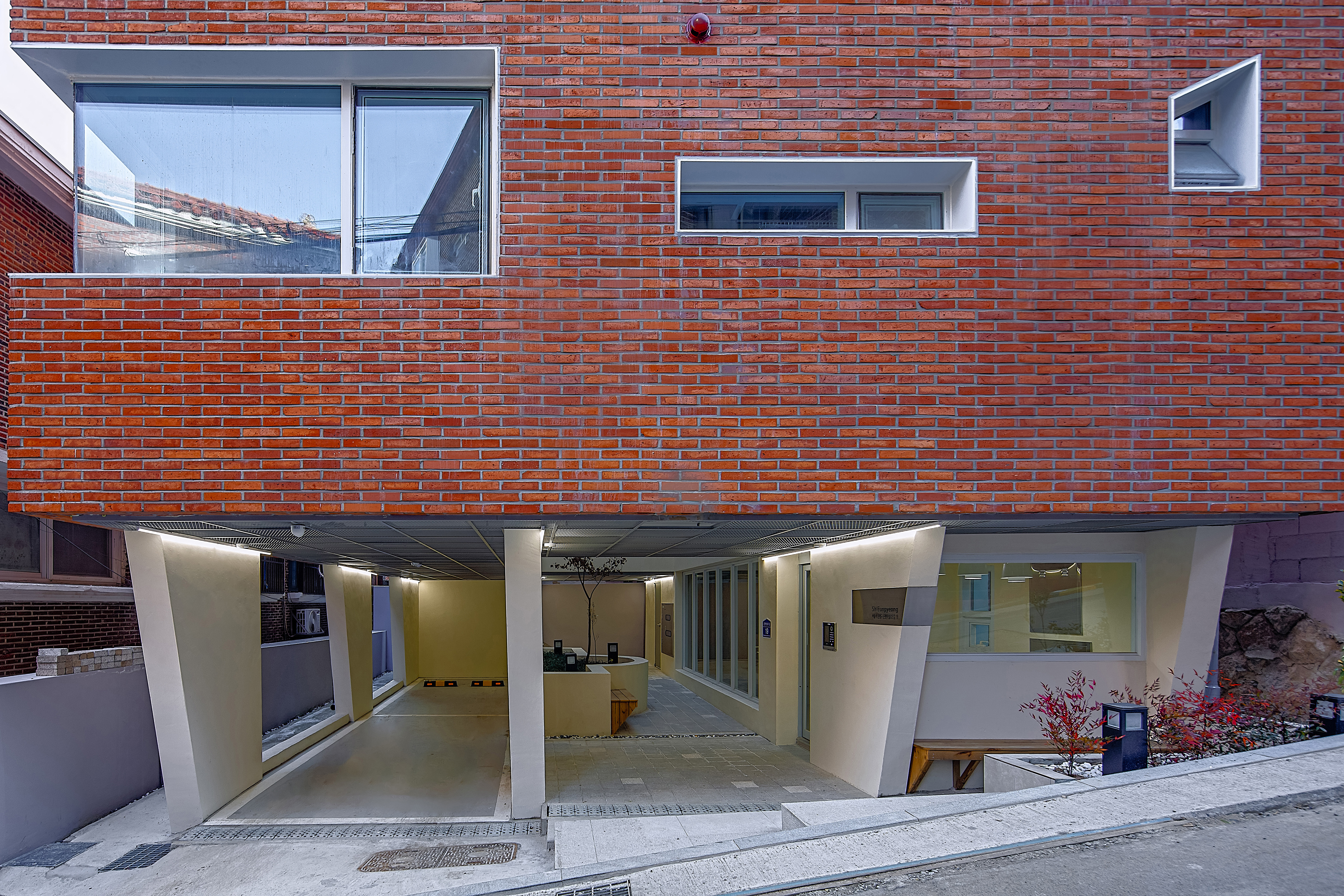 프로젝트가 위치한 대지는 북서 측의 4m 도로에 접하며, 인접한 세 면은 주택으로 둘러싸여 있어 충분한 일조와 전망을 기대하기는 어려웠다. 여기에 정해진 기준의 규모 내에서 여섯 가구의 평면 계획, 가구 간의 적절한 거리 유지, 느슨한 친밀감의 공유라는 개념을 실현해야 했다. 건축가는 이를 실현하기 위해 하늘 위로 열린, 깊은 마당을 가진 중정형의 필로티 건물을 구상했다. 건물의 외벽에는 주택가의 풍경에 부담 없이 스며들 수 있는 점토 벽돌을, 내부 중정은 공간의 크기와 개방감을 고려하여 백색의 스터코를 마감으로 사용했다.