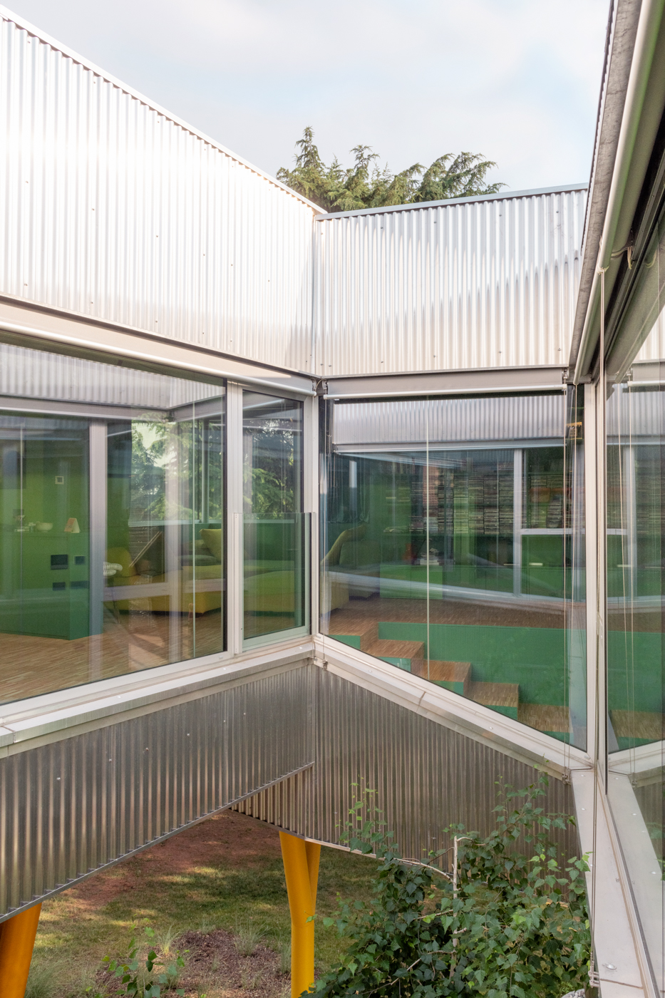 공원의 나무 사이에 직조되듯 위치한 ‘구멍이 난 집’은 금속의 계단과 파사드의 존재감을 뚜렷하게 형성한다. 주변의 초목이 건물에 스며들고, 주변 풍경이 건물을 감싸기도 하는 관계성은 시각적인 개방성을 유지하는 한편 내부의 공간을 바꾸기도 한다. 사용자는 출입구에서 녹음이 우거진 마당을 바라보고, 거실과 이어진 식당으로 향하며 자작나무가 보이는 창밖으로 시선을 확장하면서 내부와 외부의 변화를 느끼게 된다. 내부 벽은 다양한 톤의 녹색의 색조를 띠지만, 외부는 주름진 알루미늄 판재로 변화무쌍한 환경 및 왜곡과 추상을 동시에 만들어 낸다. 이를 통해 역동적인 디자인과 중정을 중심으로 한 안정과 균형이 조화를 이룬 건물로 재구성하였다.