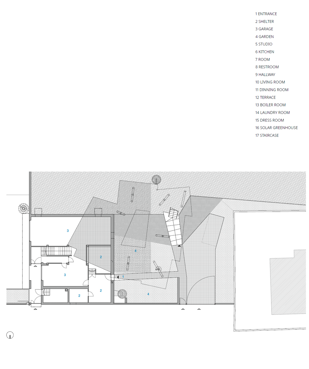 공원의 나무 사이에 직조되듯 위치한 ‘구멍이 난 집’은 금속의 계단과 파사드의 존재감을 뚜렷하게 형성한다. 주변의 초목이 건물에 스며들고, 주변 풍경이 건물을 감싸기도 하는 관계성은 시각적인 개방성을 유지하는 한편 내부의 공간을 바꾸기도 한다. 사용자는 출입구에서 녹음이 우거진 마당을 바라보고, 거실과 이어진 식당으로 향하며 자작나무가 보이는 창밖으로 시선을 확장하면서 내부와 외부의 변화를 느끼게 된다. 내부 벽은 다양한 톤의 녹색의 색조를 띠지만, 외부는 주름진 알루미늄 판재로 변화무쌍한 환경 및 왜곡과 추상을 동시에 만들어 낸다. 이를 통해 역동적인 디자인과 중정을 중심으로 한 안정과 균형이 조화를 이룬 건물로 재구성하였다.