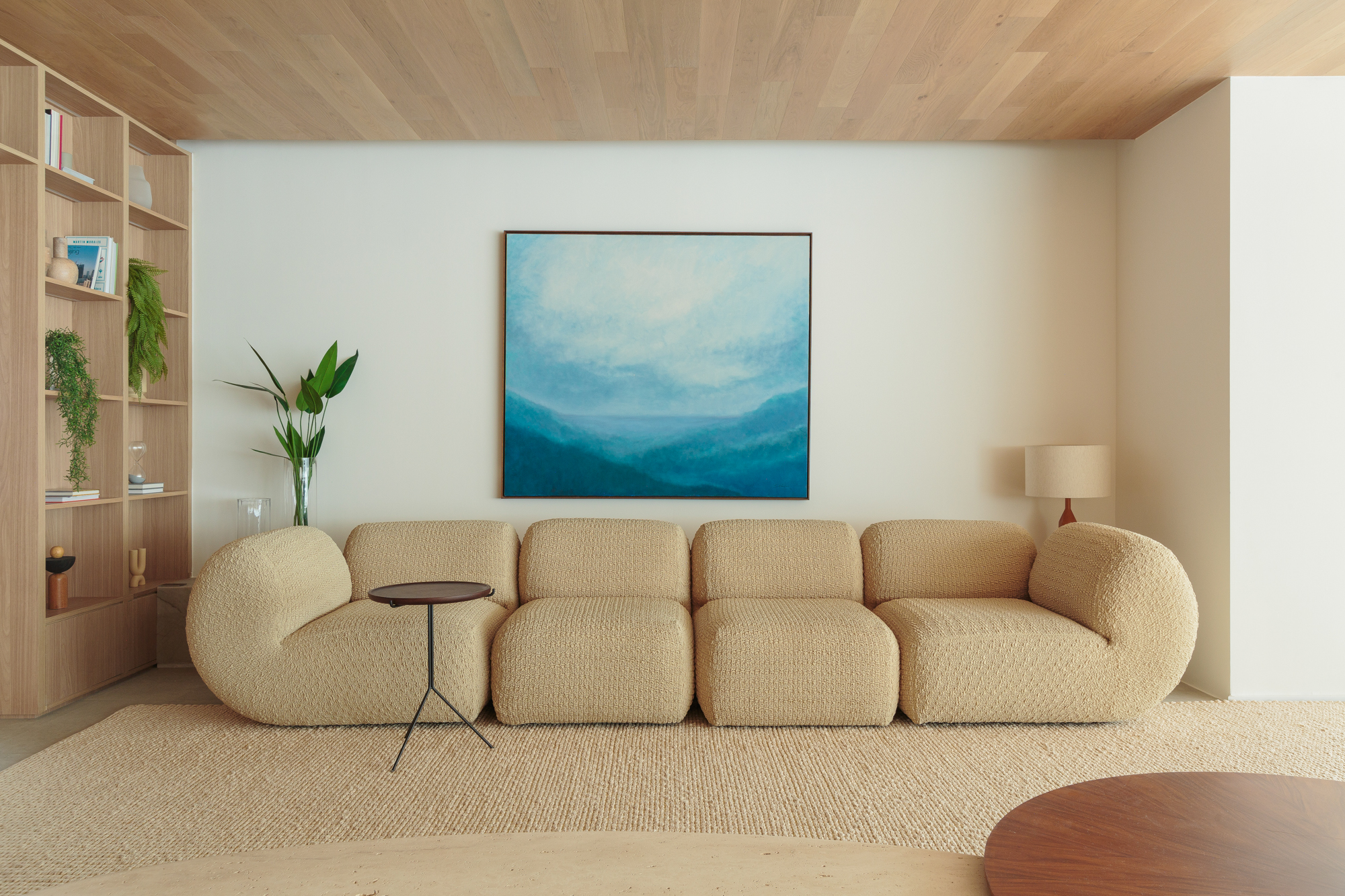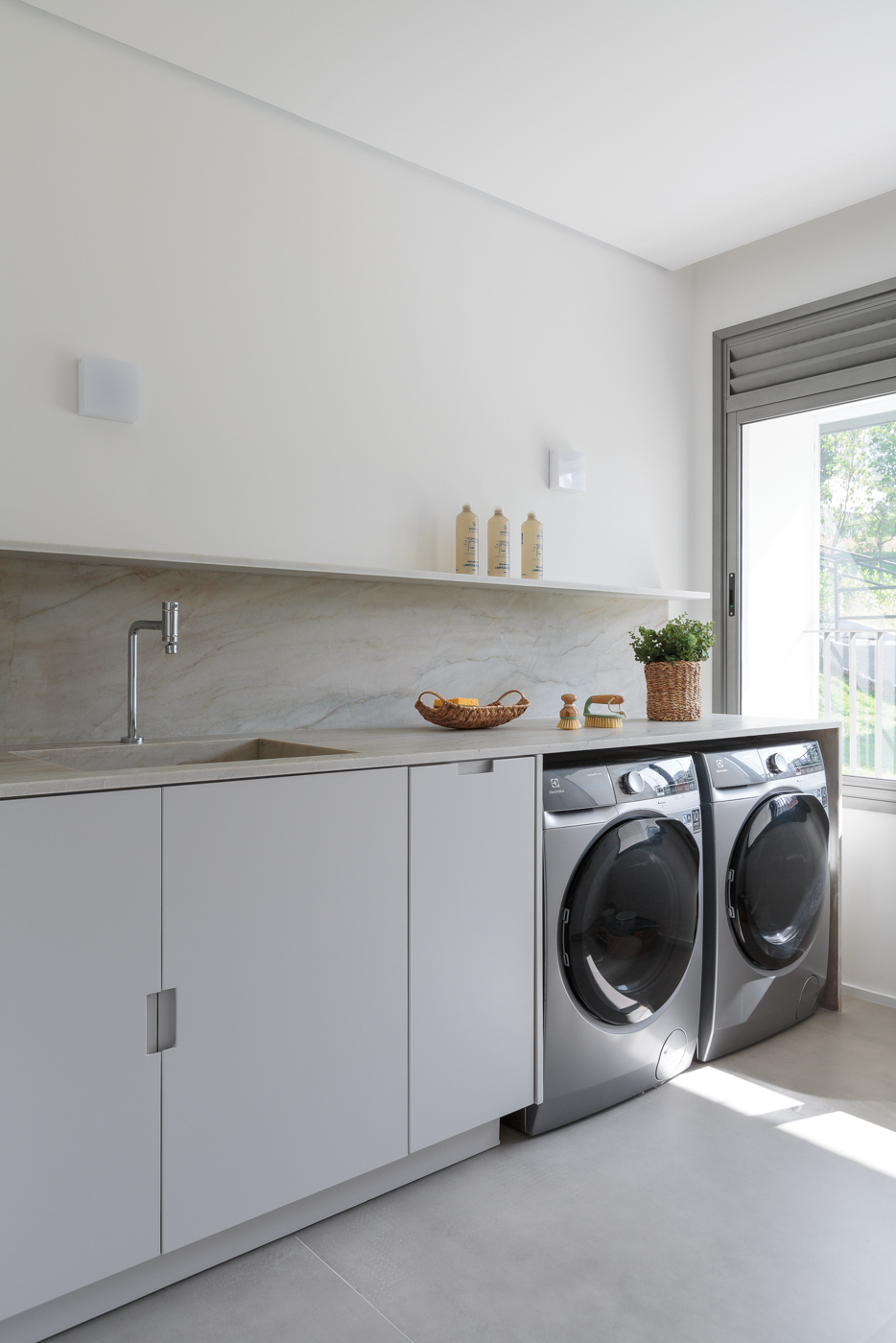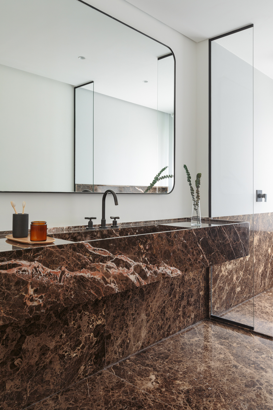 The social area prioritizes the integration of spaces and uses, as it is distributed as a single large space, where the kitchen can be closed or opened in order to create different moments. In addition to the view, the major protagonist is the bookcase that outlines the entire perimeter of the room, ensuring visual continuity. The balcony is integrated into the living room, serving as a gourmet space where family events can take place. Equipped with a barbecue and an island, this space also connects with the living and dining areas. In addition, a large counter is placed in the division between the kitchen and the living room, with the possibility of closing it through doors, thus creating an environment with more privacy and organization. The living room is even more spacious and has plenty of comfortable seating for meetings with friends, as well as a wine cellar displaying the couple's wine collection. Next to the living room – and as if it were inside the bookcase – there is the home theater, where it is possible to have private and cozy cinema sessions. Both in this environment and throughout the rest of the apartment, there was a precise curatorial work of furniture and design for the composition of spaces.