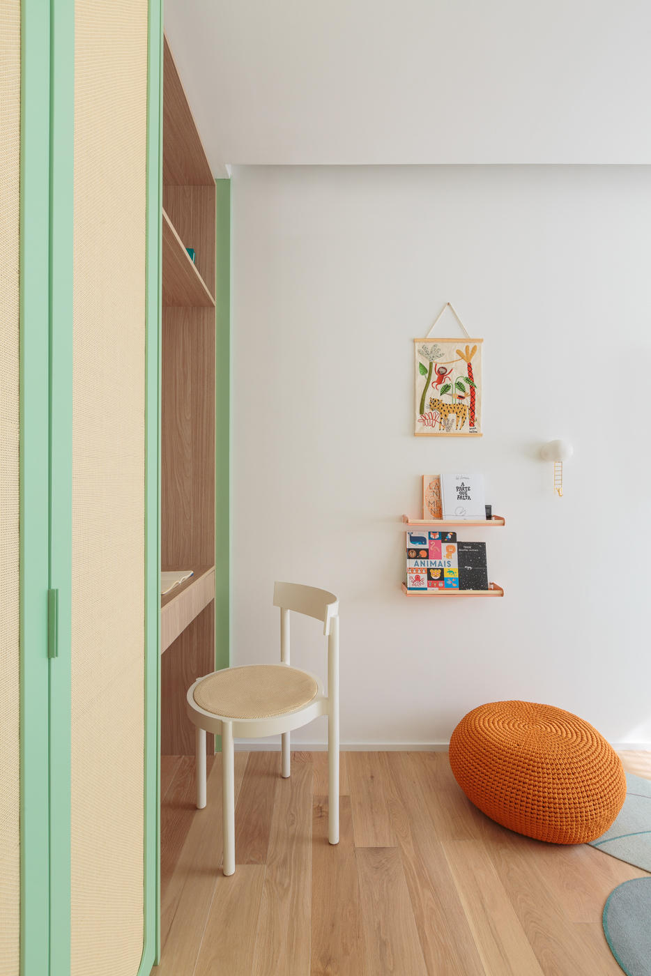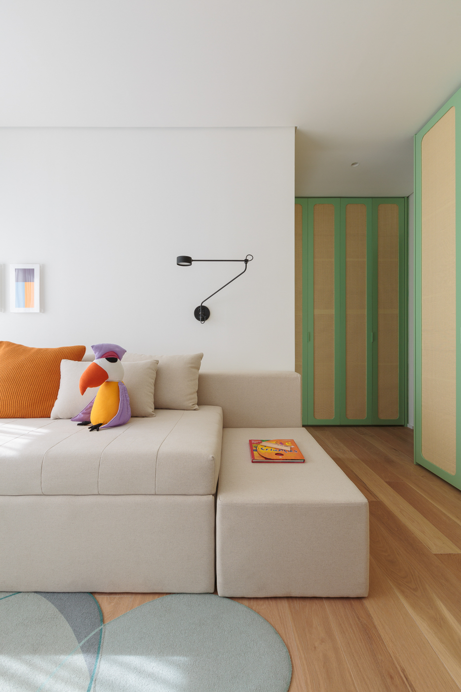 Suite 02: Suite 02 was designed for a small kid, with a more colorful atmosphere, and straw-enclosed cabinets that bring warmth and coziness to the space, in addition to helping to ventilate the stored items. Built into the volumetry of the closet, there is also a support desk for studies and school work, as well as a bed in front of the TV that looks like a sofa and counts with lots of pillows. The bathroom is also clad in Carrara Venatino marble along with blue ceramic.